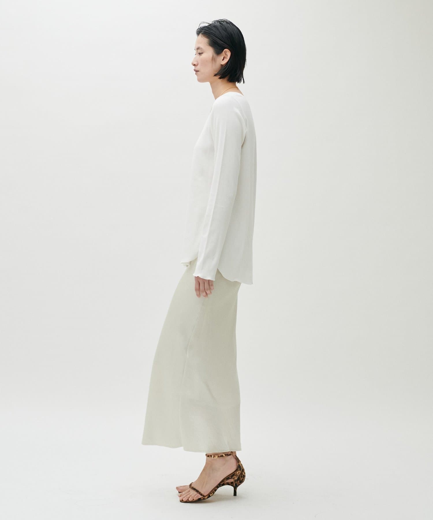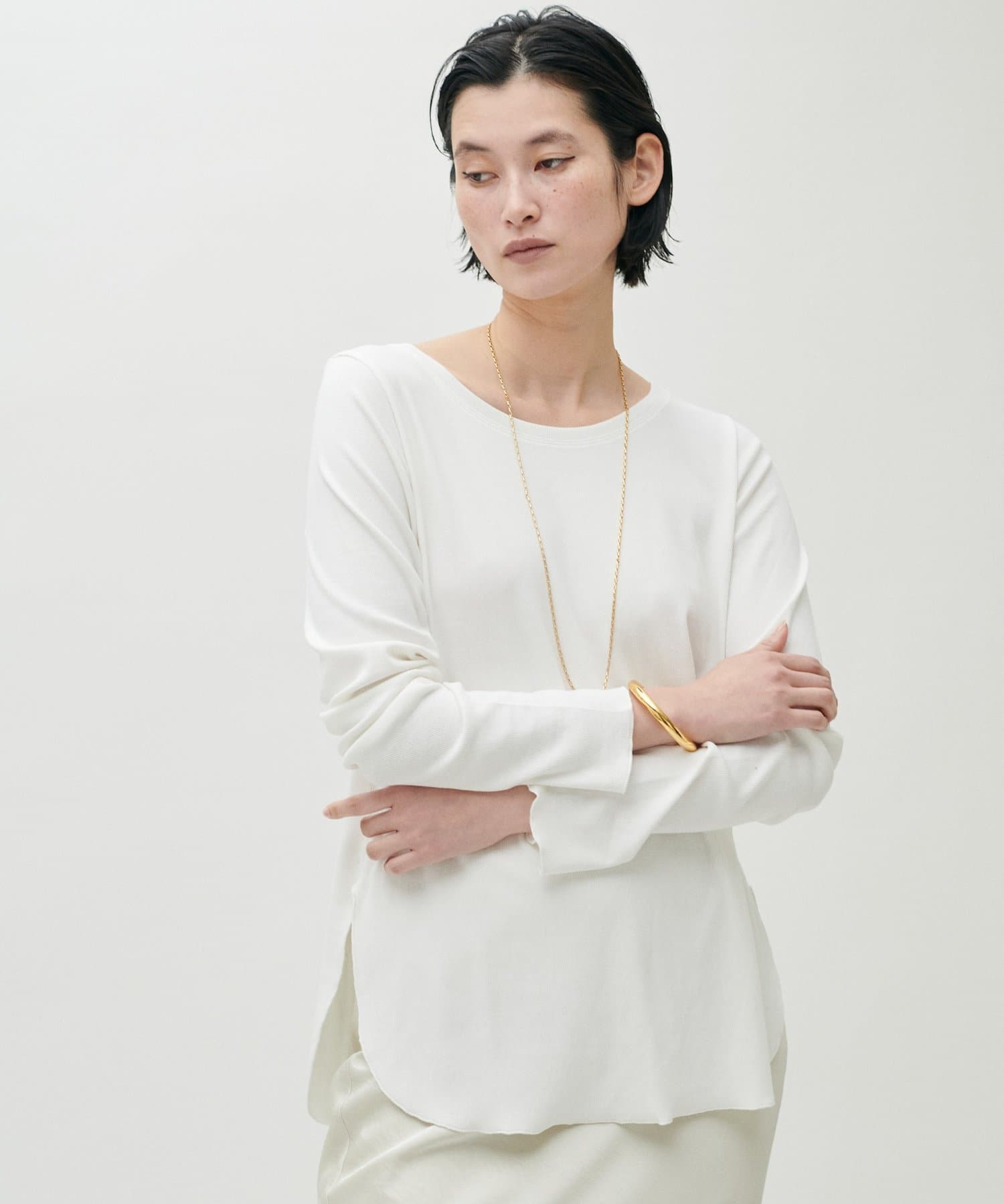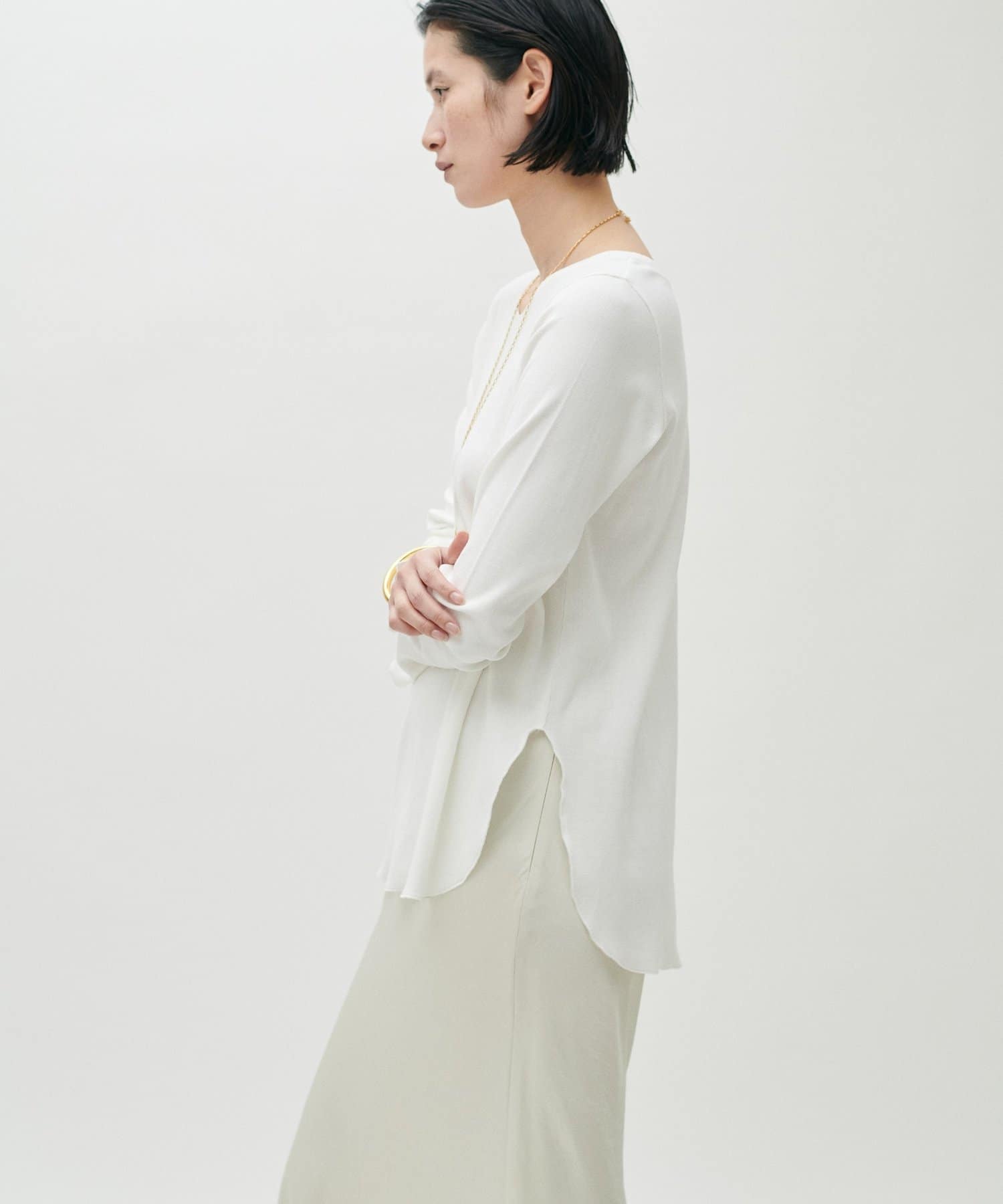 ややゆとりのあるシルエットと、身体のラインを拾いすぎない落ち感が特徴で、自然体で着られる一枚です。