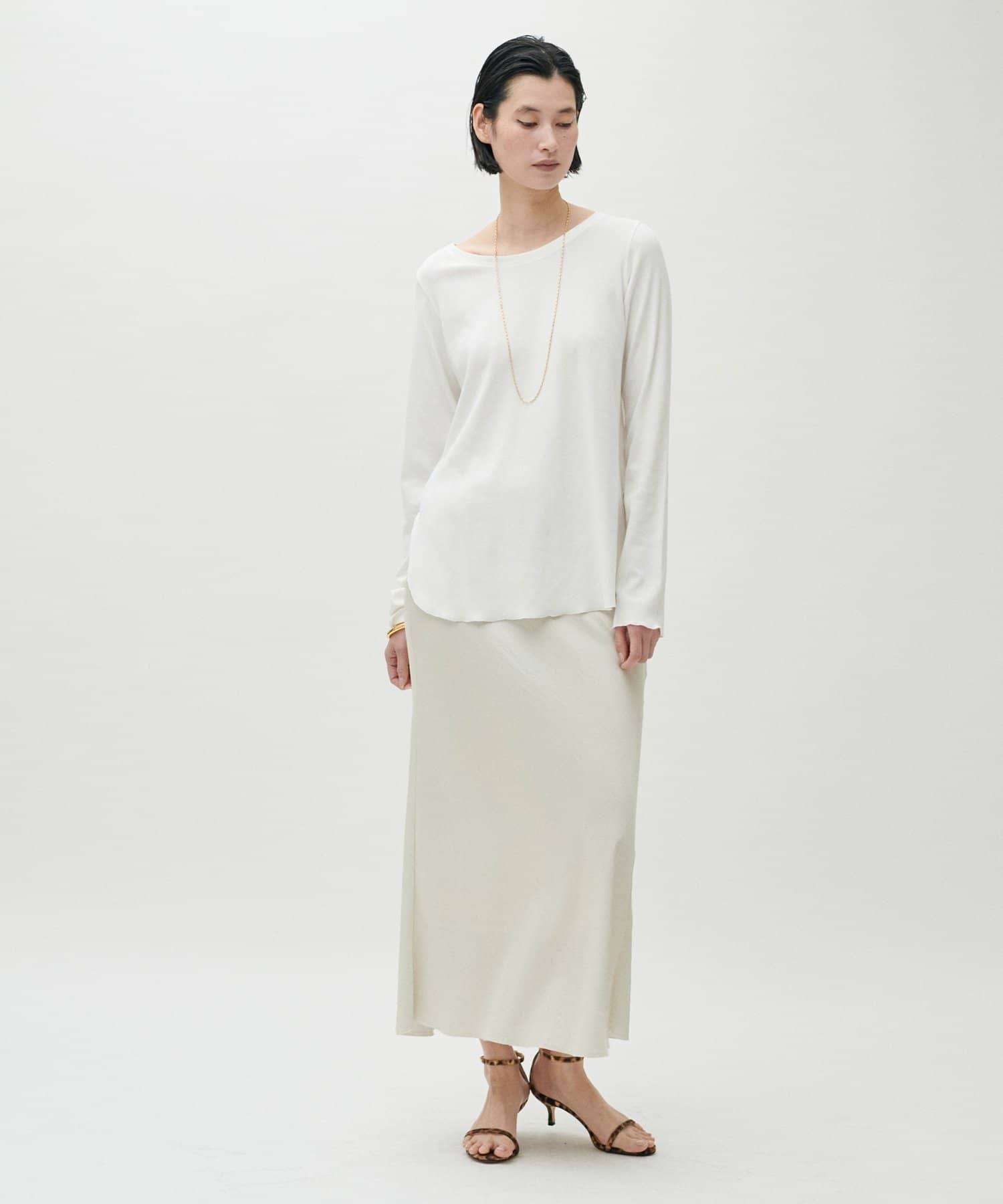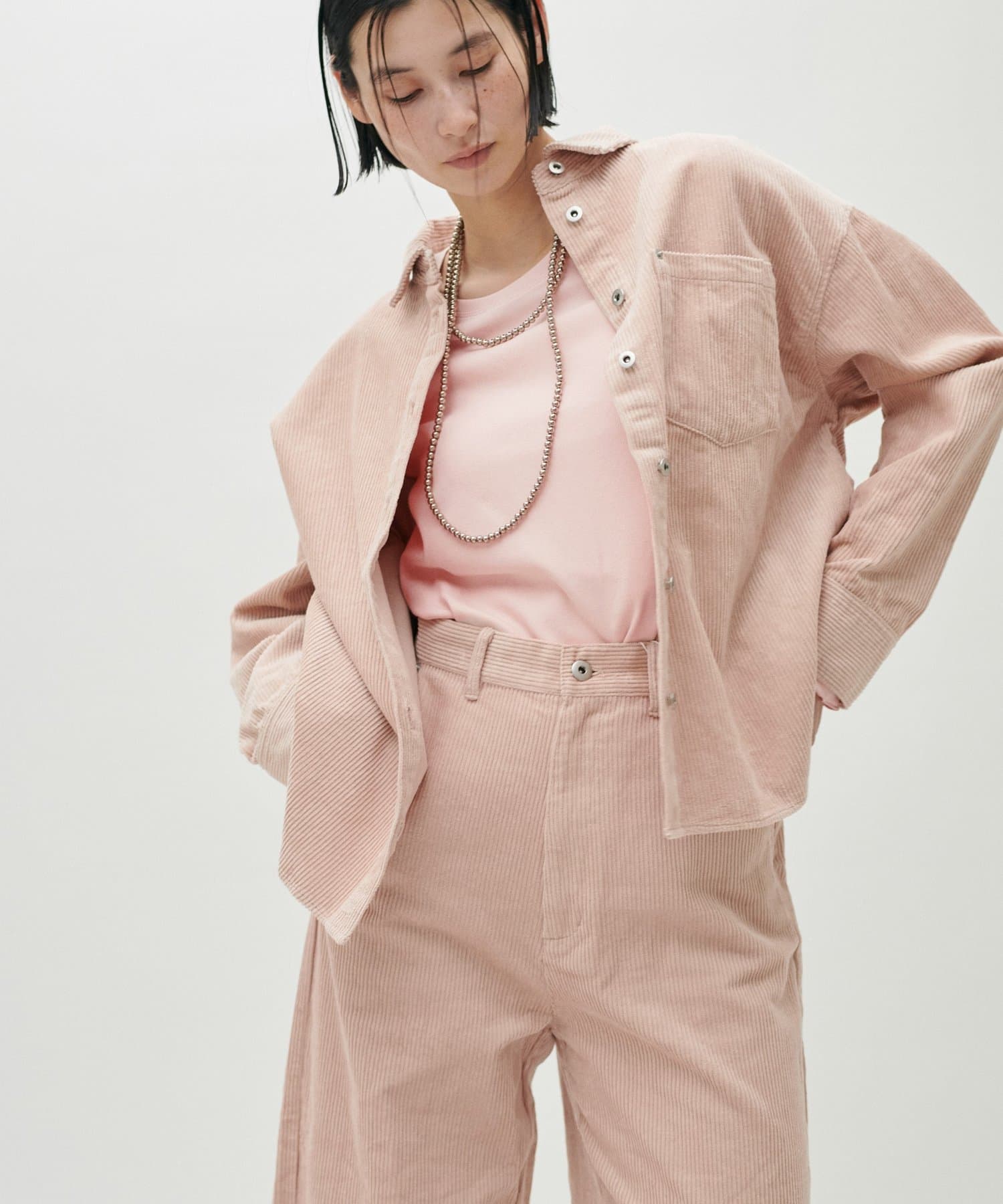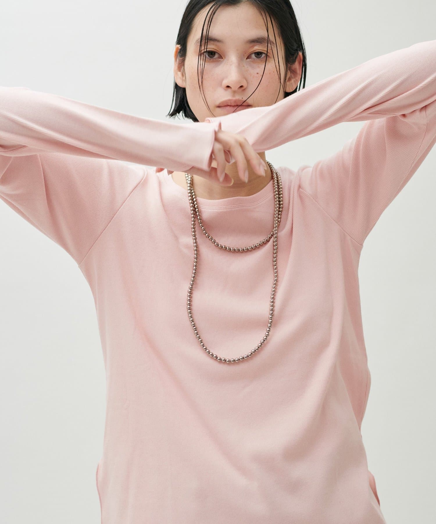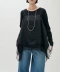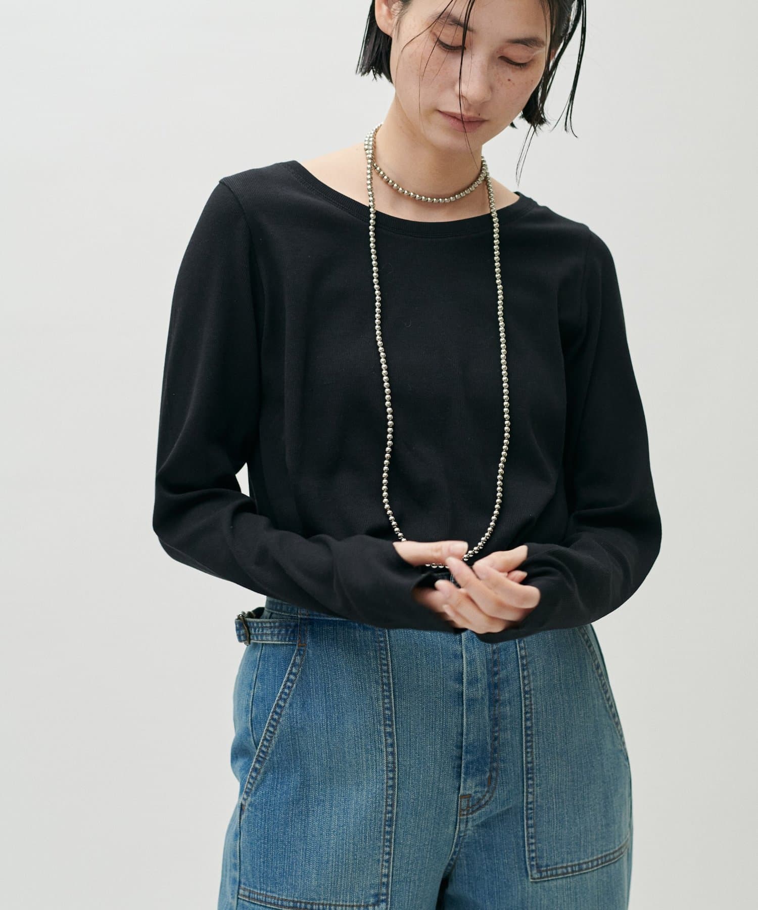 ややゆとりのあるシルエットと、身体のラインを拾いすぎない落ち感が特徴で、自然体で着られる一枚です。