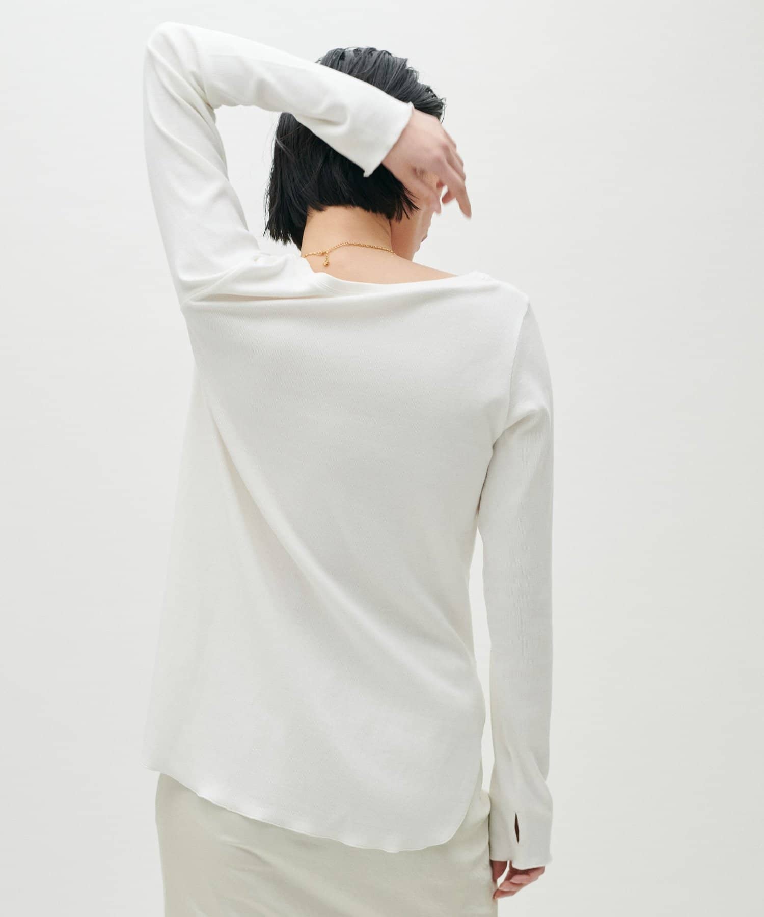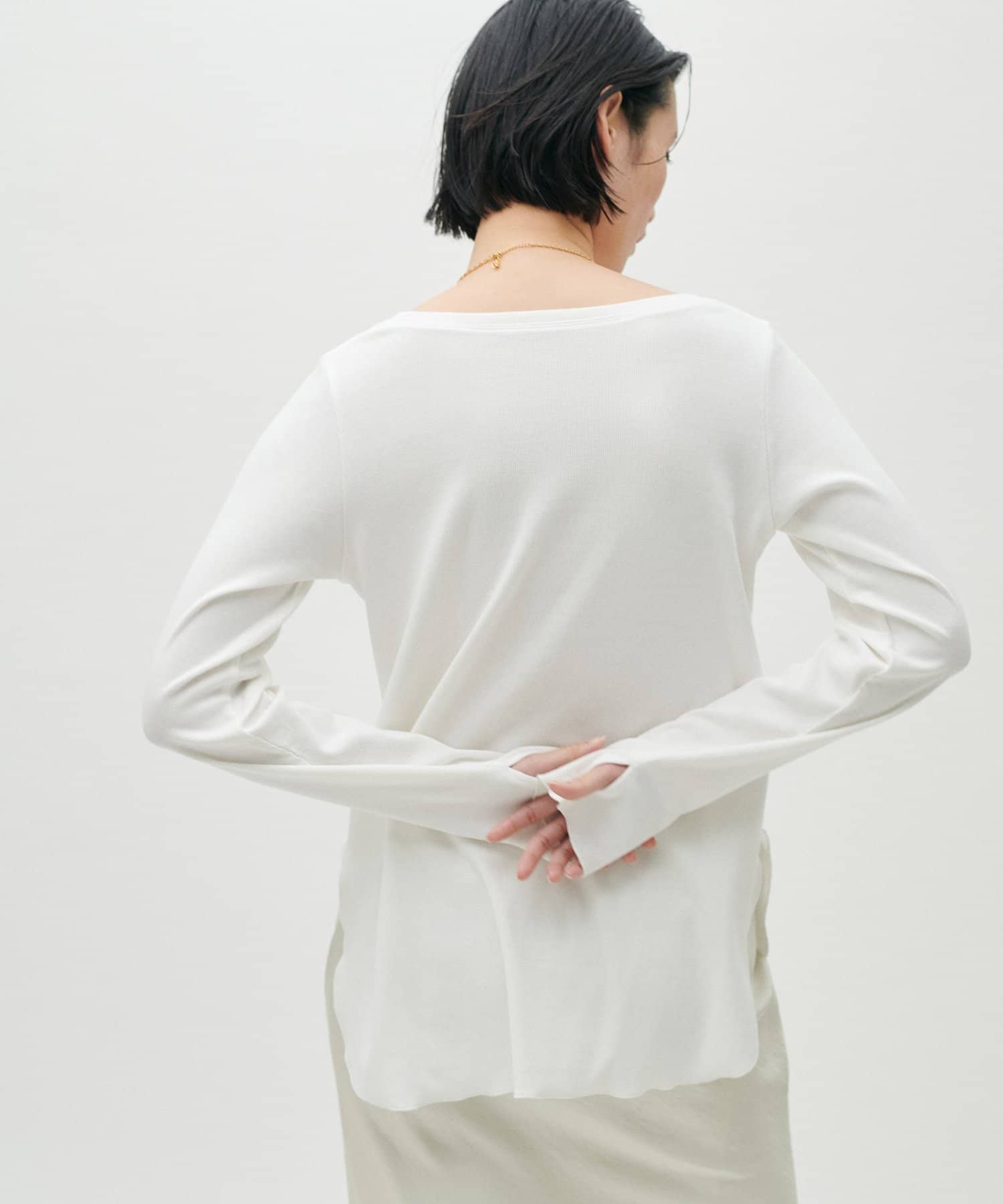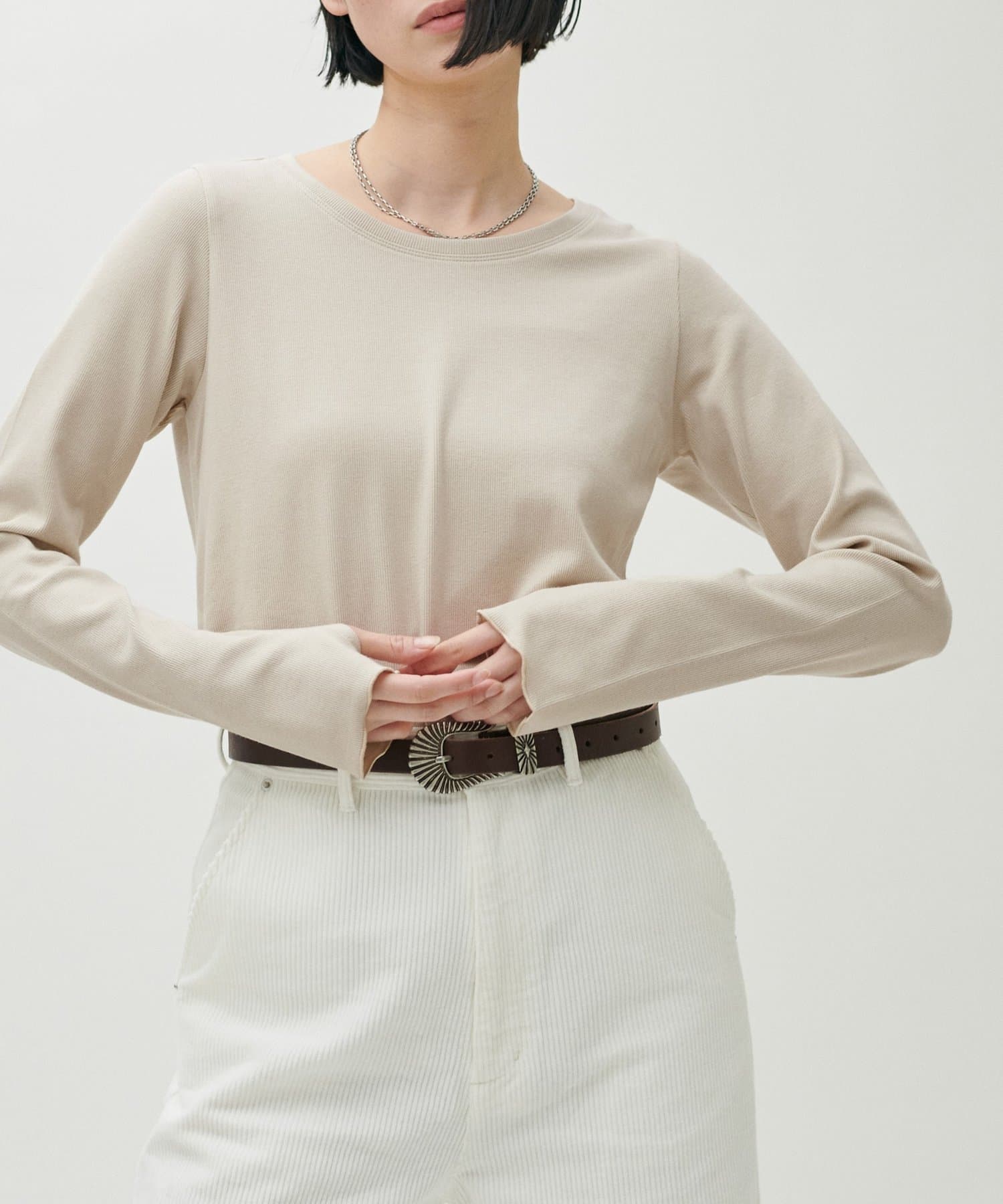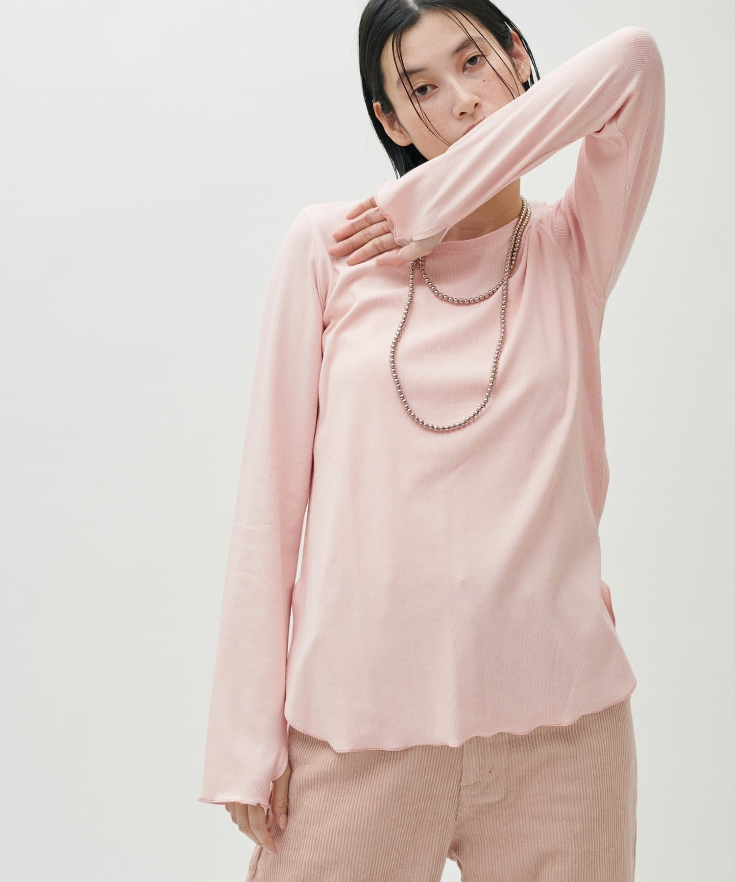 シンプルさの中に、さりげないニュアンスを効かせたサムホール付きロングスリーブTシャツ。