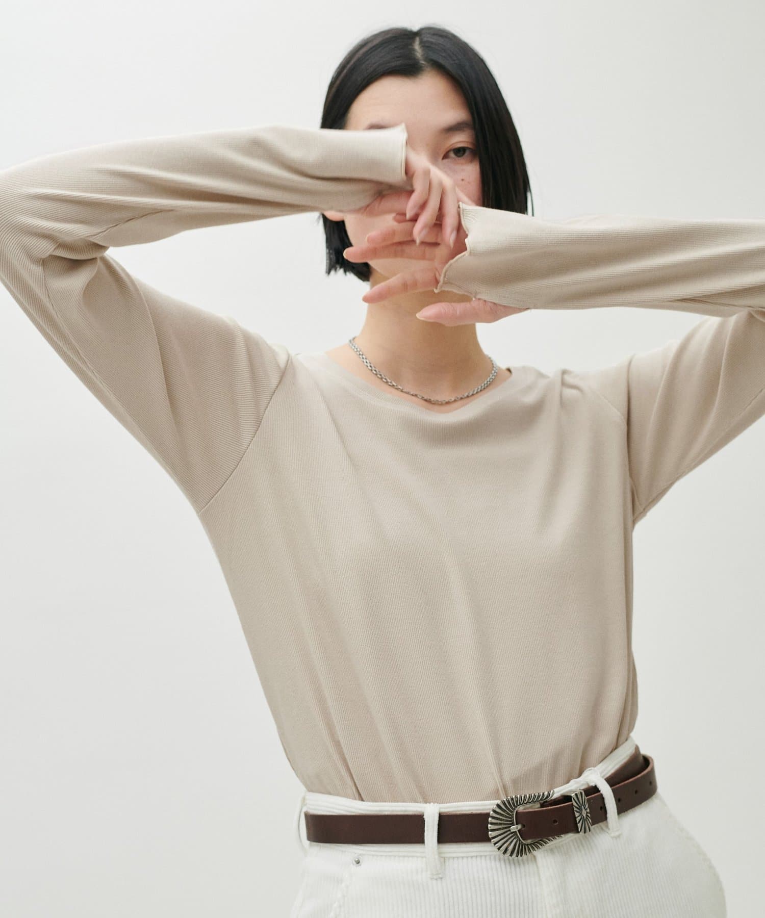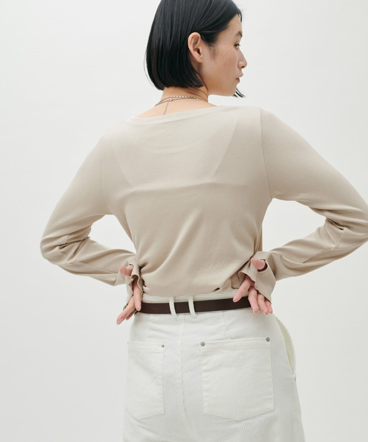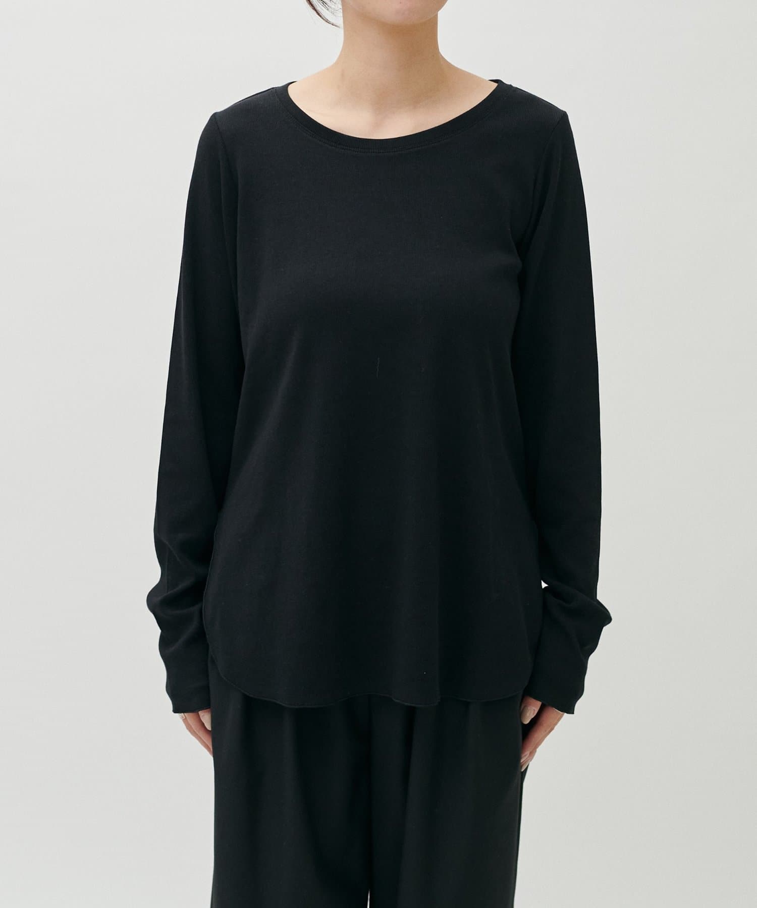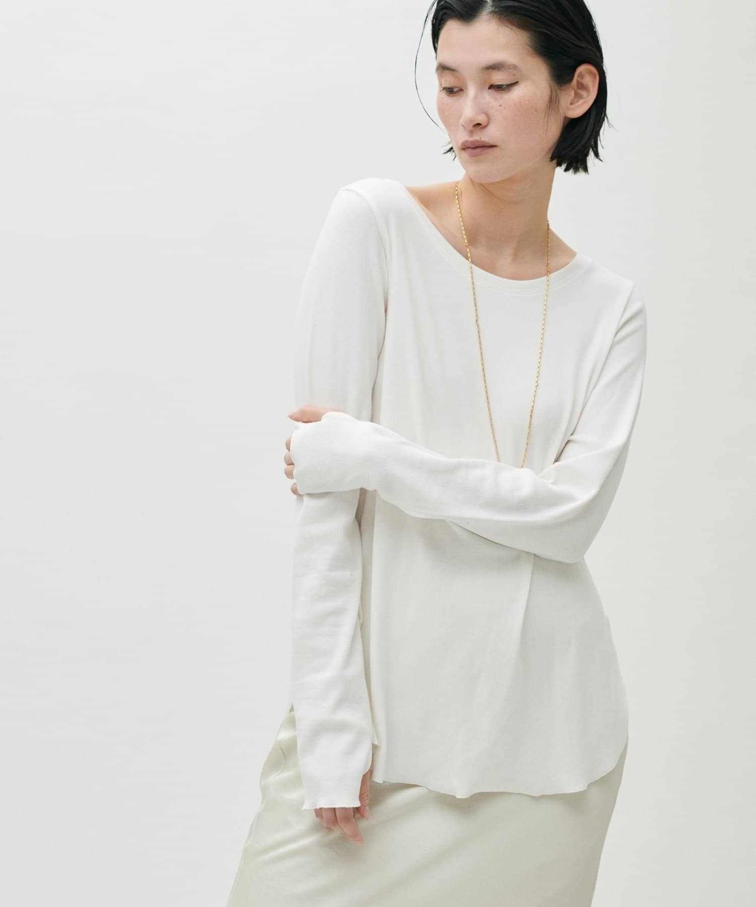 シンプルさの中に、さりげないニュアンスを効かせたサムホール付きロングスリーブTシャツ。