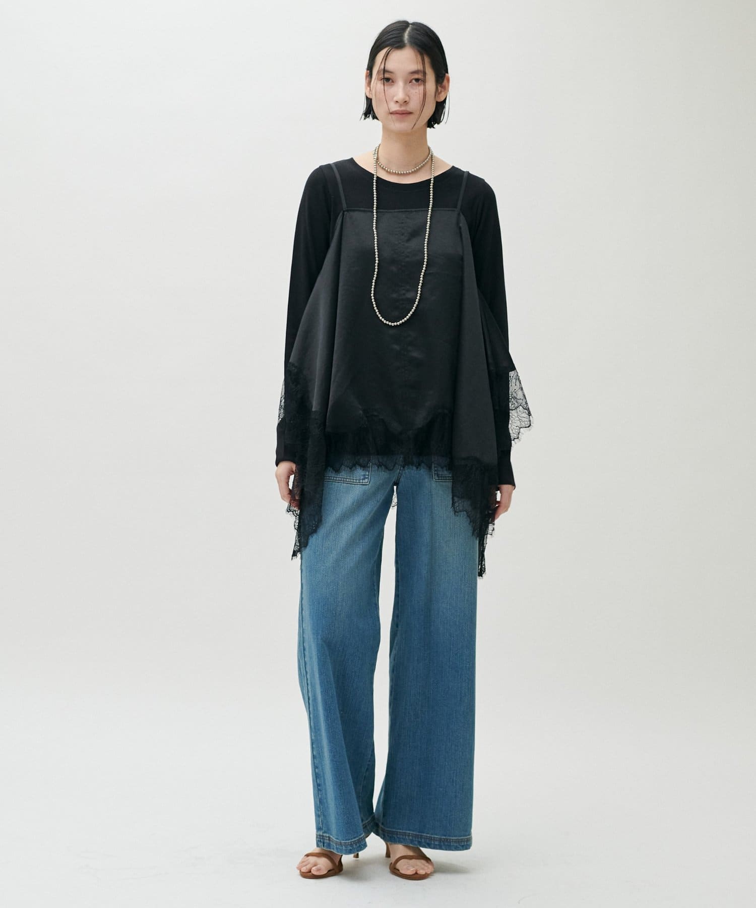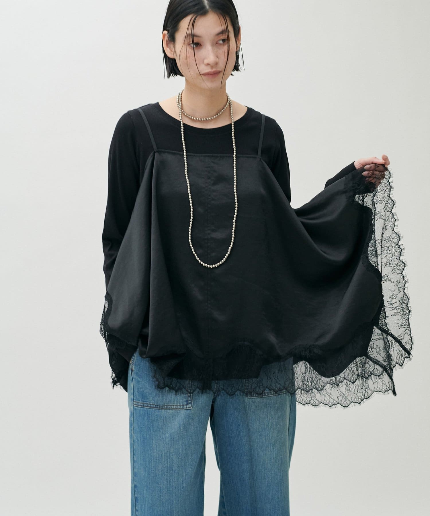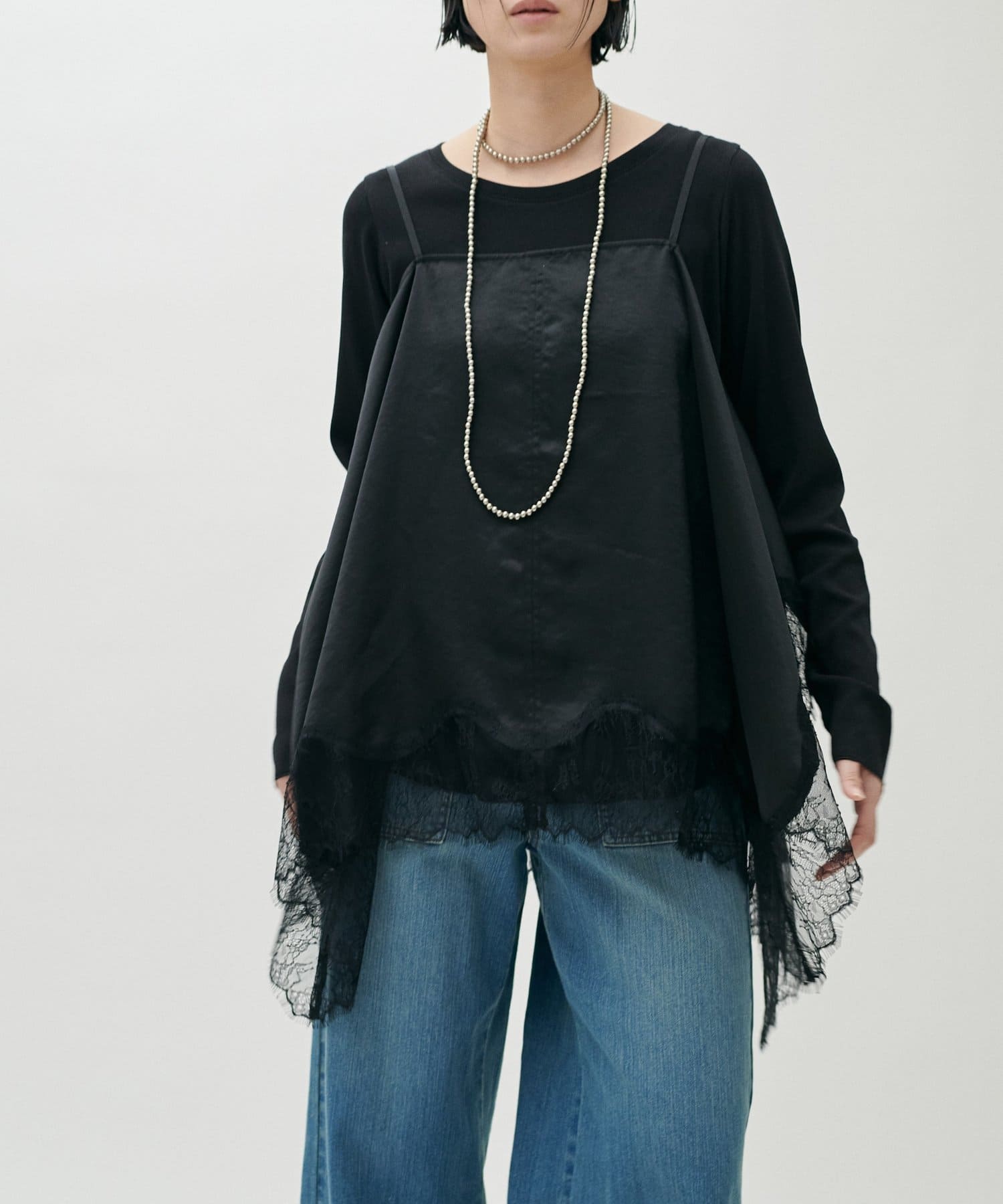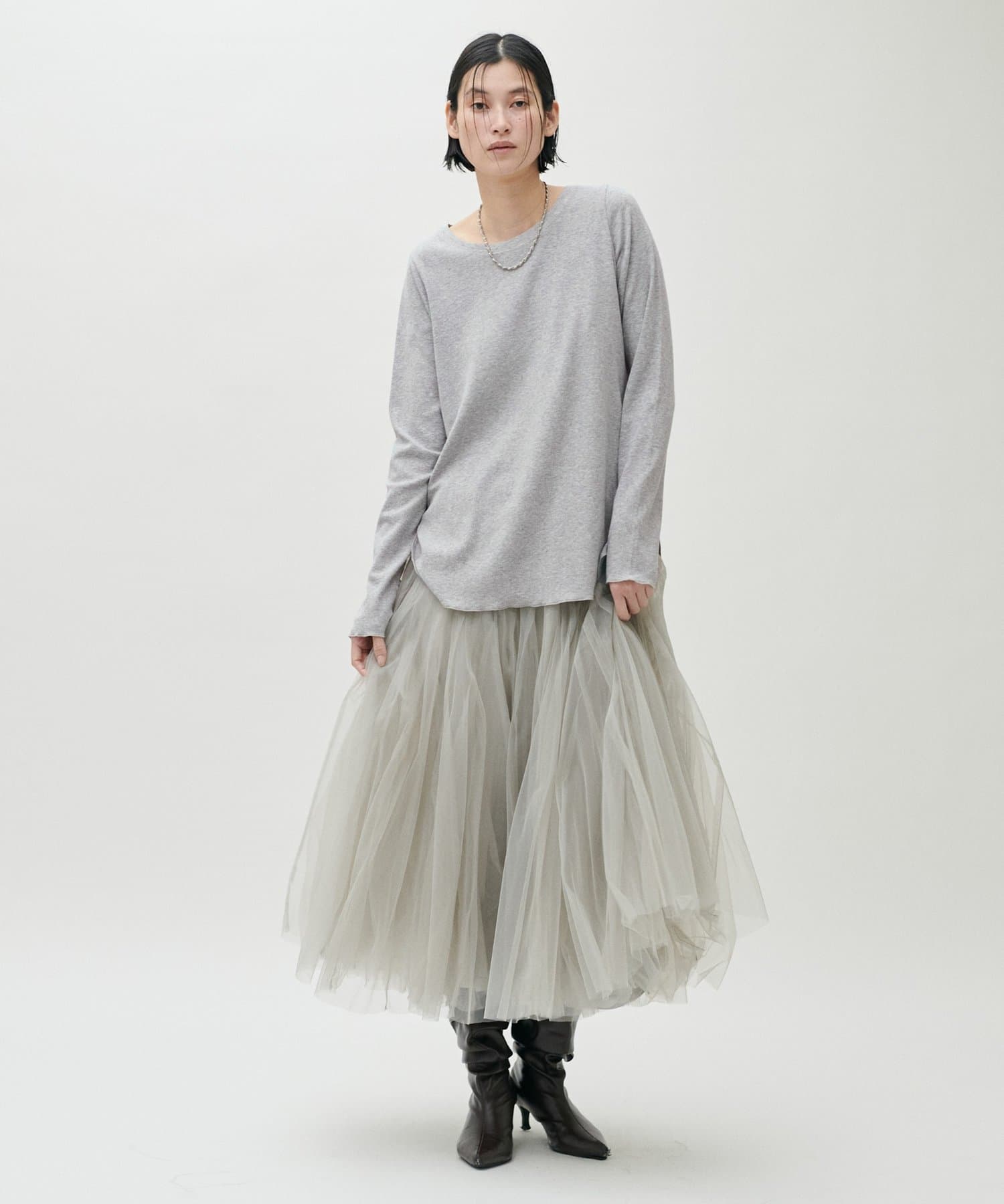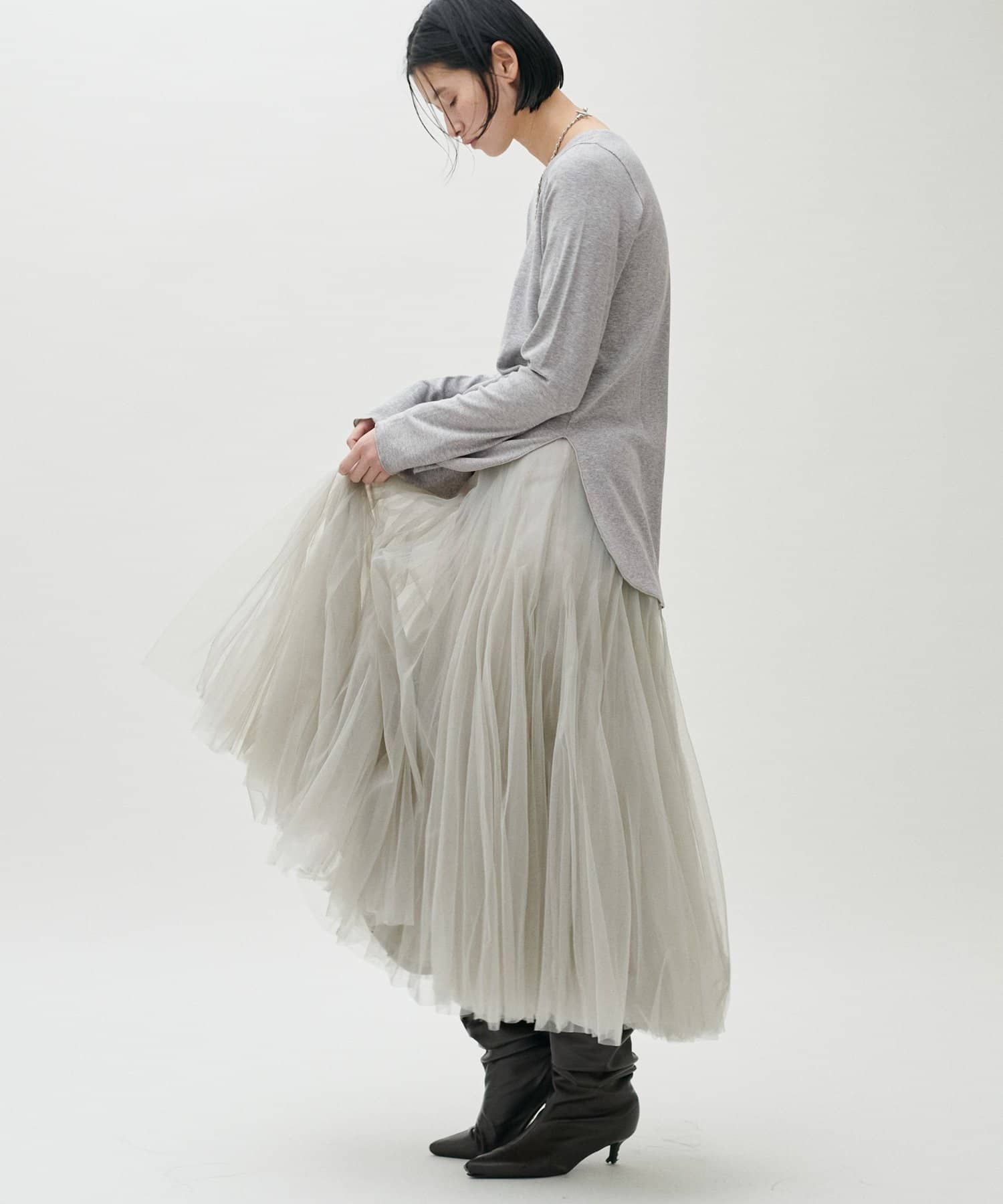 チュールスカートやサテン素材のボトムスと合わせることで、カジュアルすぎない抜け感のあるスタイリングに。
