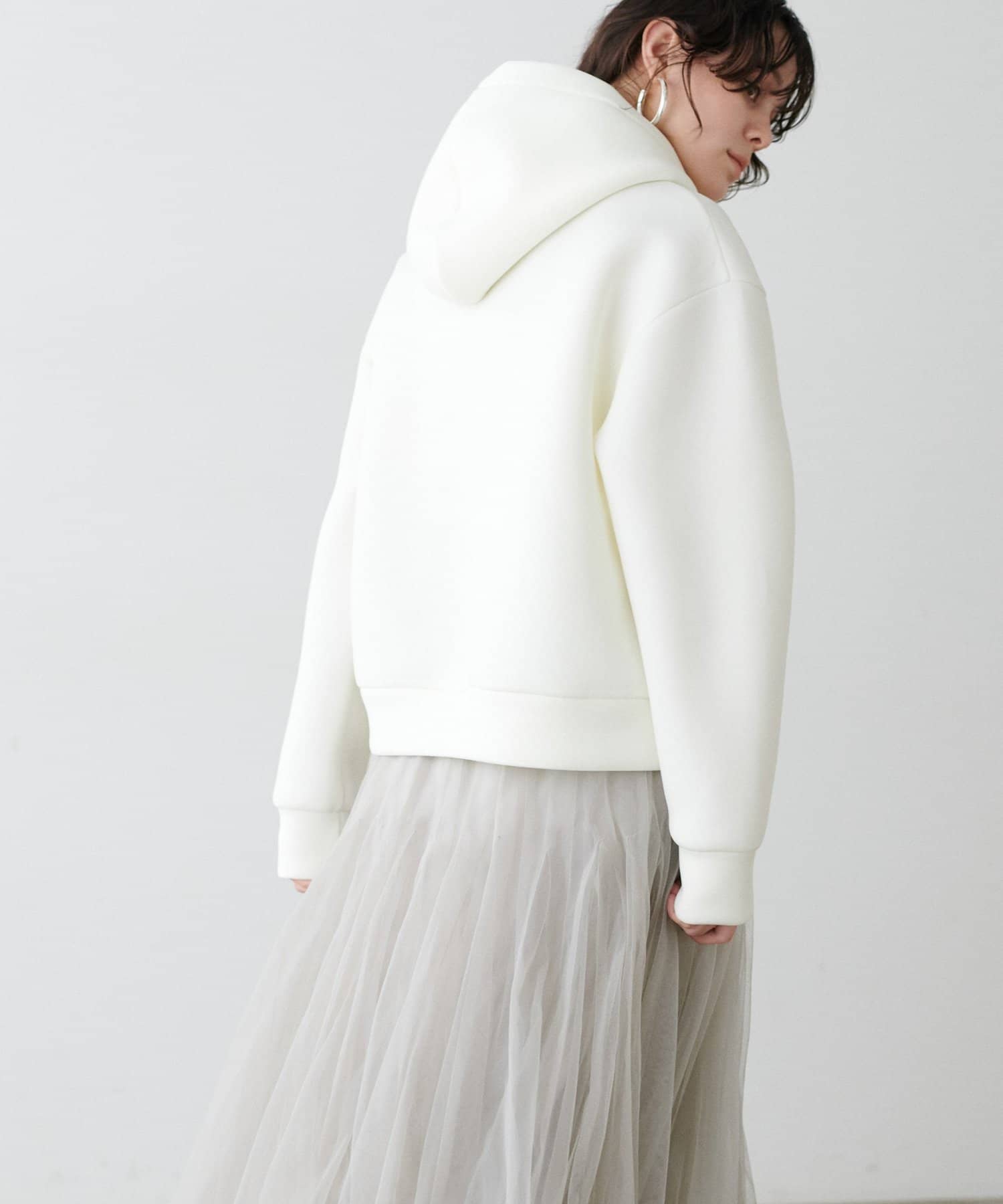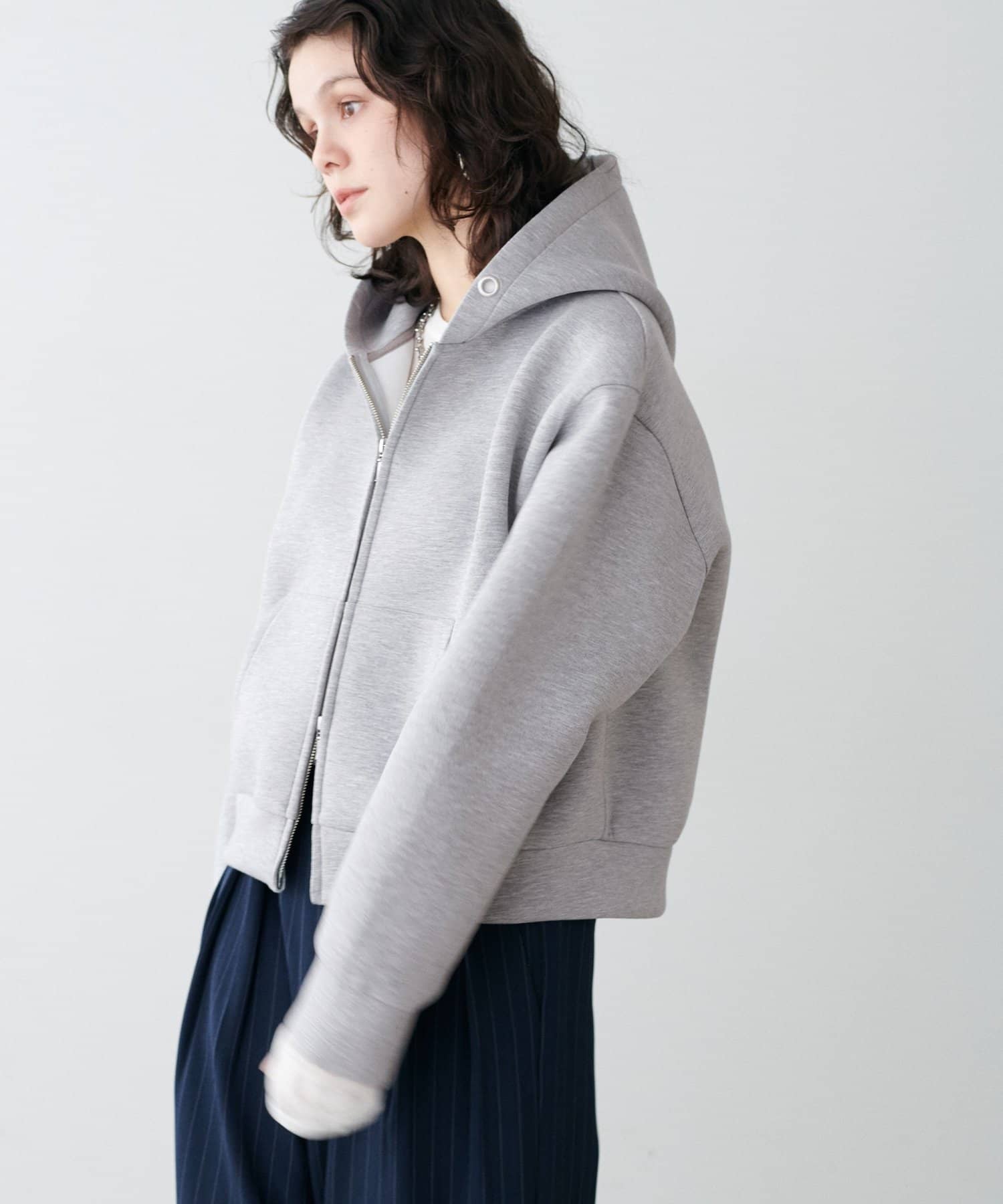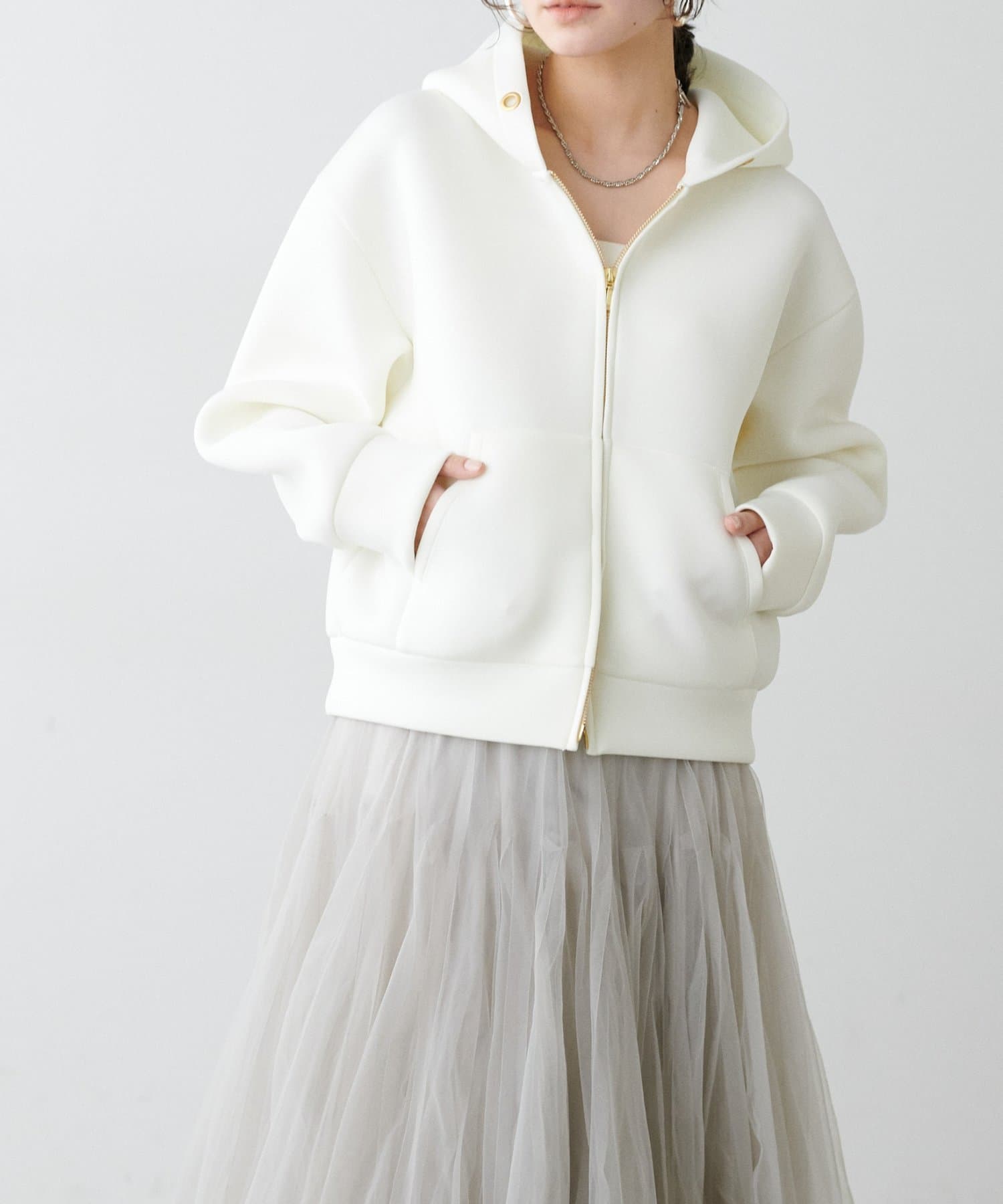 フード付きのデザインながら、クリーンな表情で大人のスタイリングにも取り入れやすいアイテムです。