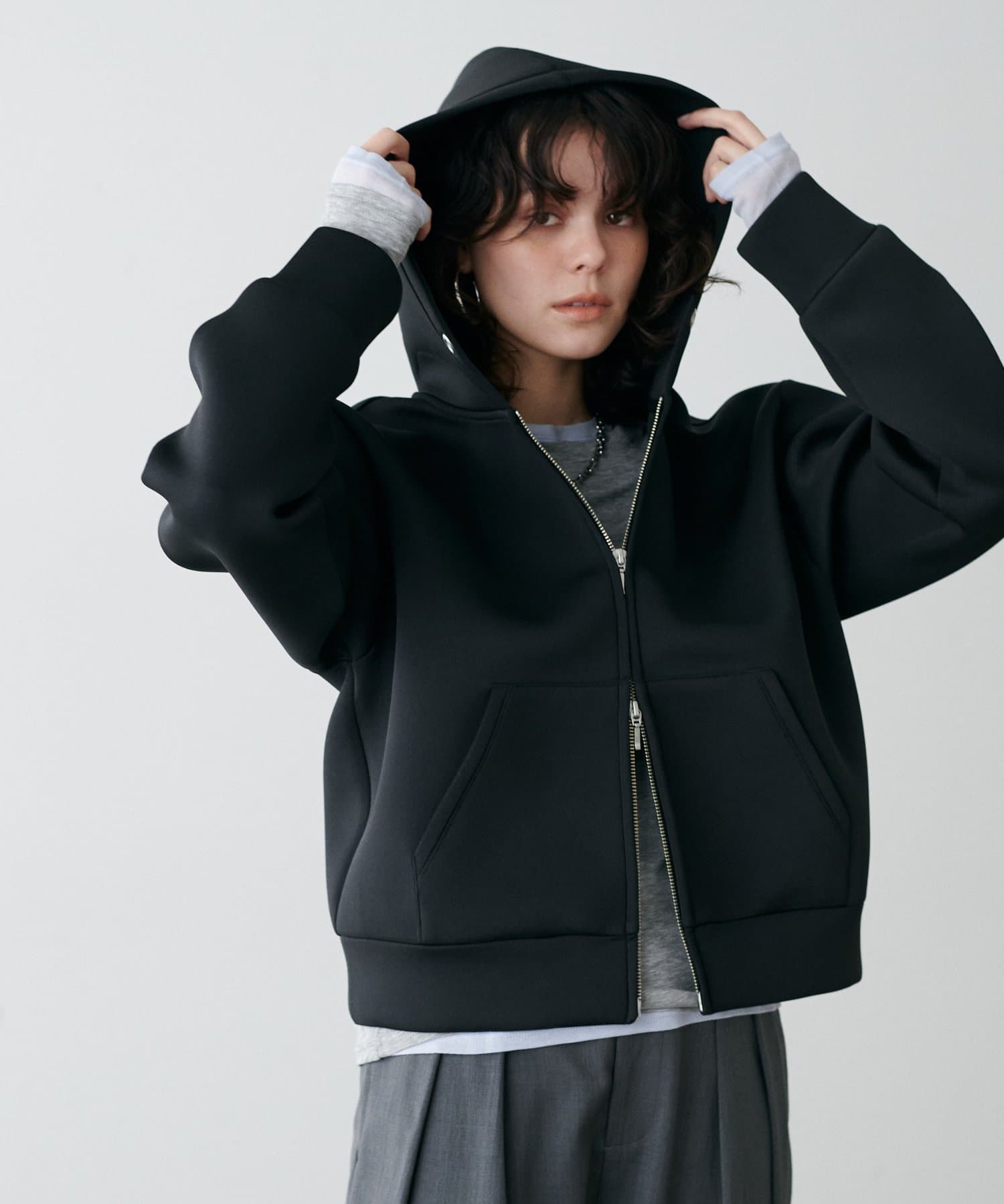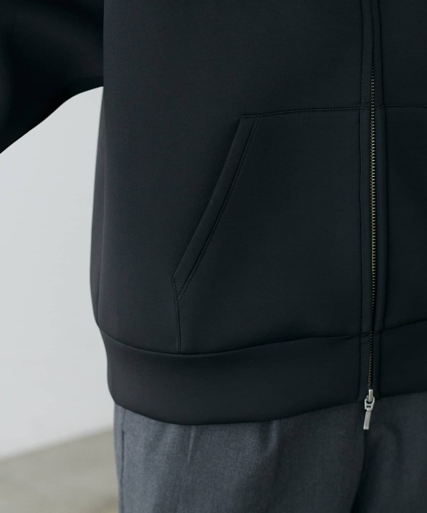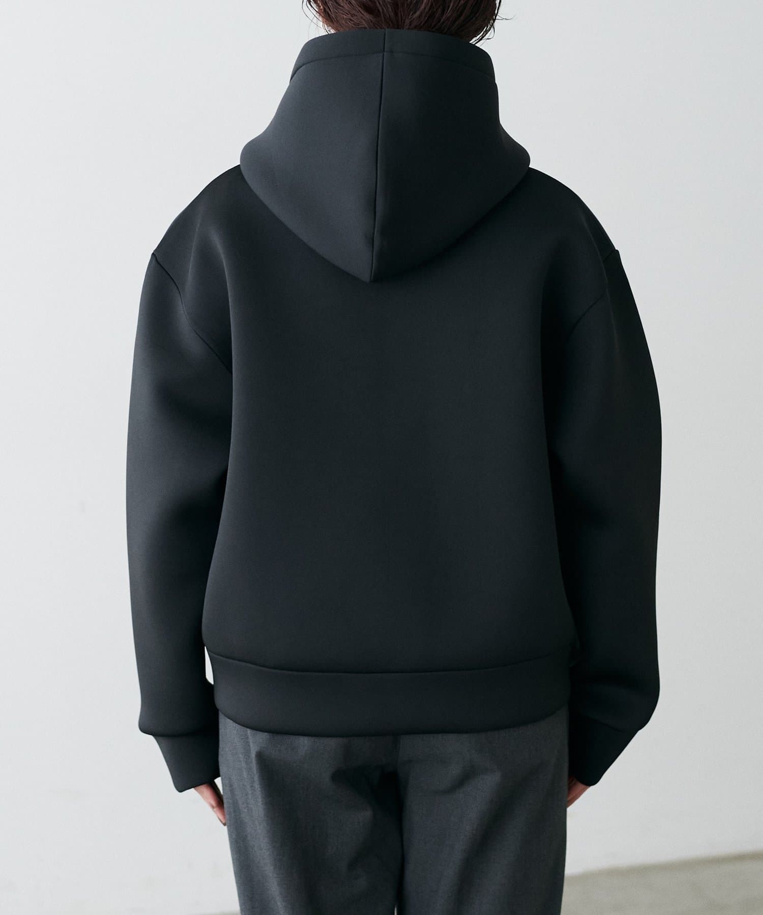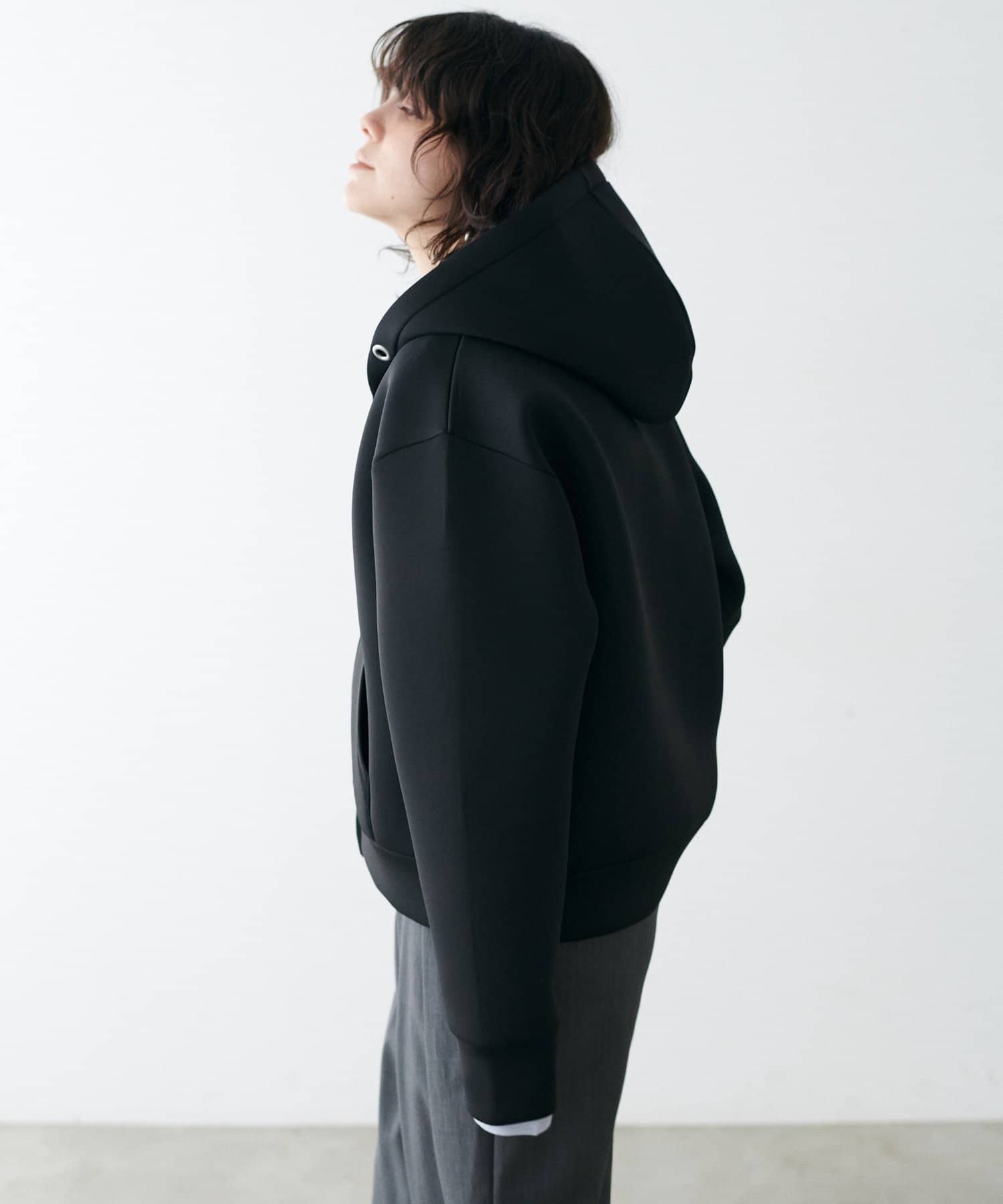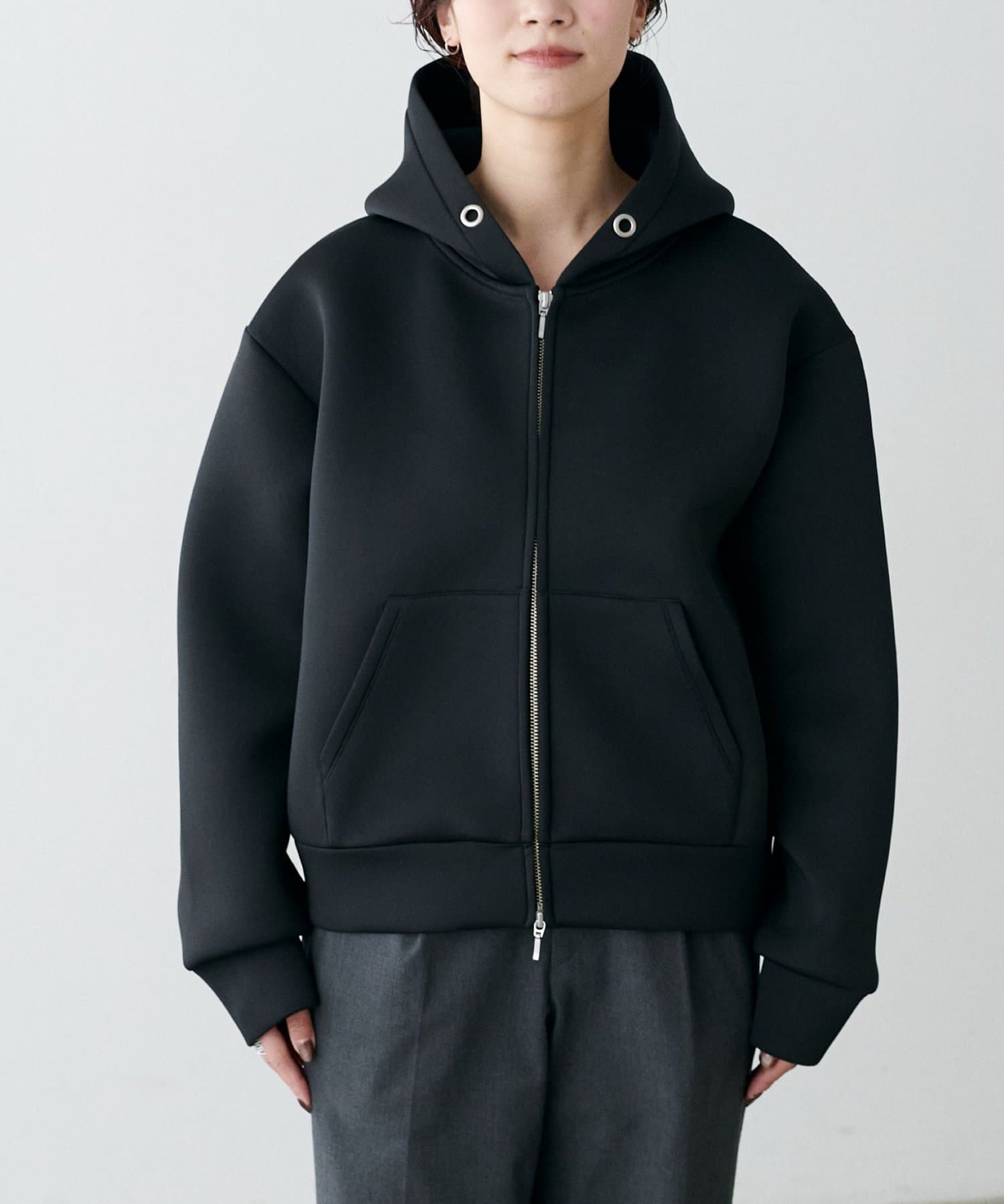 程よいハリ感と立体的なシルエットが魅力の、ダンボール素材を使用したダブルジップパーカー。