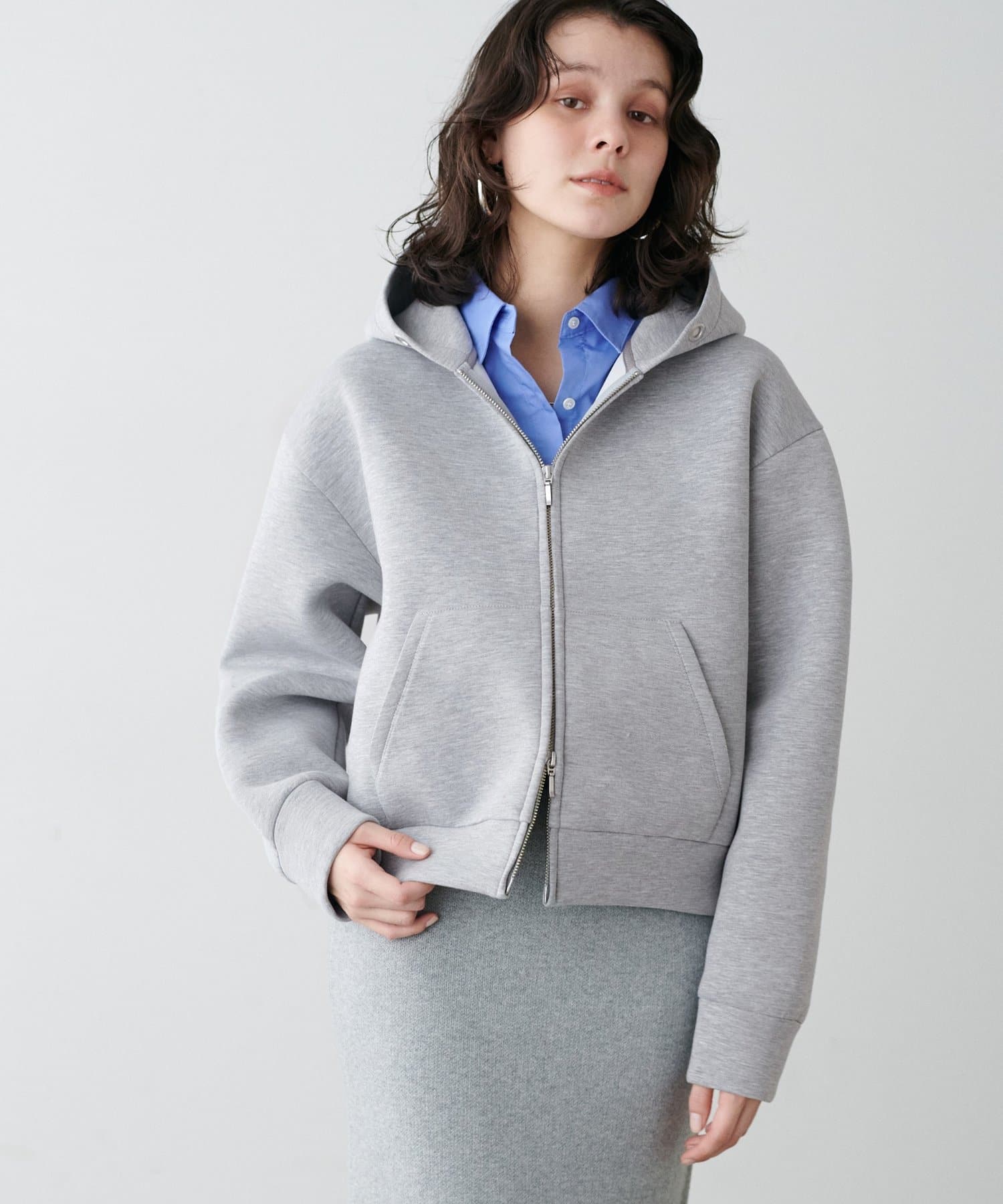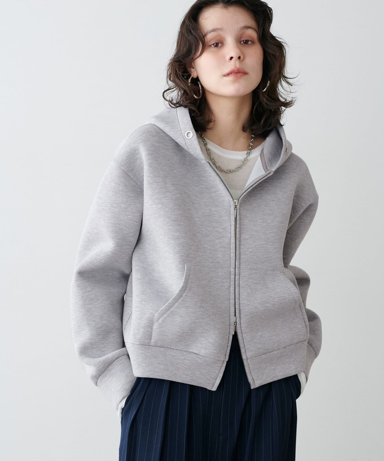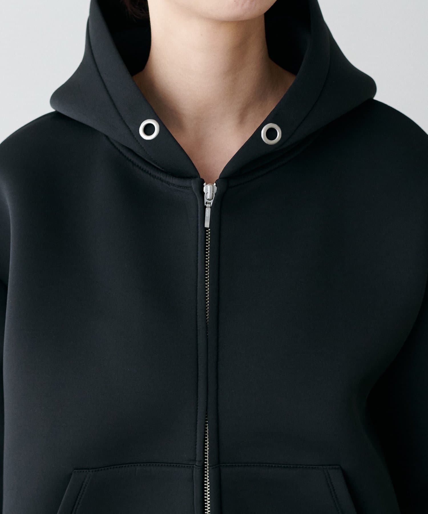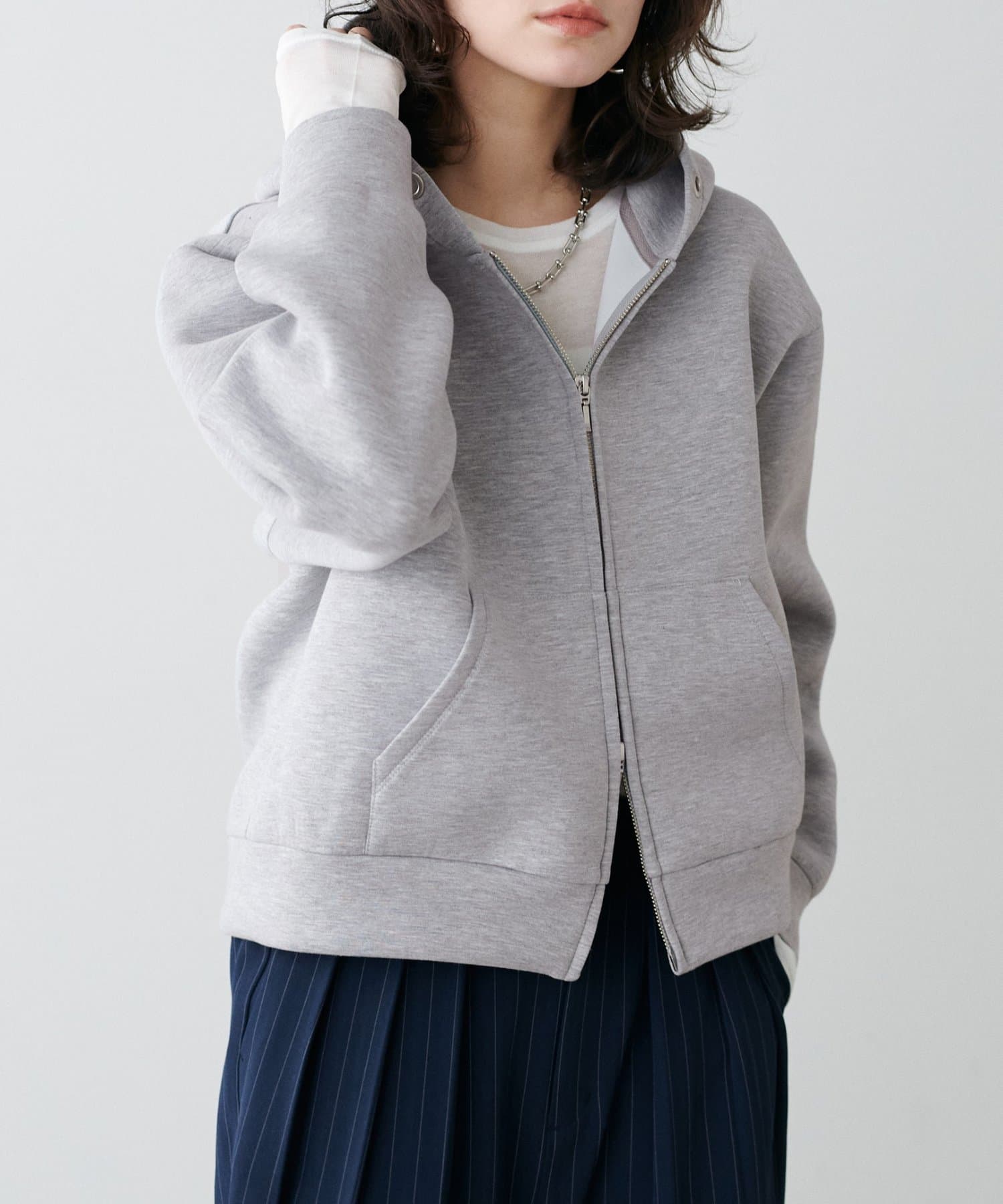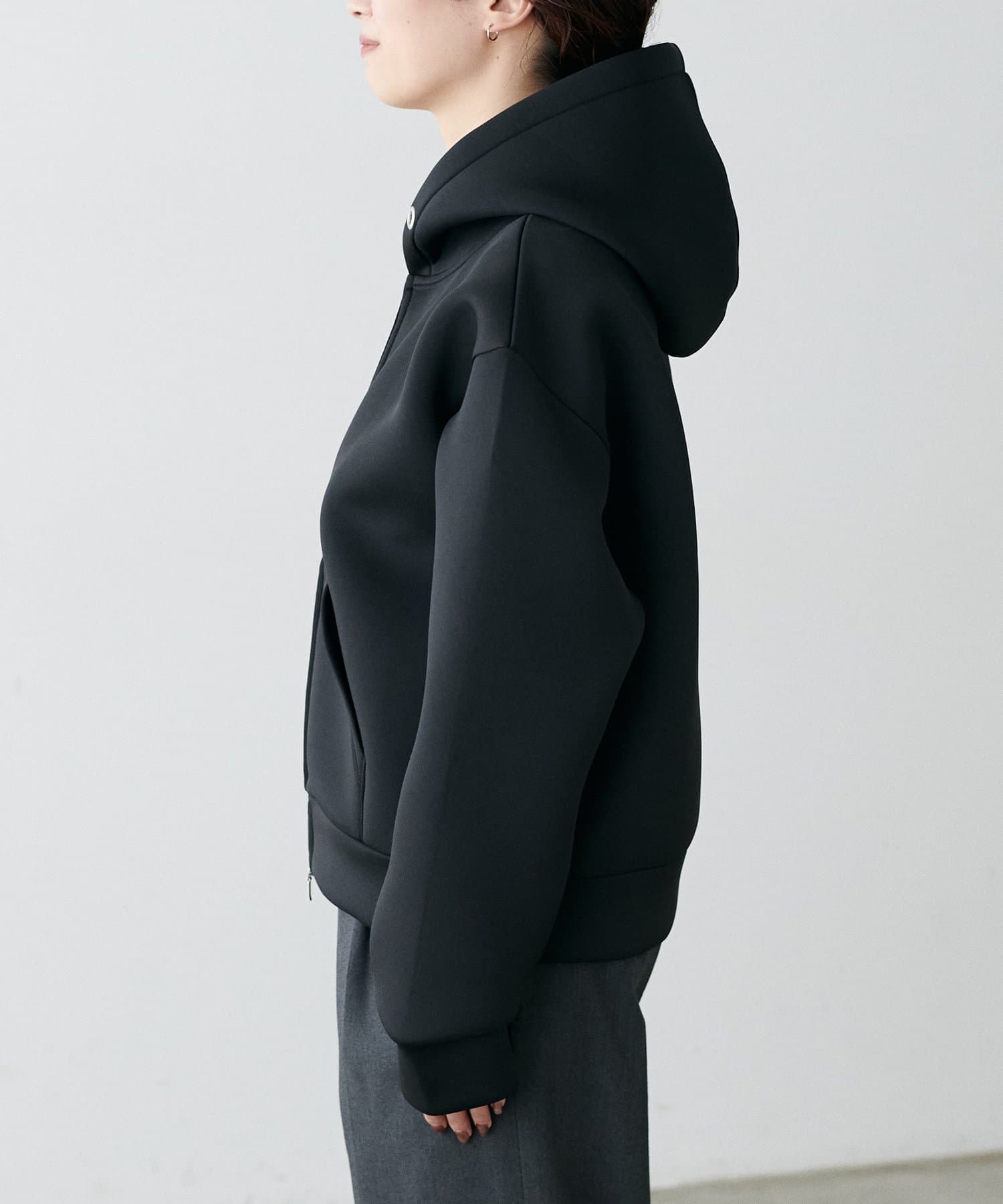 程よいハリ感と立体的なシルエットが魅力の、ダンボール素材を使用したダブルジップパーカー。