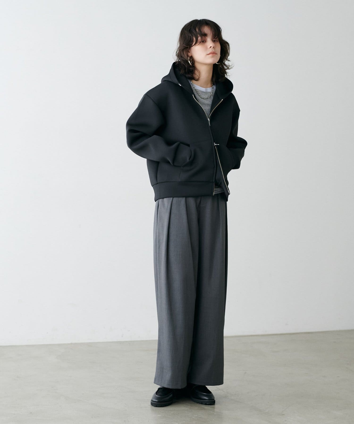 ダブルジップ仕様により、開け方次第でシルエットや雰囲気を調整できるのもポイント。