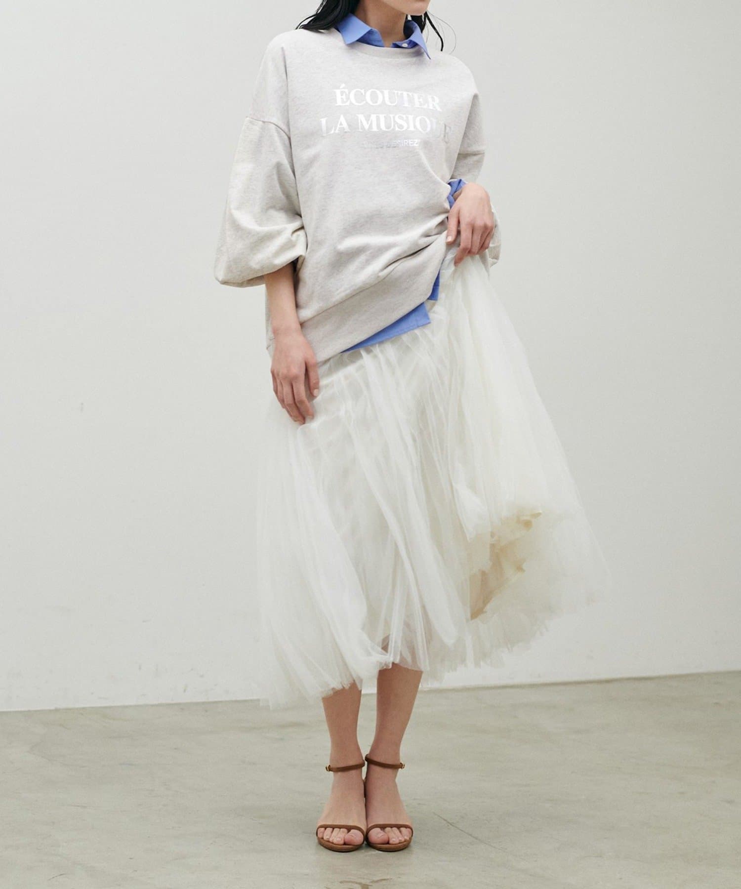 スカートと合わせてミックススタイルもおすすめ。