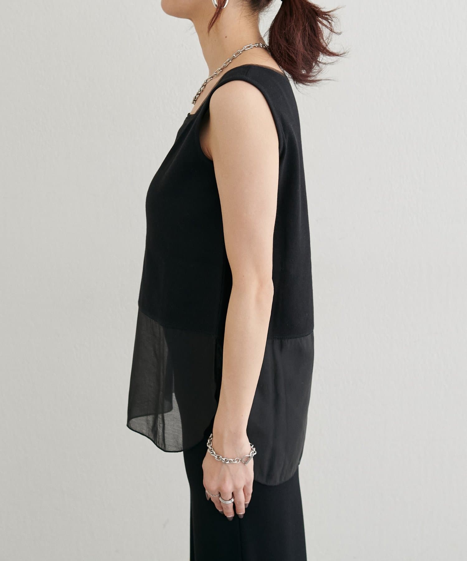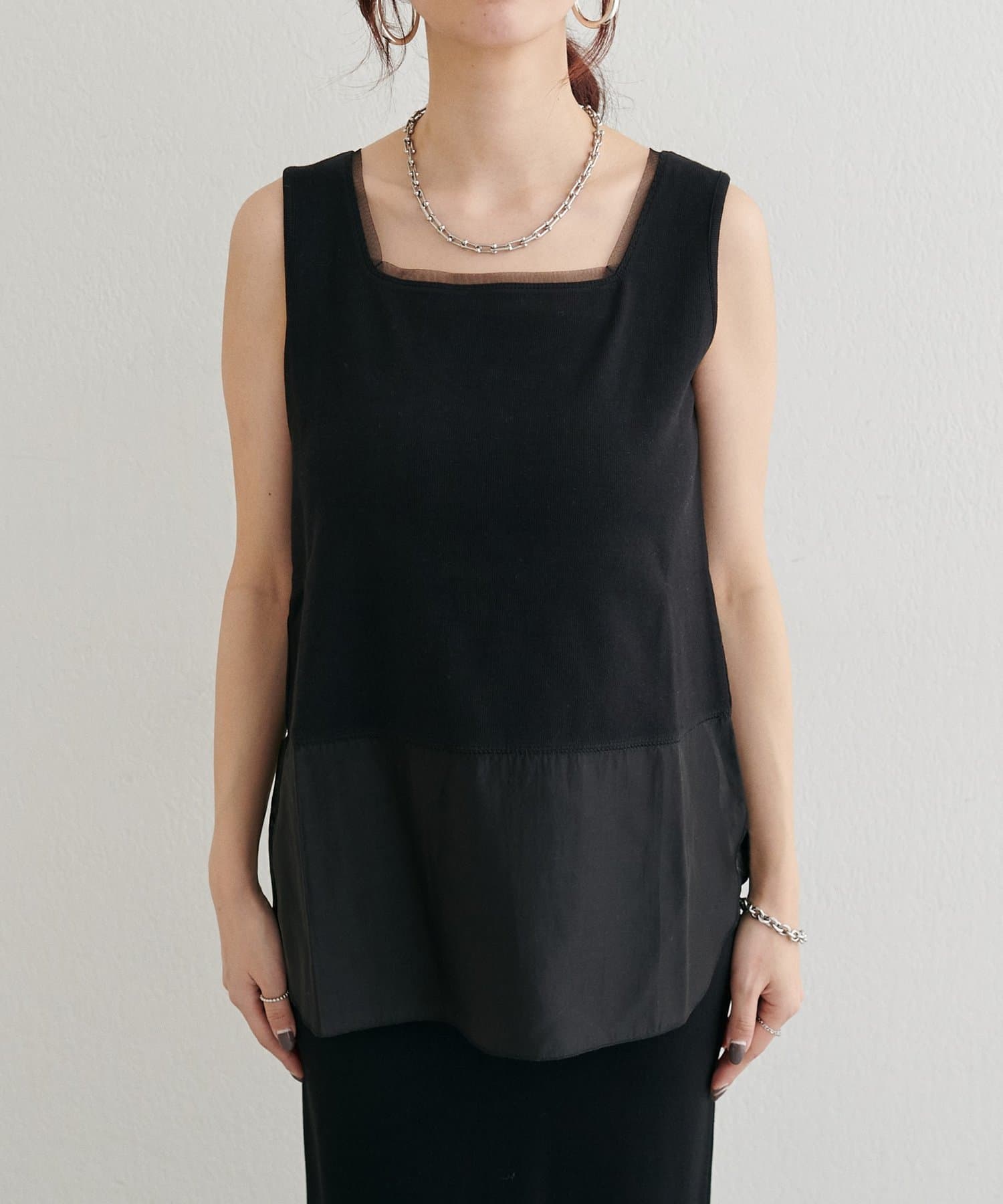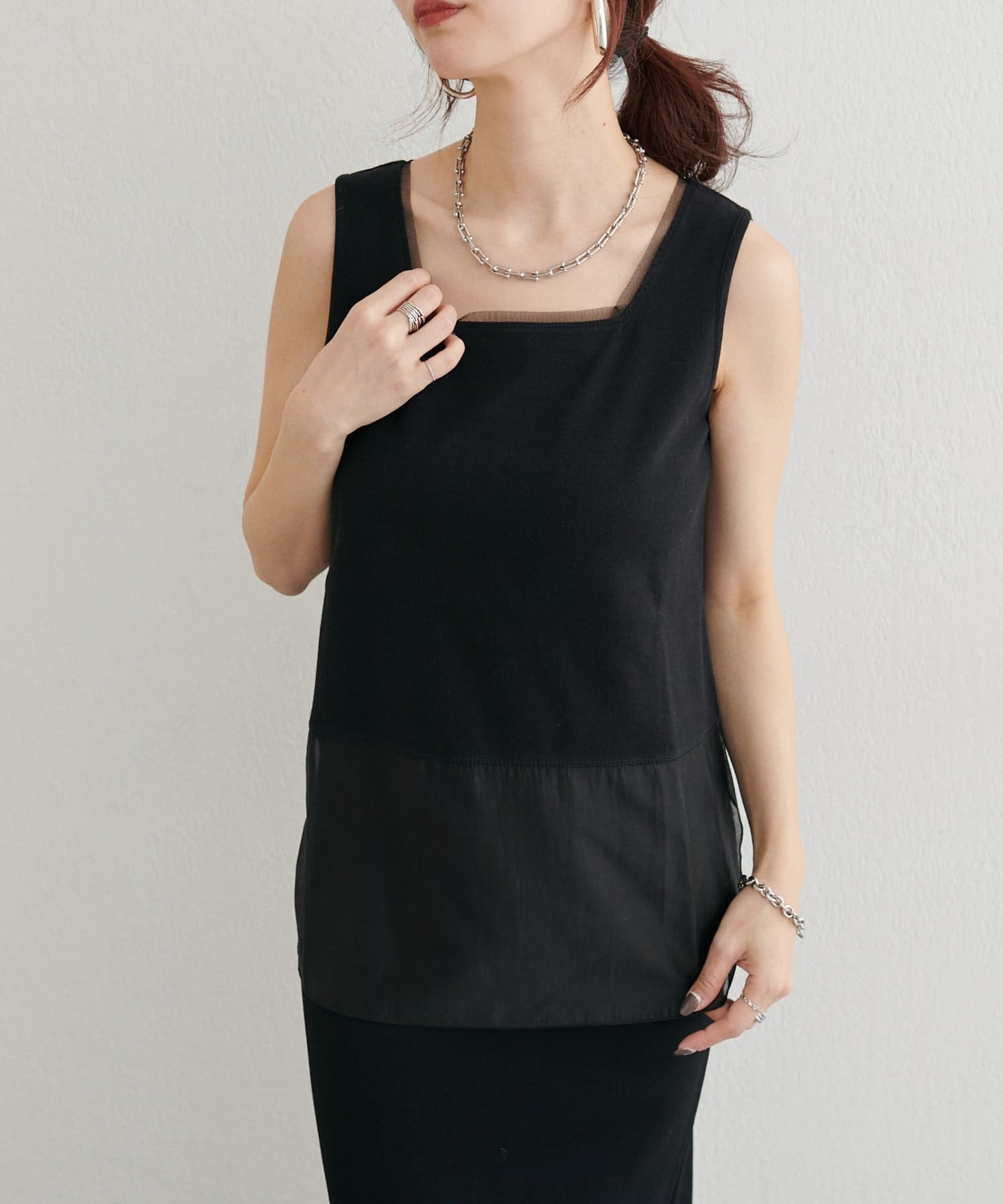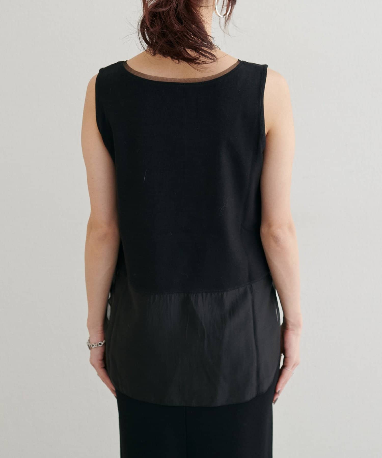 滑らかで肌あたりのよいカットソーに、シアーのチュールをドッキングさせたアイテム。