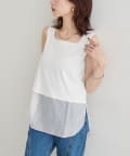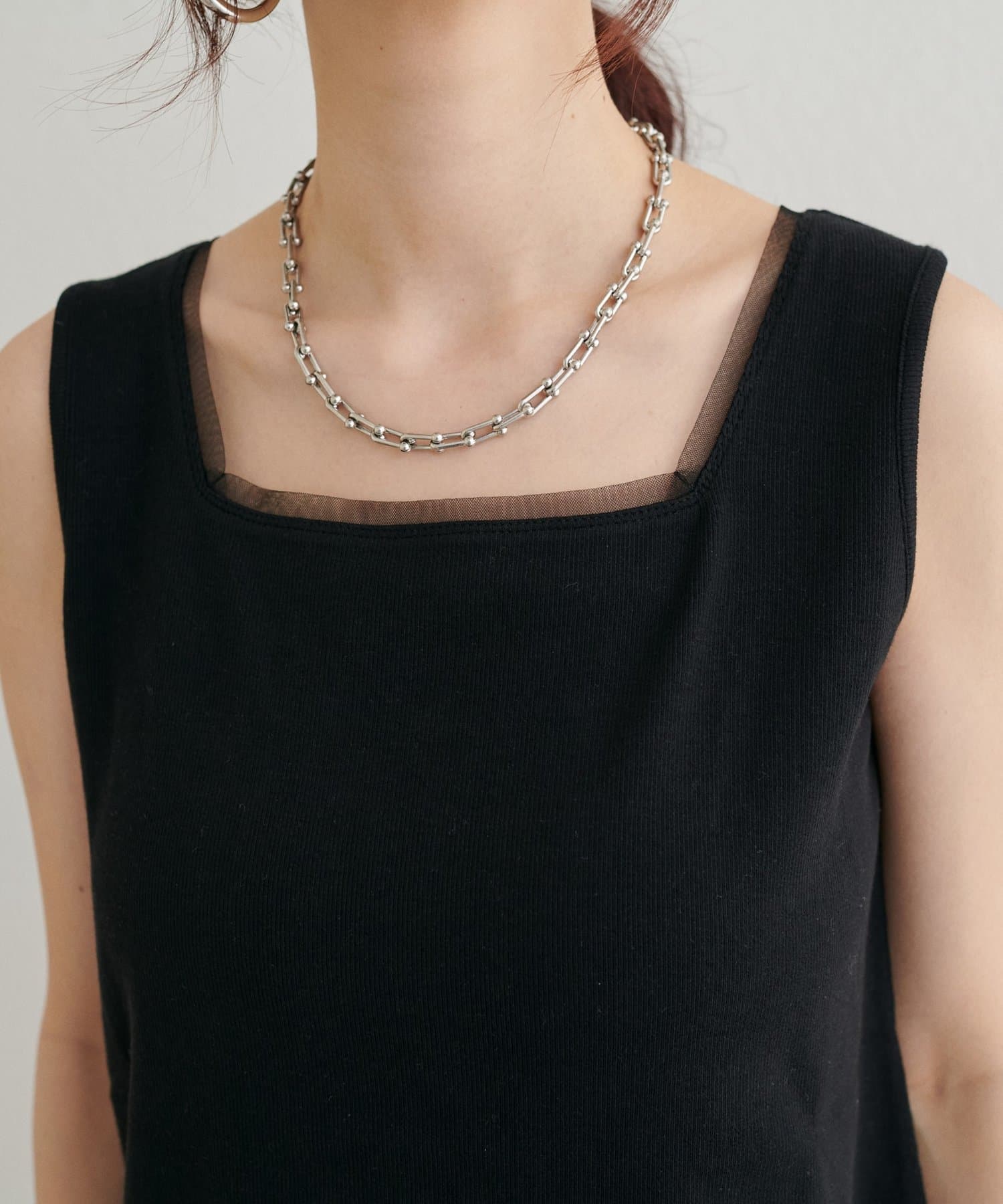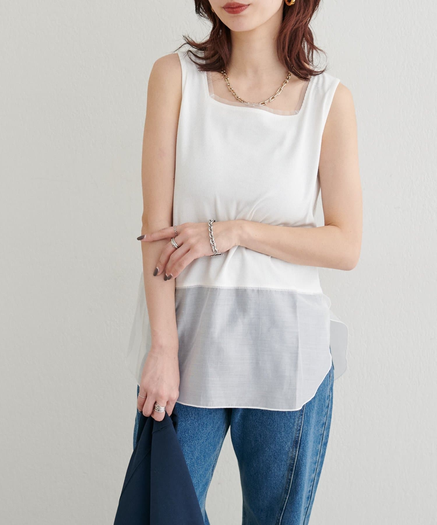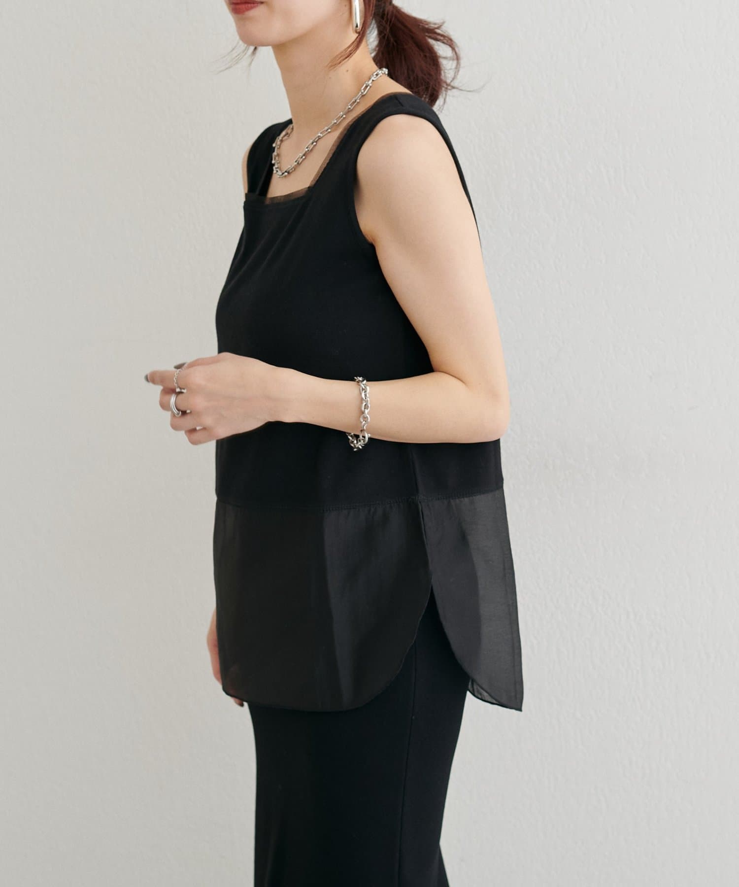 滑らかで肌あたりのよいカットソーに、シアーのチュールをドッキングさせたアイテム。