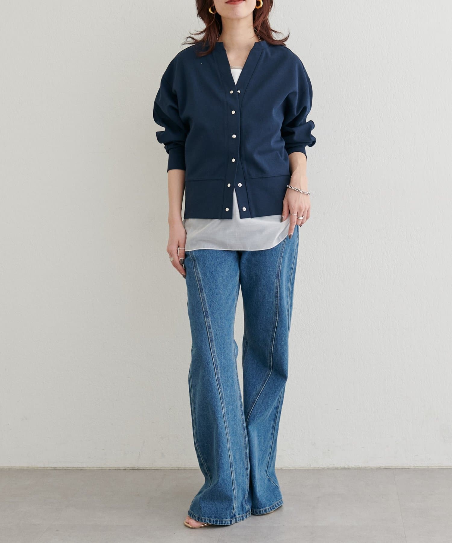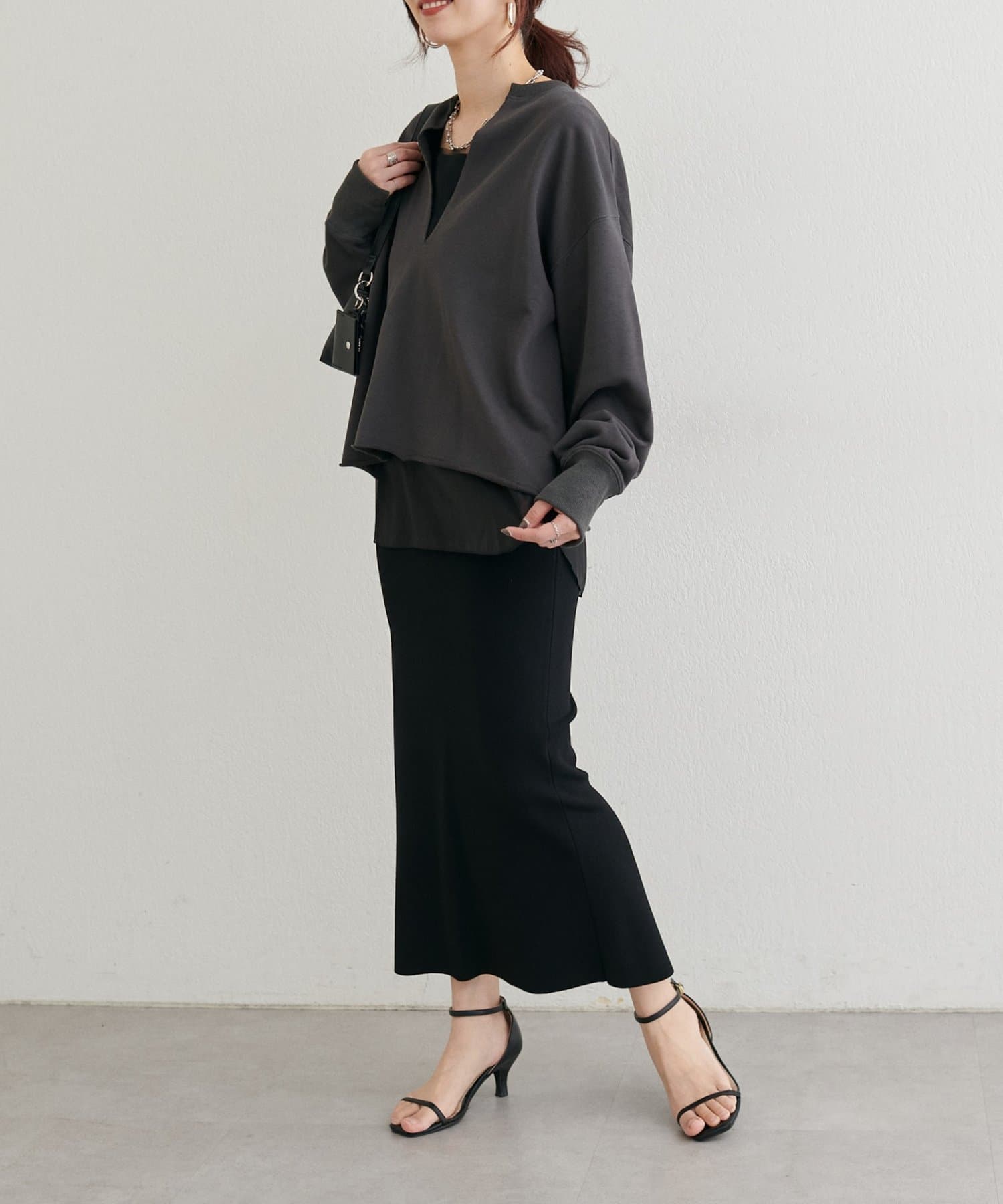 スウェットやカーディガン、Tシャツなど幅広いアイテムとのレイヤードが可能。