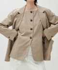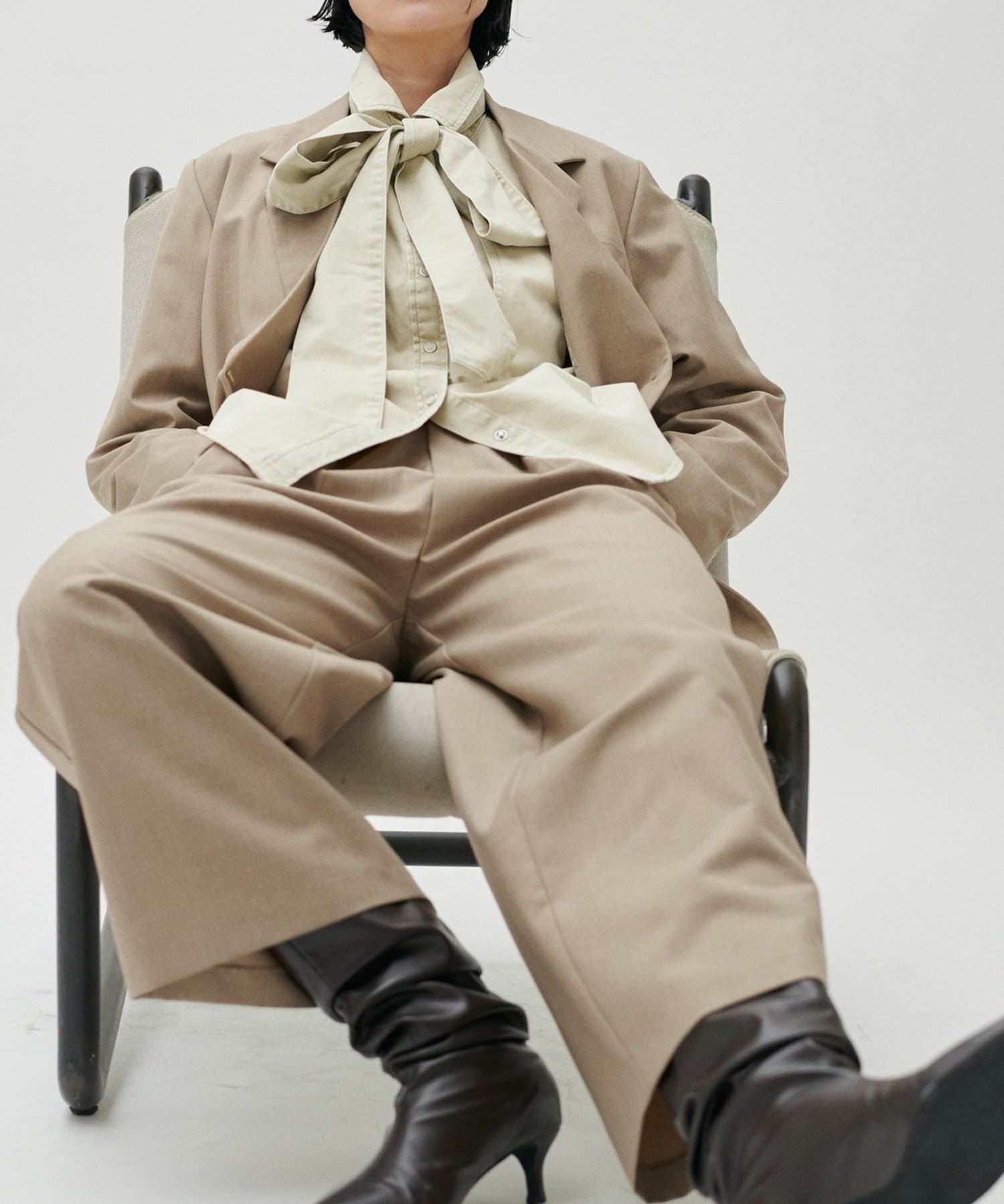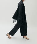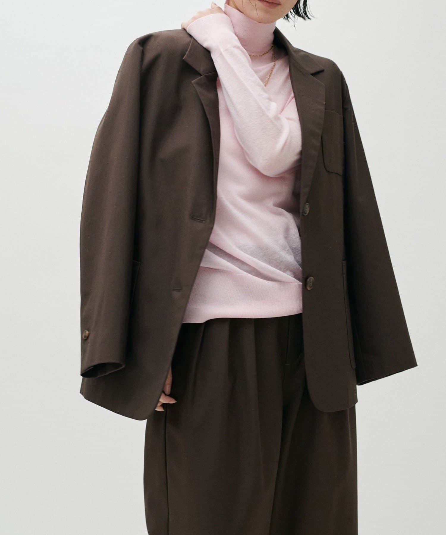 肩まわりや身幅にはゆとりを持たせつつ、全体はすっきりとしたバランスに仕上げ、羽織るだけでこなれた印象に。