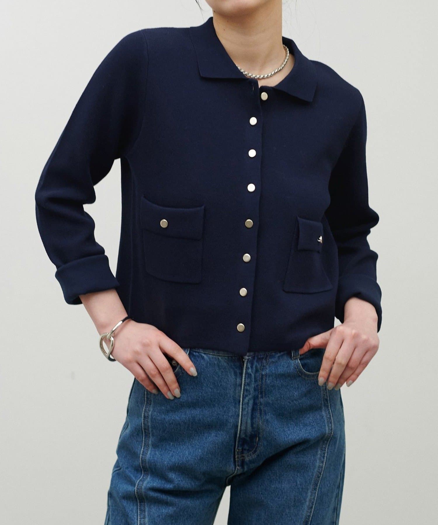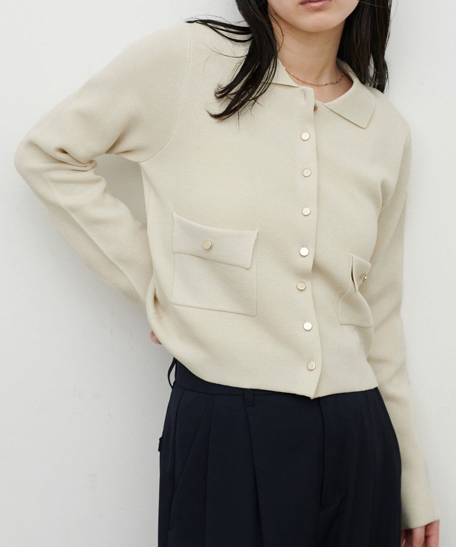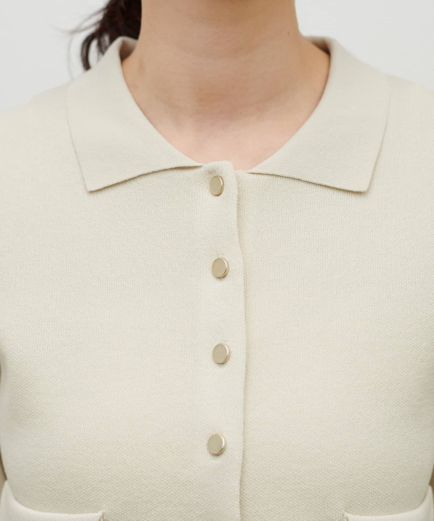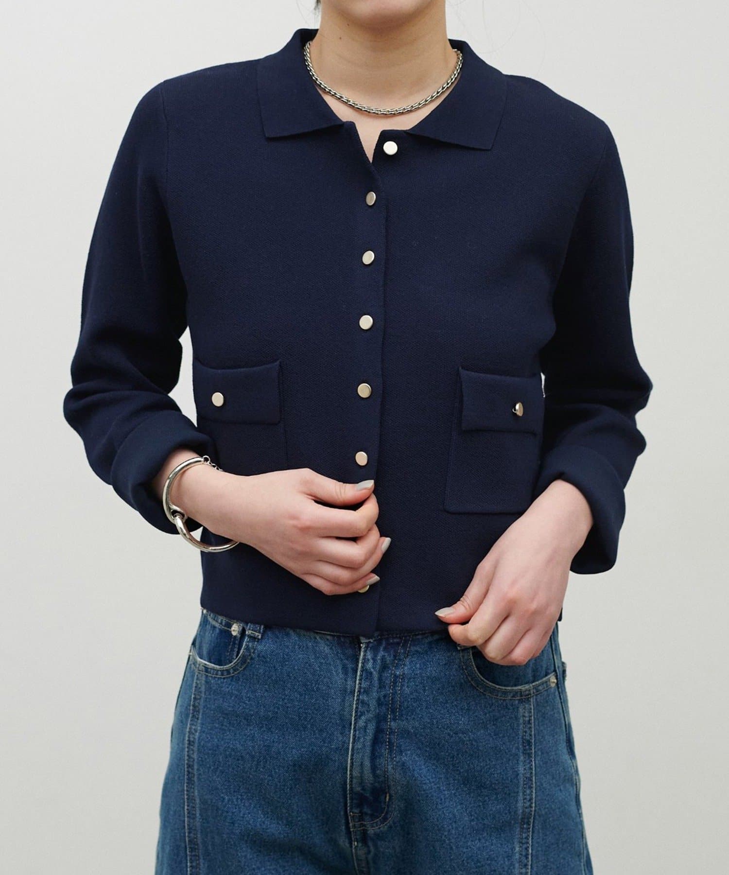 きちんと感と抜け感を両立した、衿付きデザインのニットジャケット。
