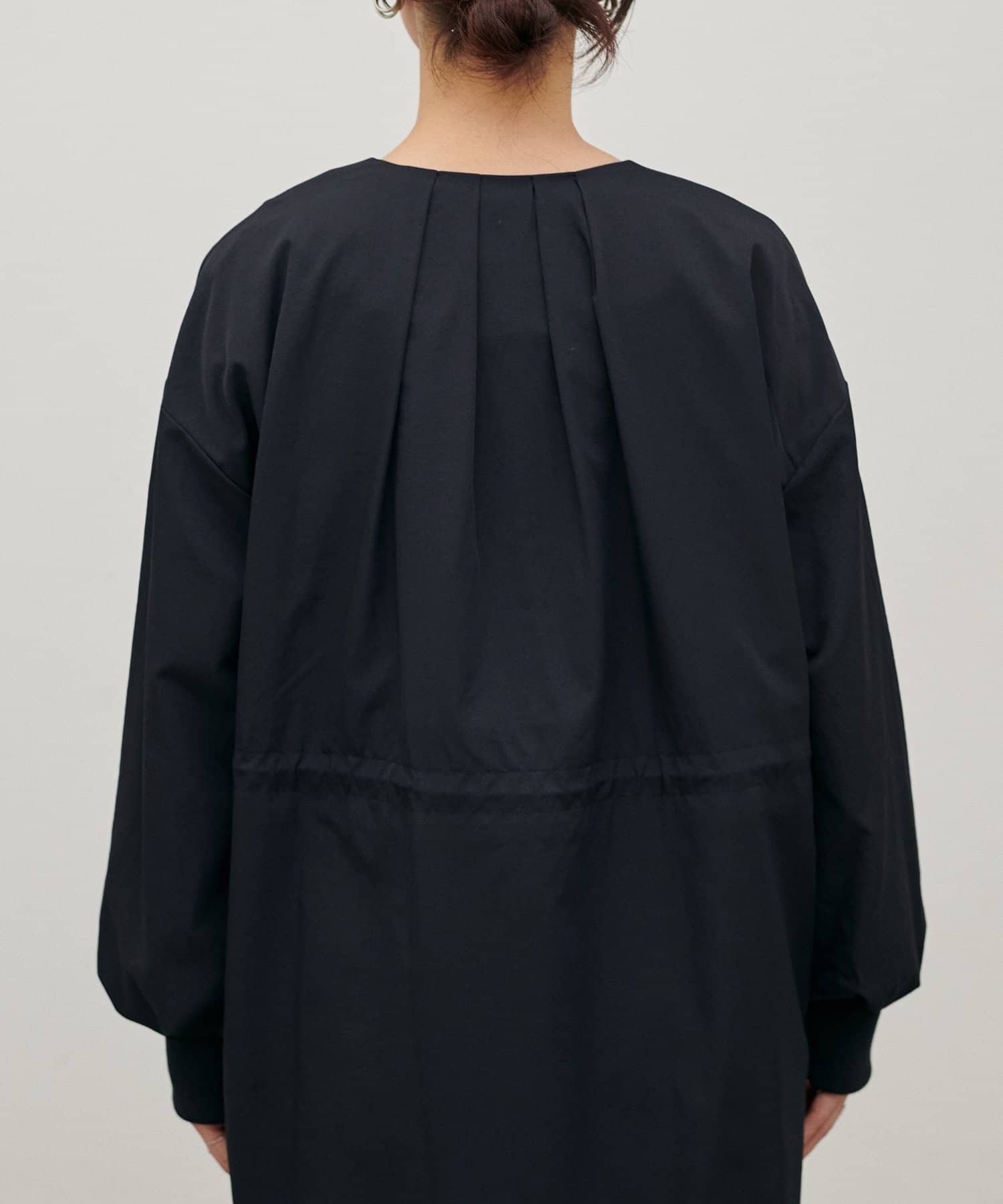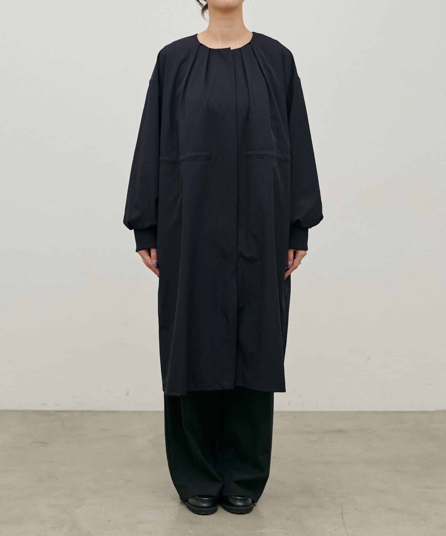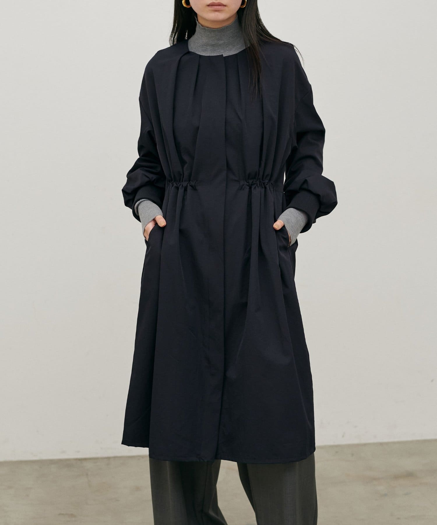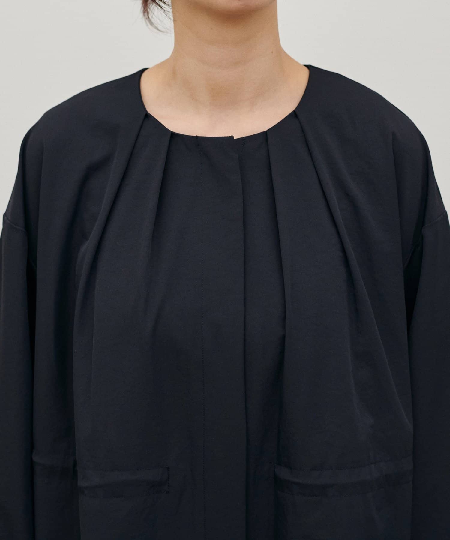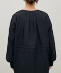 首元すっきりのノーカラーとネックに寄せたギャザーできれいめ上品な印象に。