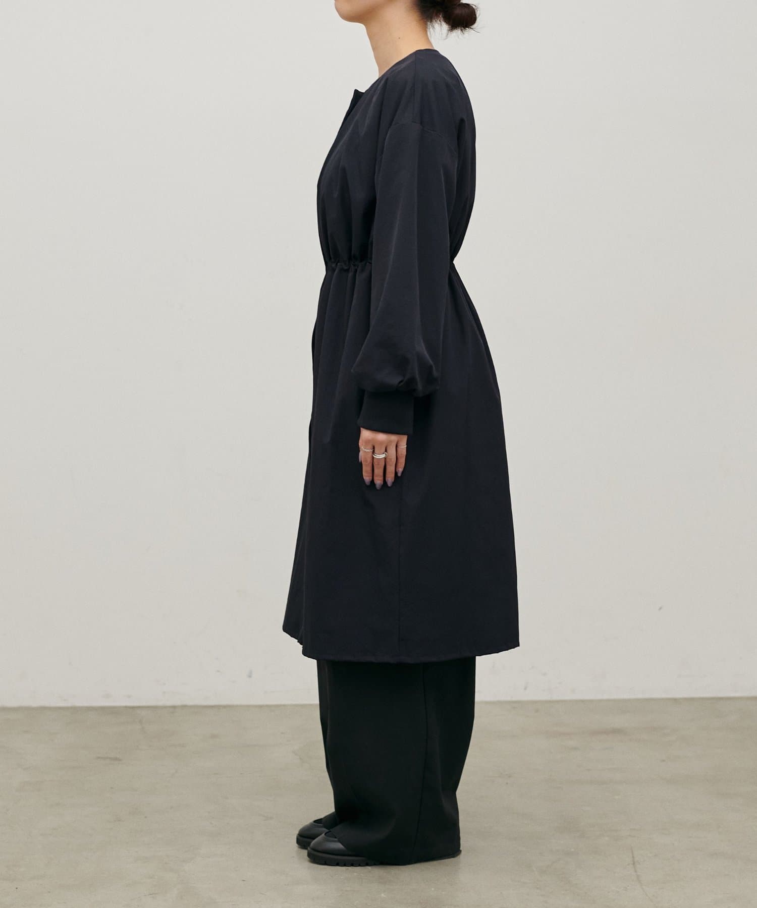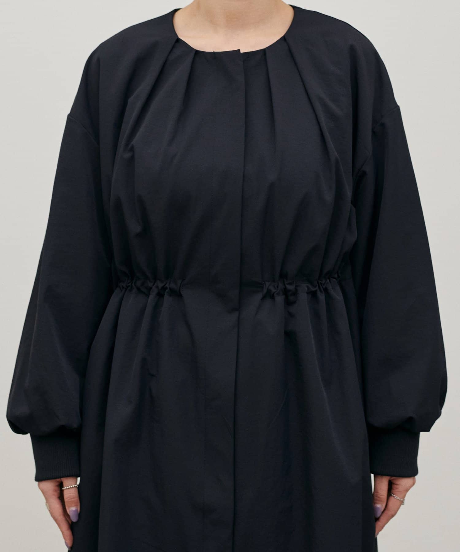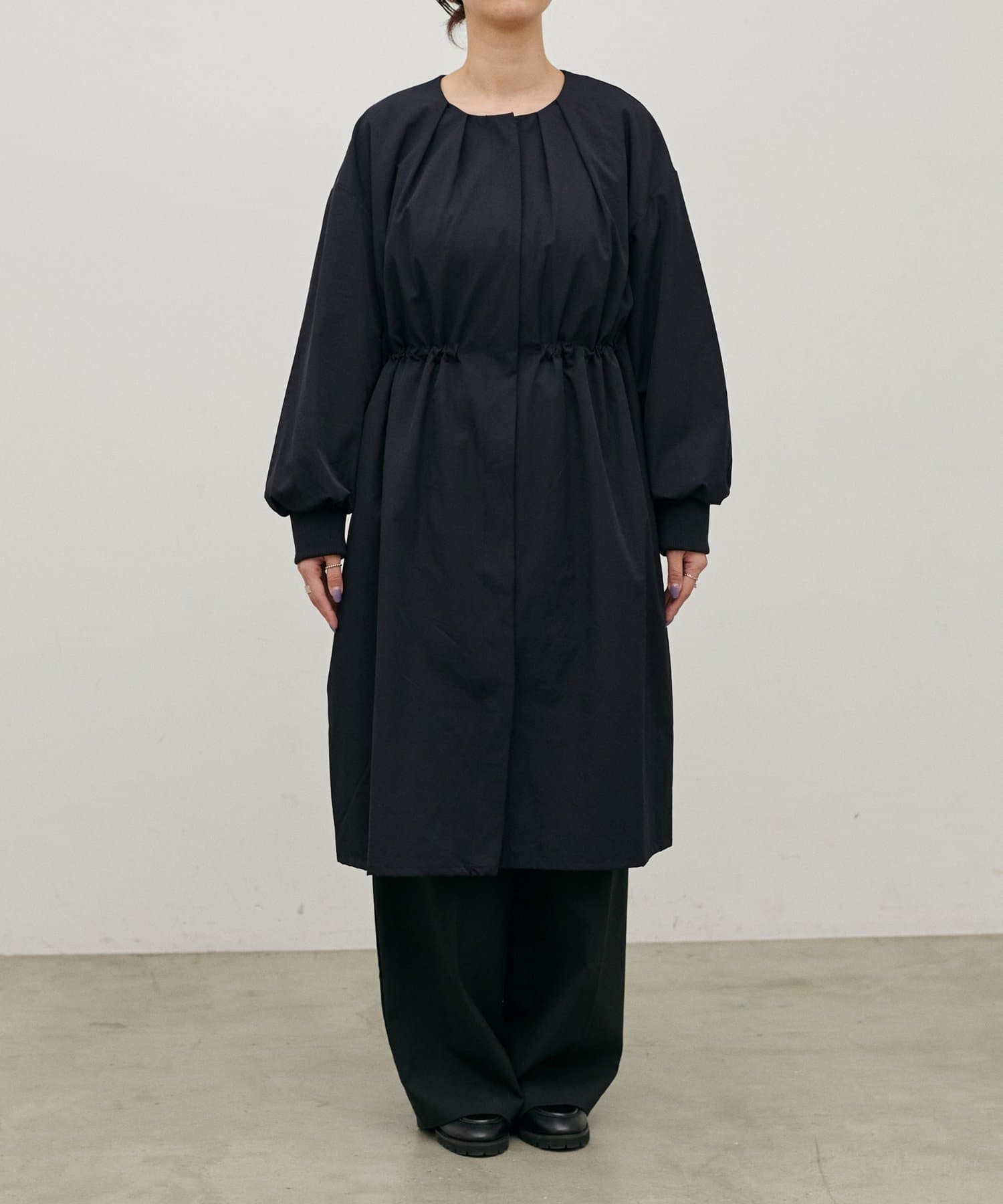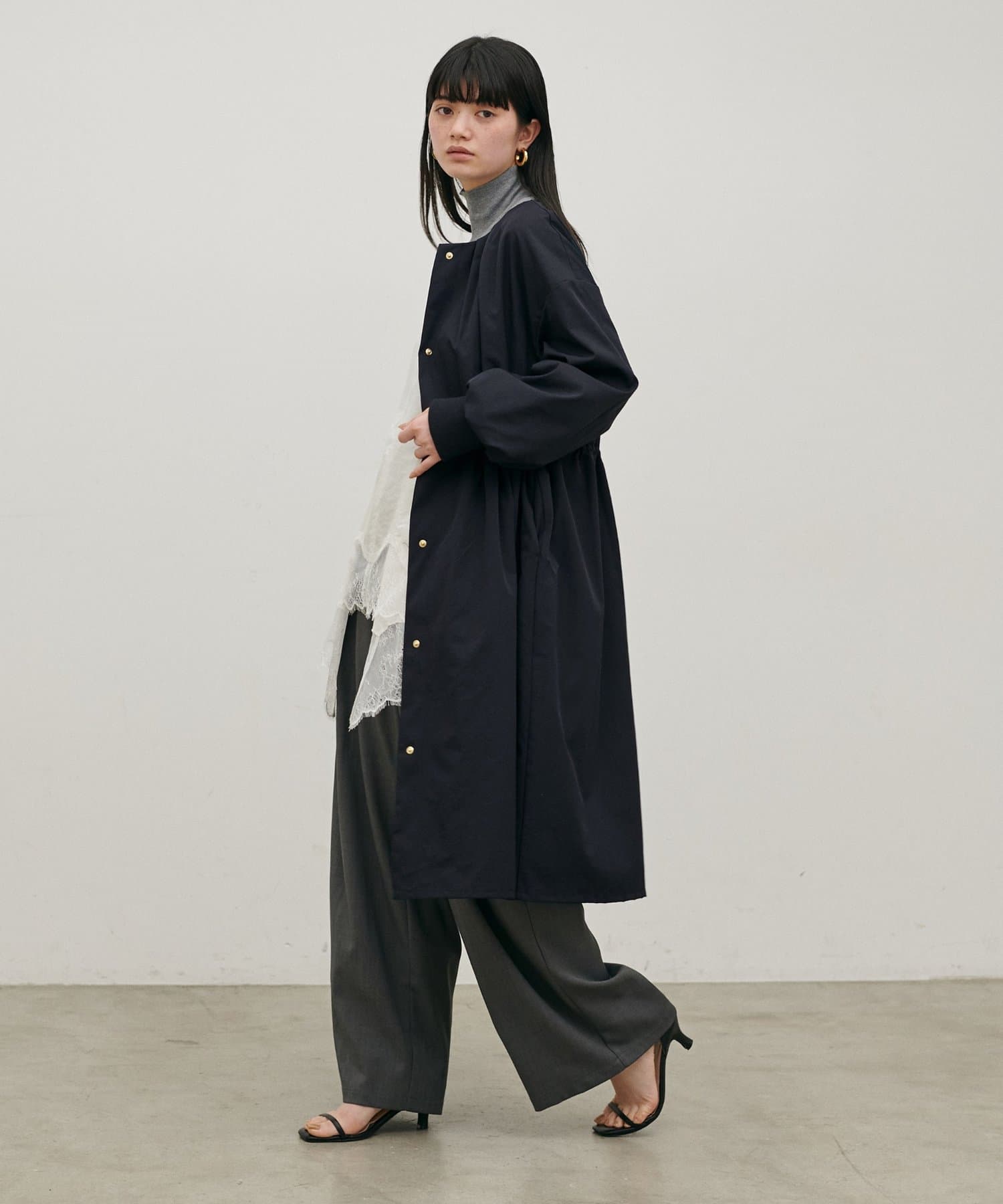 首元すっきりのノーカラーとネックに寄せたギャザーできれいめ上品な印象に。