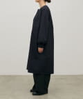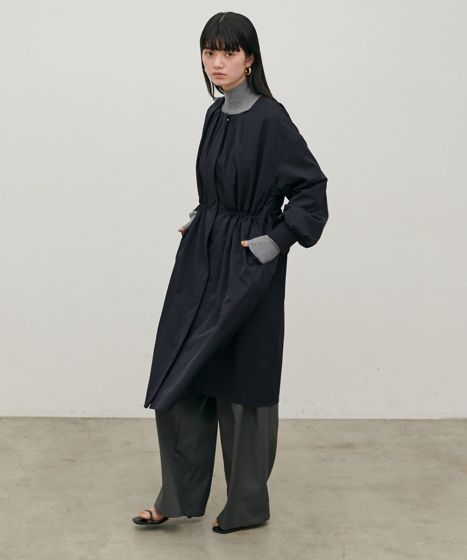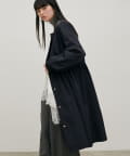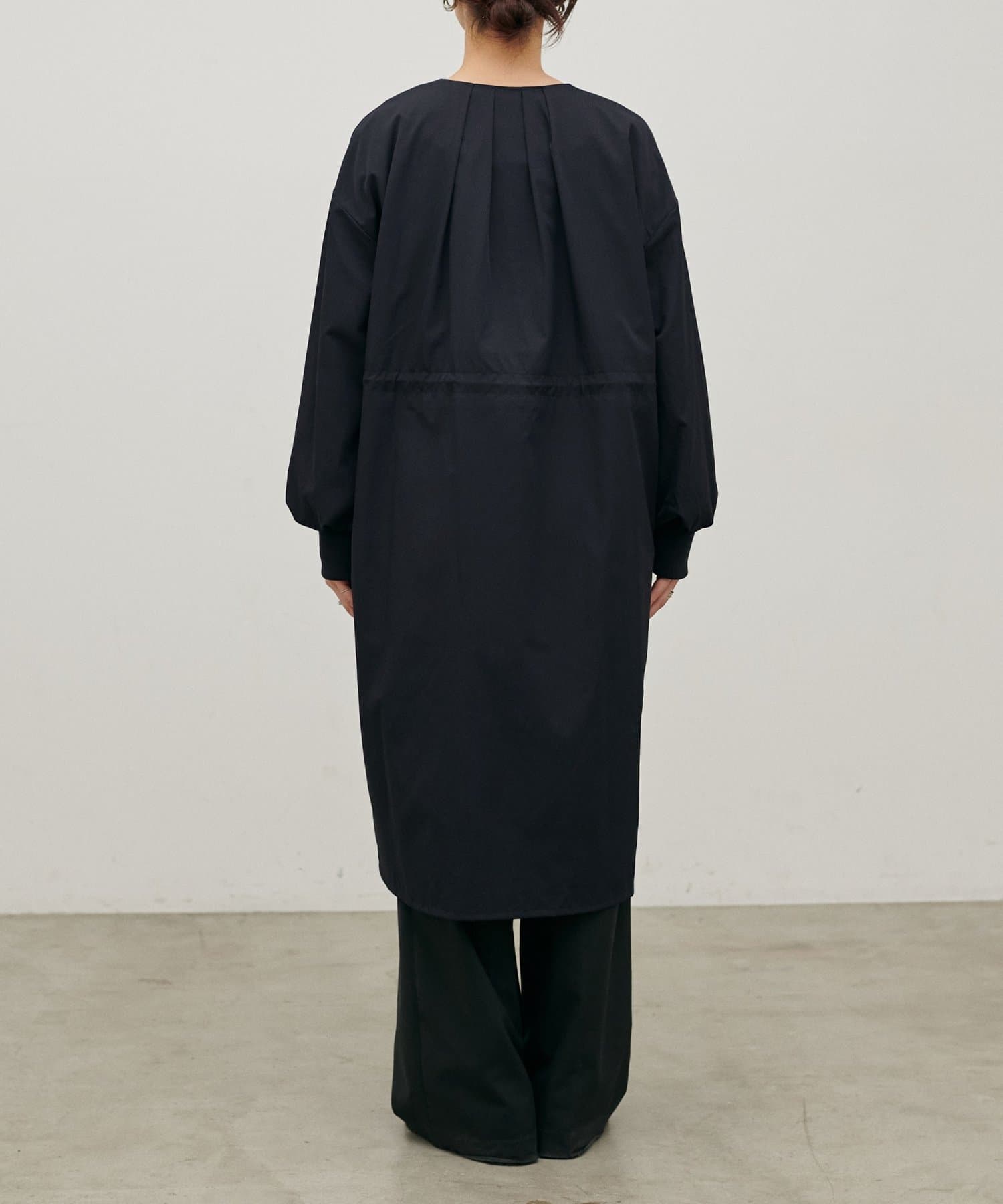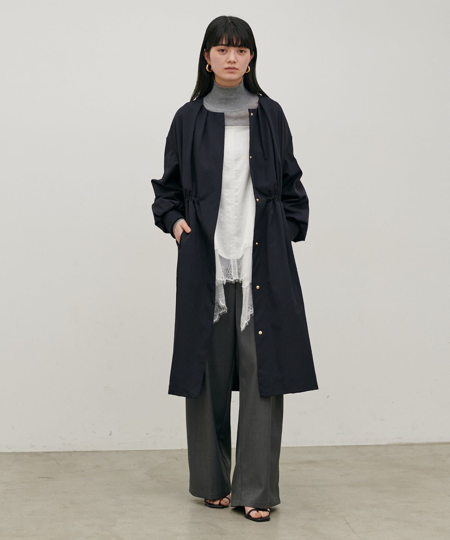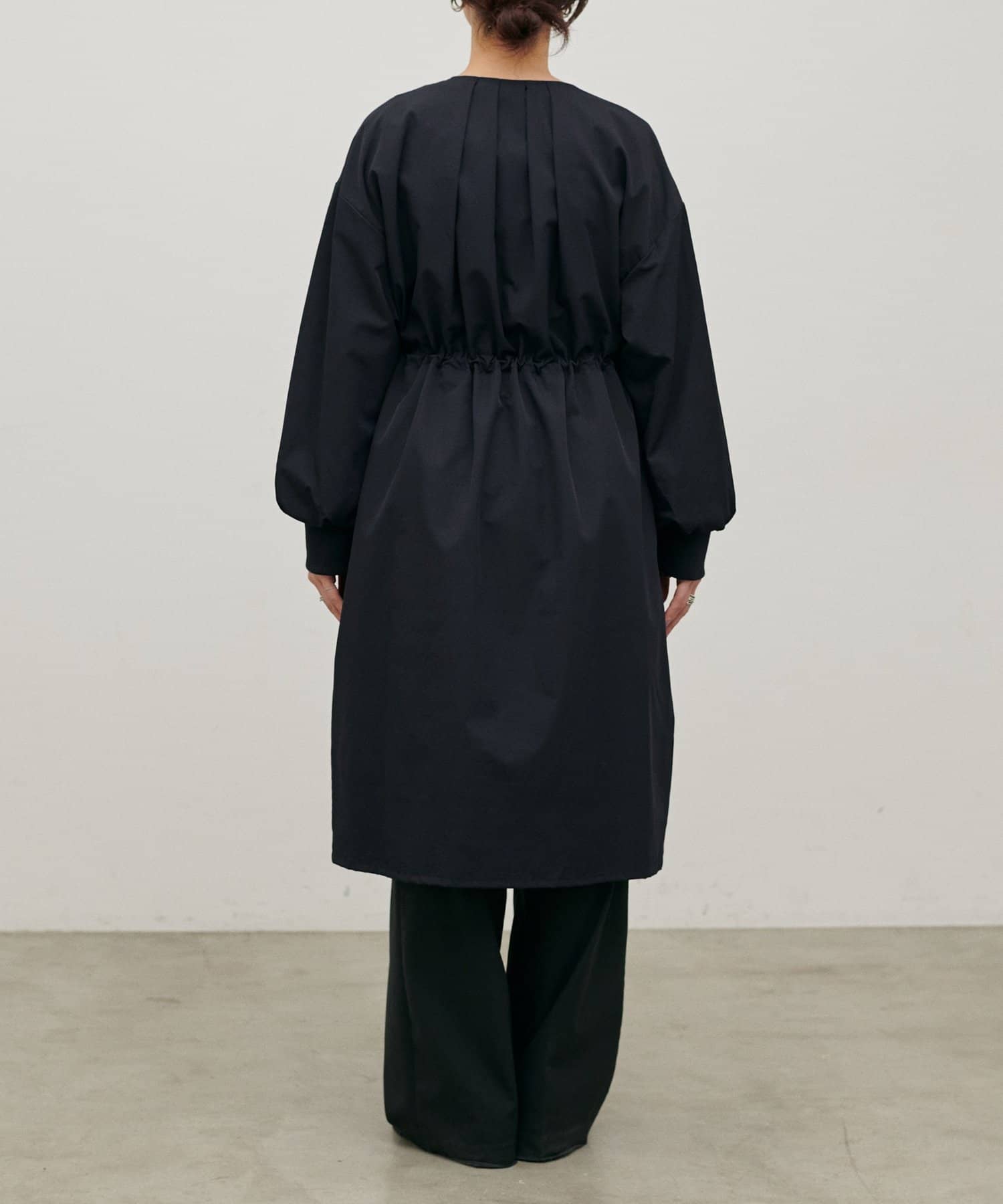 首元すっきりのノーカラーとネックに寄せたギャザーできれいめ上品な印象に。