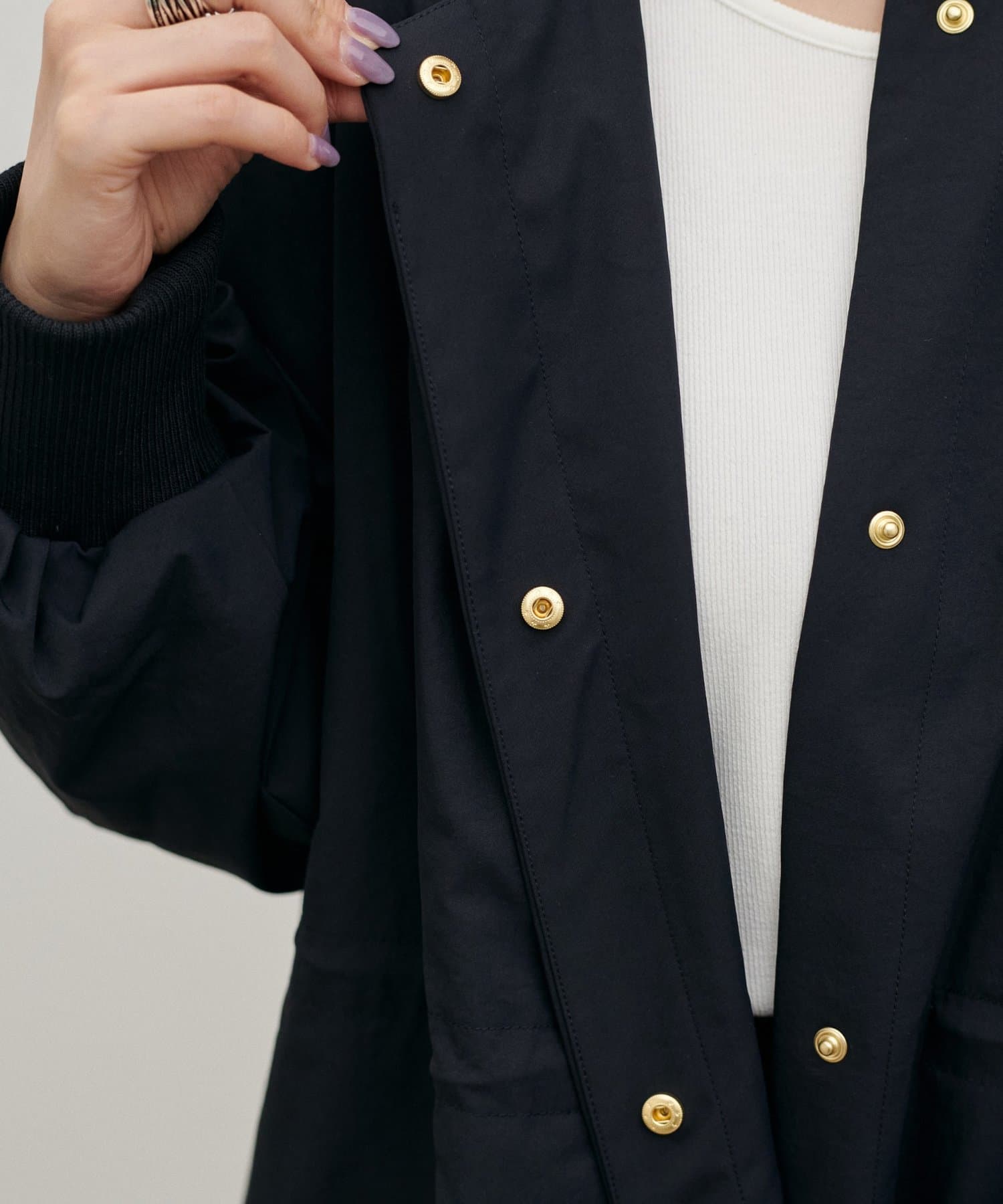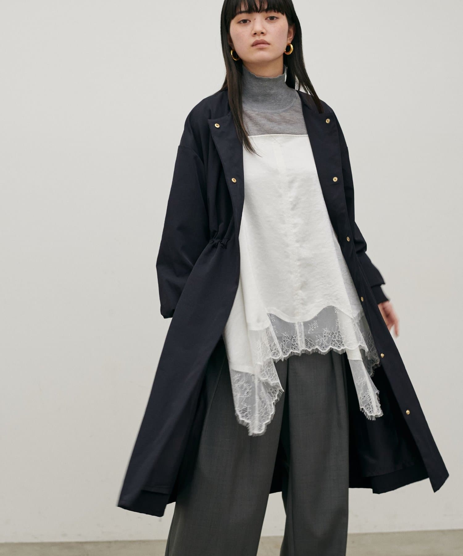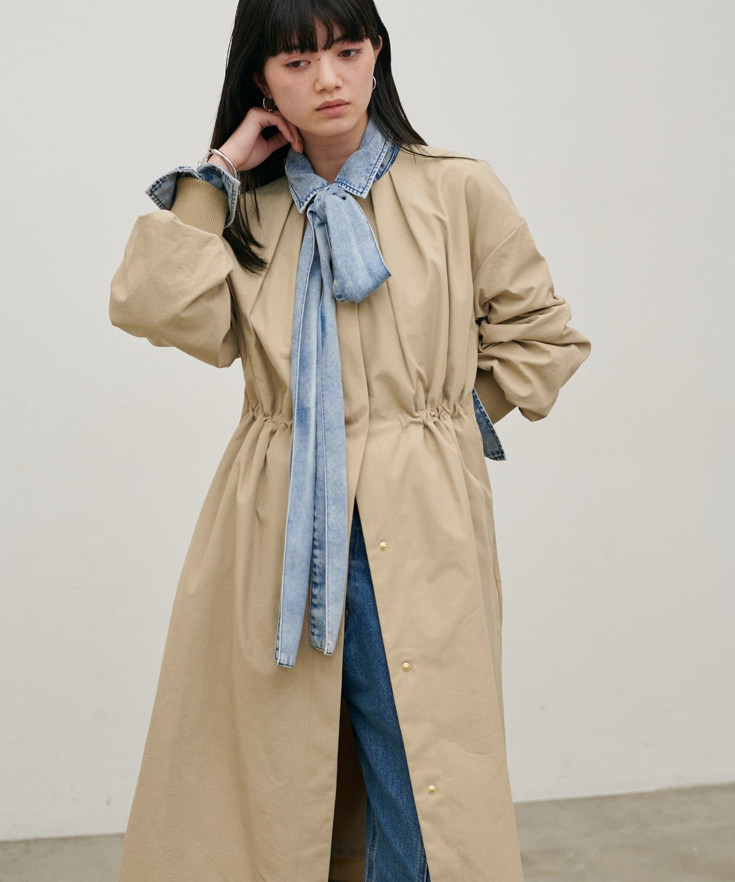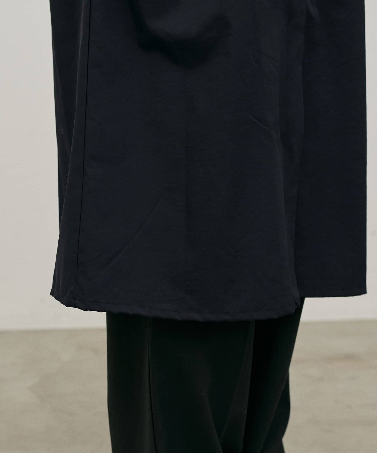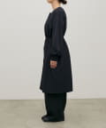 首元すっきりのノーカラーとネックに寄せたギャザーできれいめ上品な印象に。