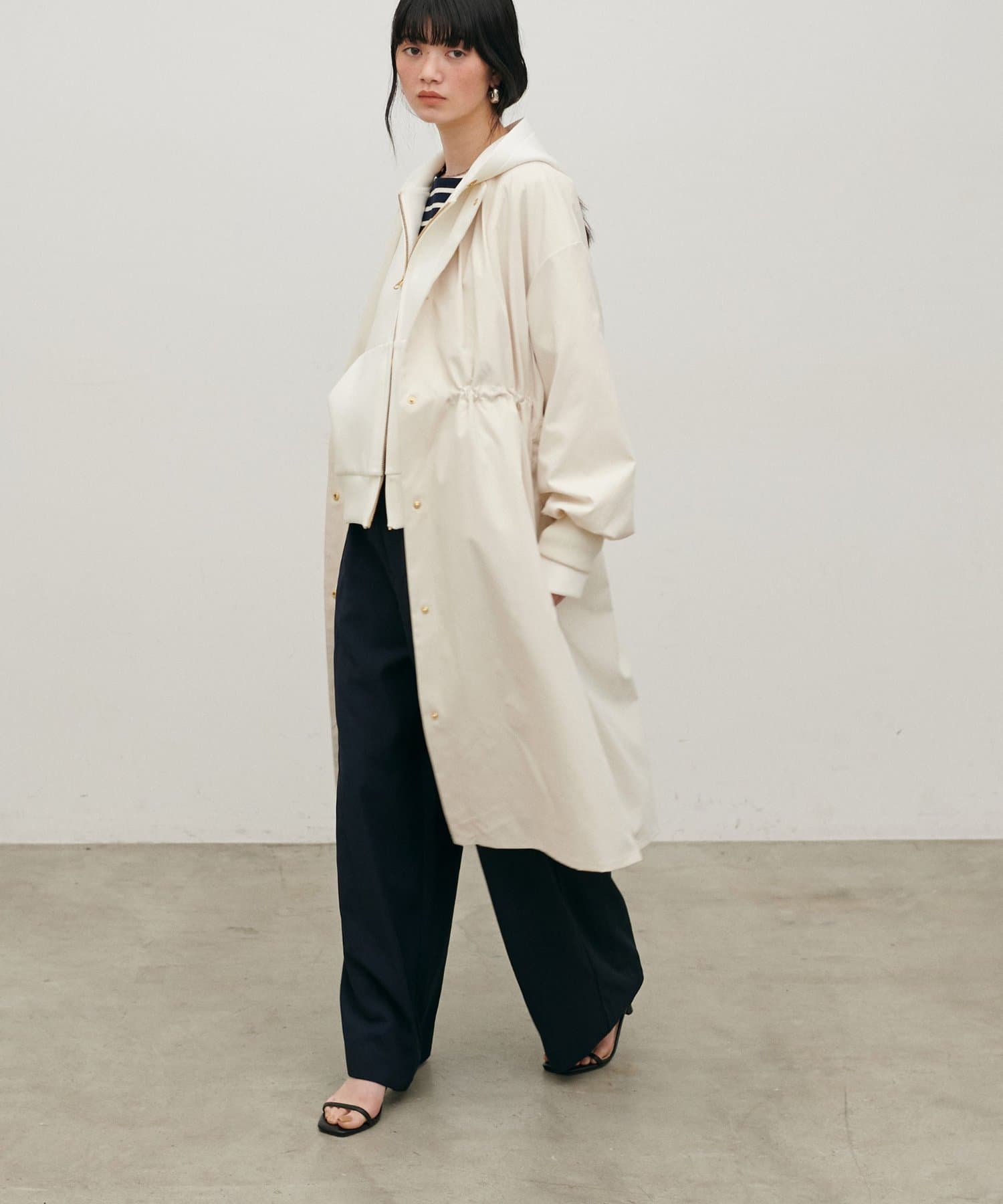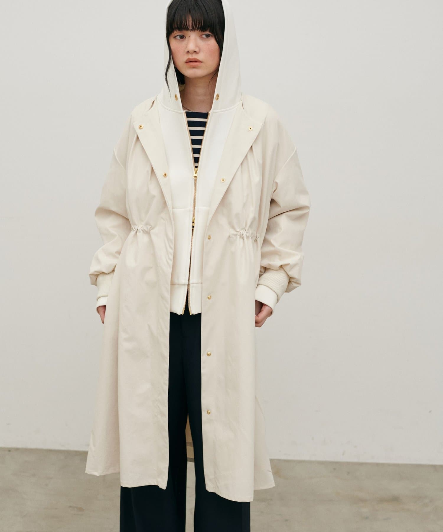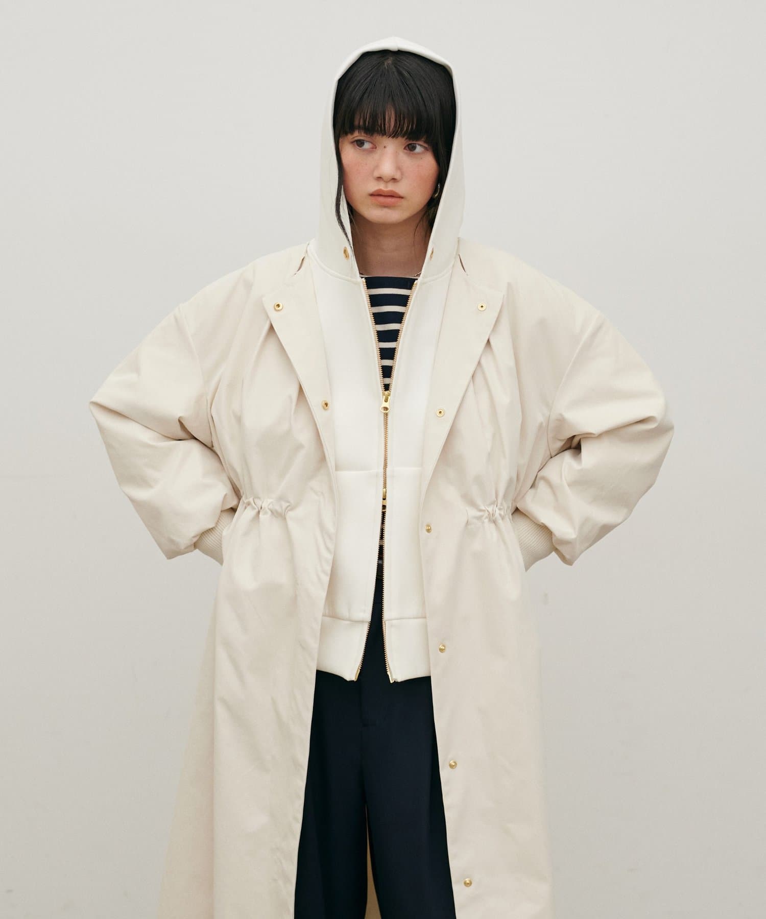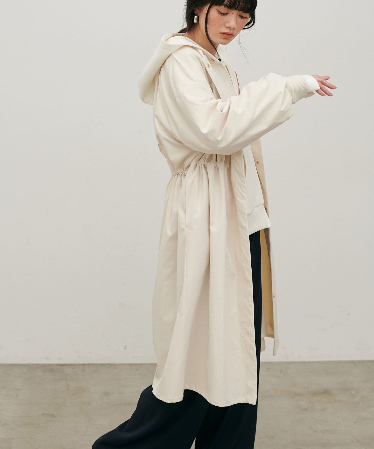 内側のドロストを調整すれば、ウエストマークが可能になり、