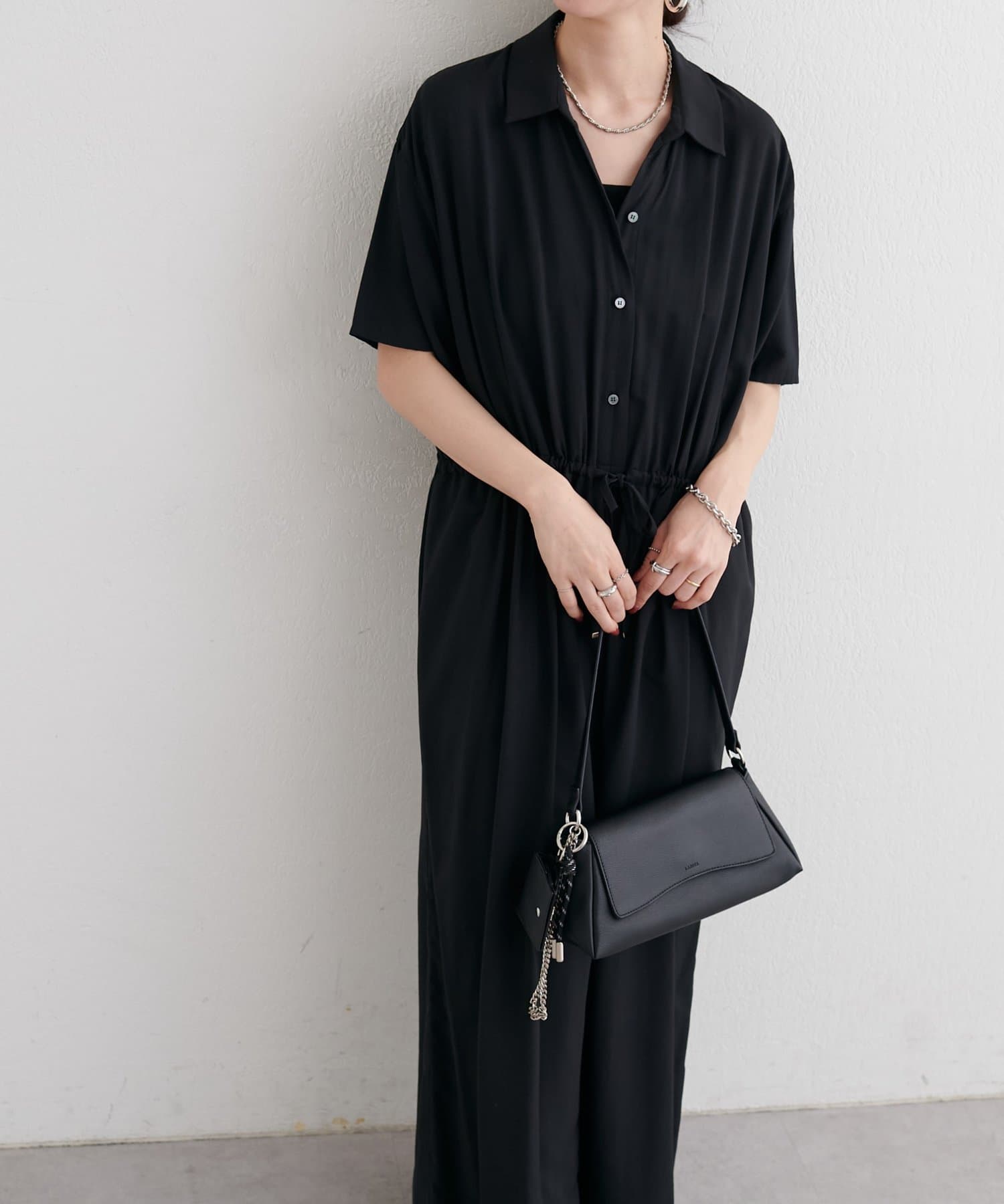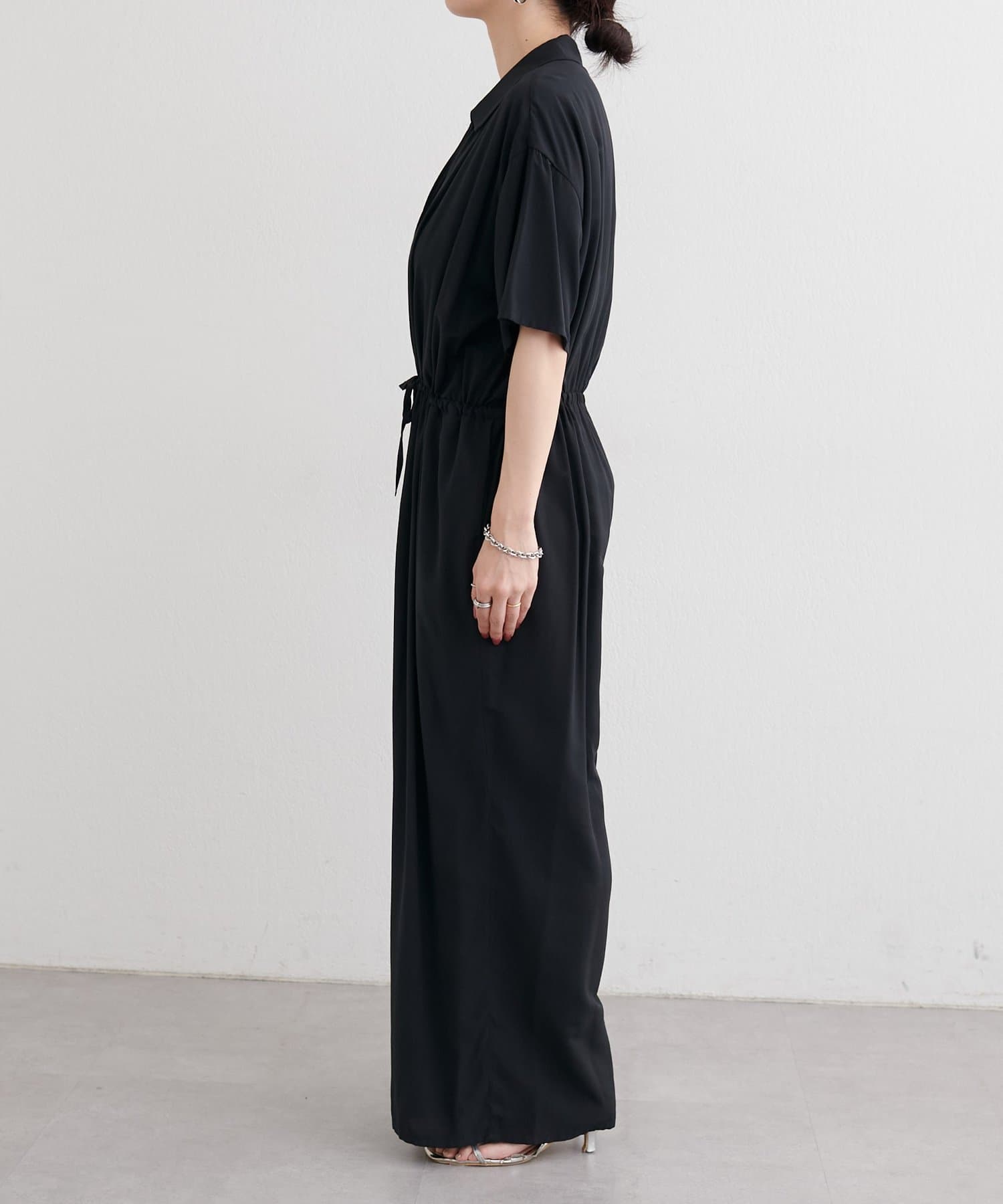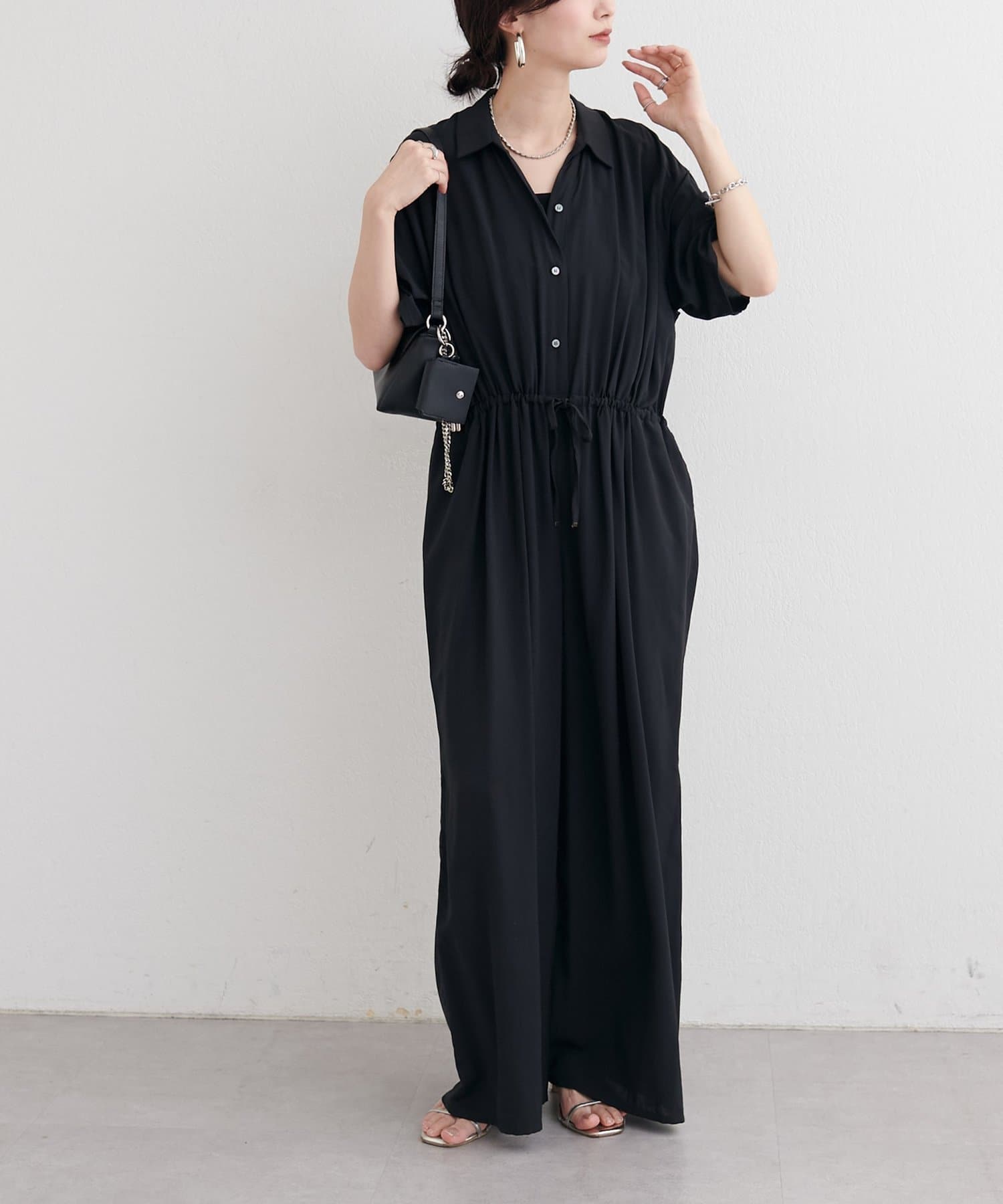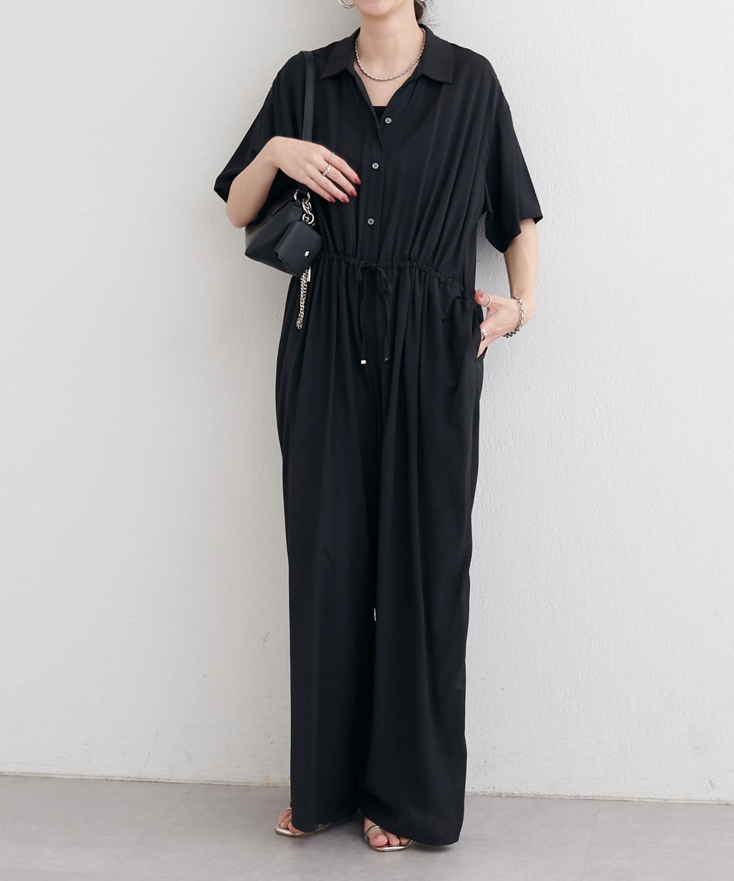 落ち感のあるなめらかな素材で仕立てた、大人な印象のオールインワン。
