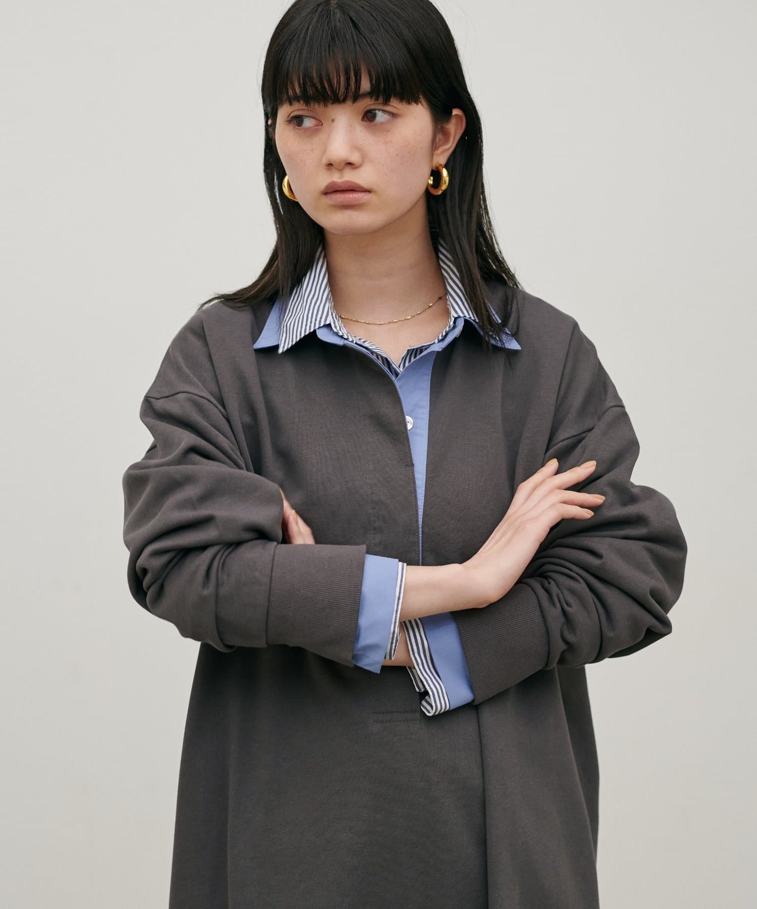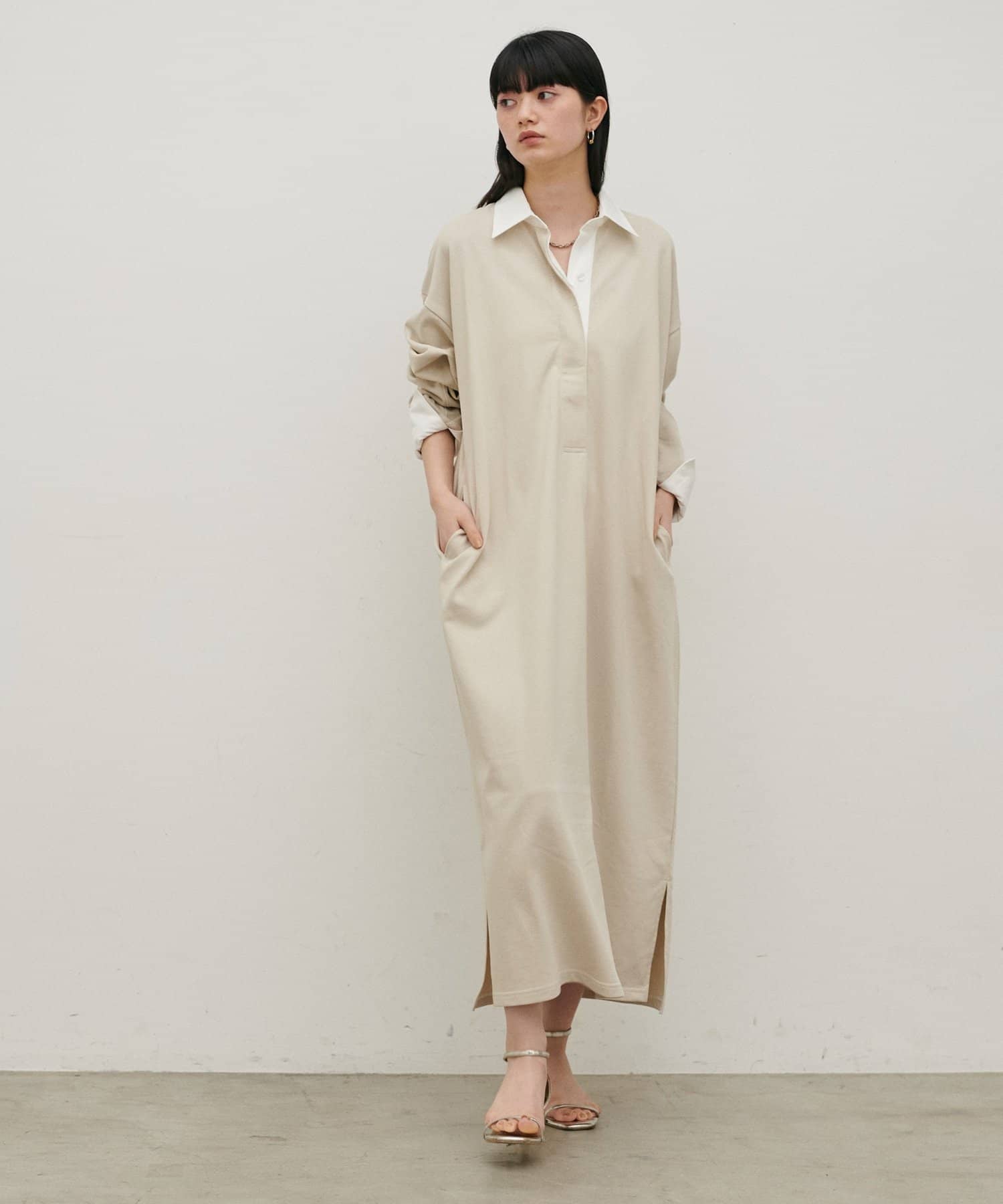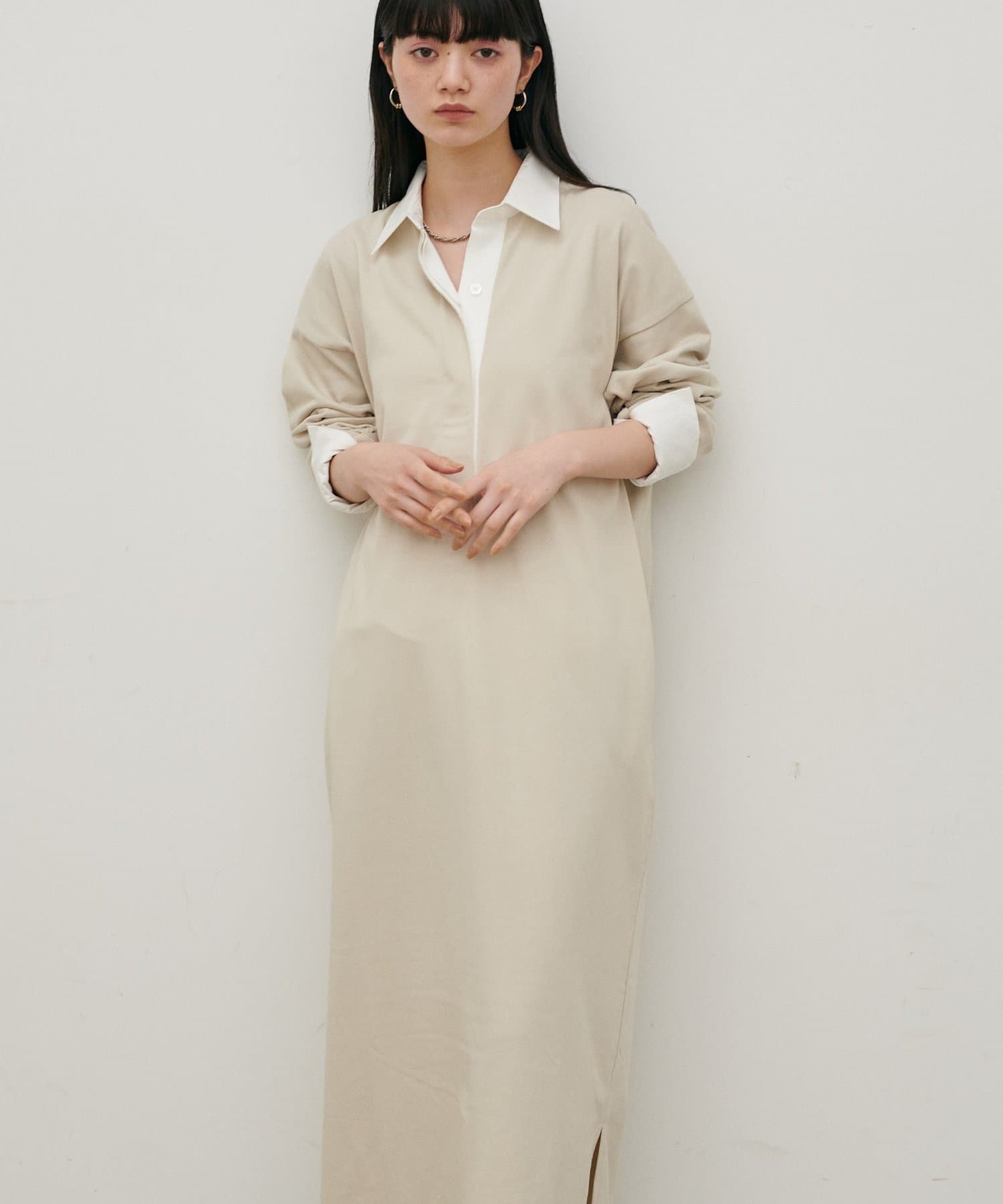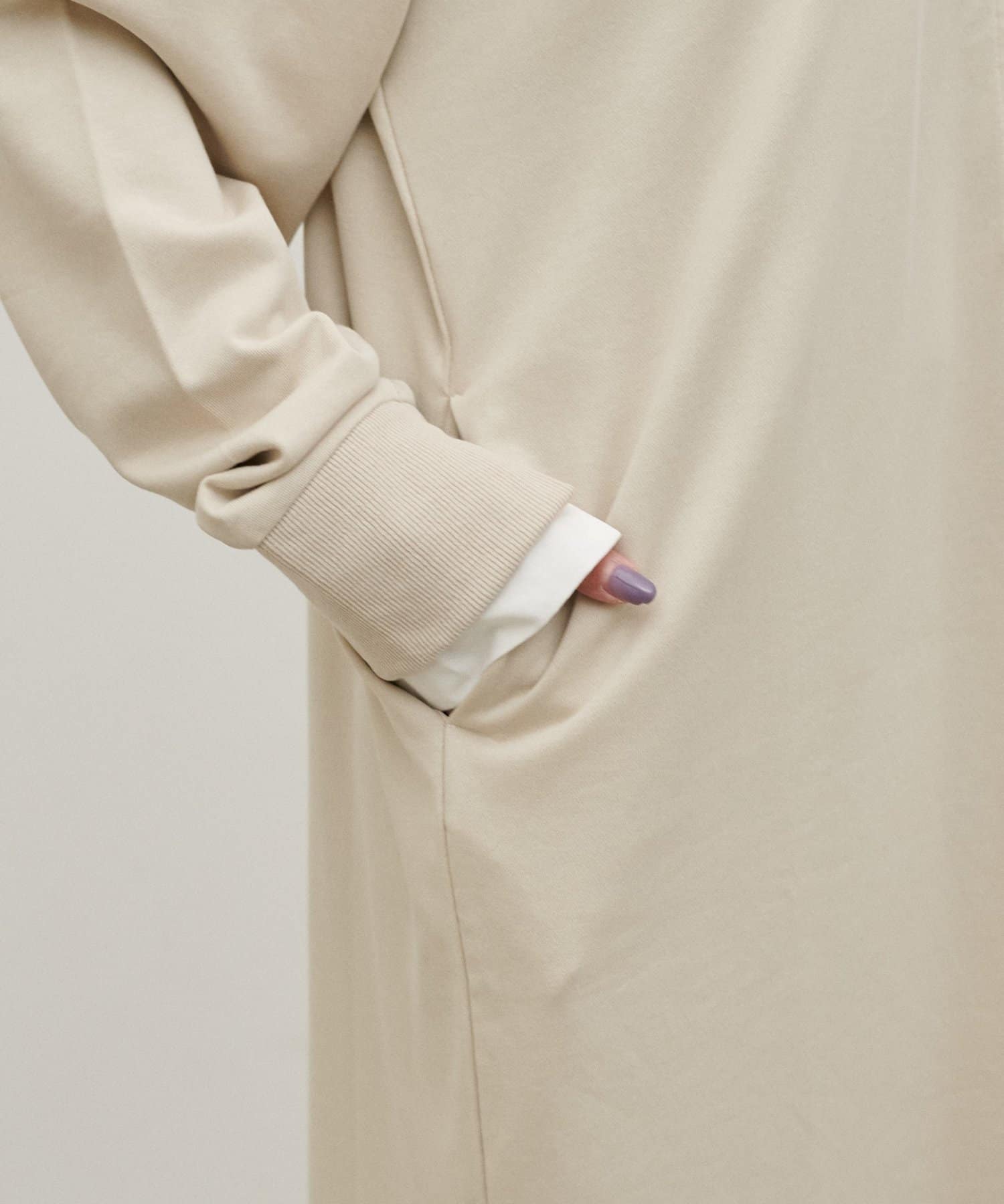身体のラインを拾いにくいゆとりのあるシルエットで、ストンと落ちるIラインがすっきりとした印象に。