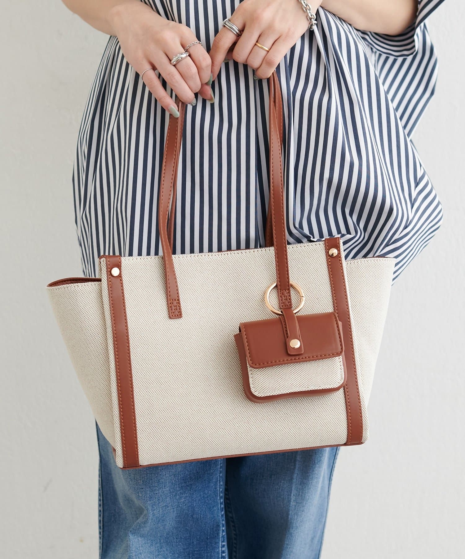 取り外し可能なミニポーチ付きで、アクセサリーや鍵など小物の収納にも最適。