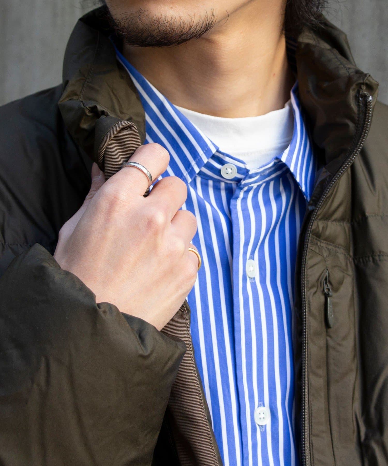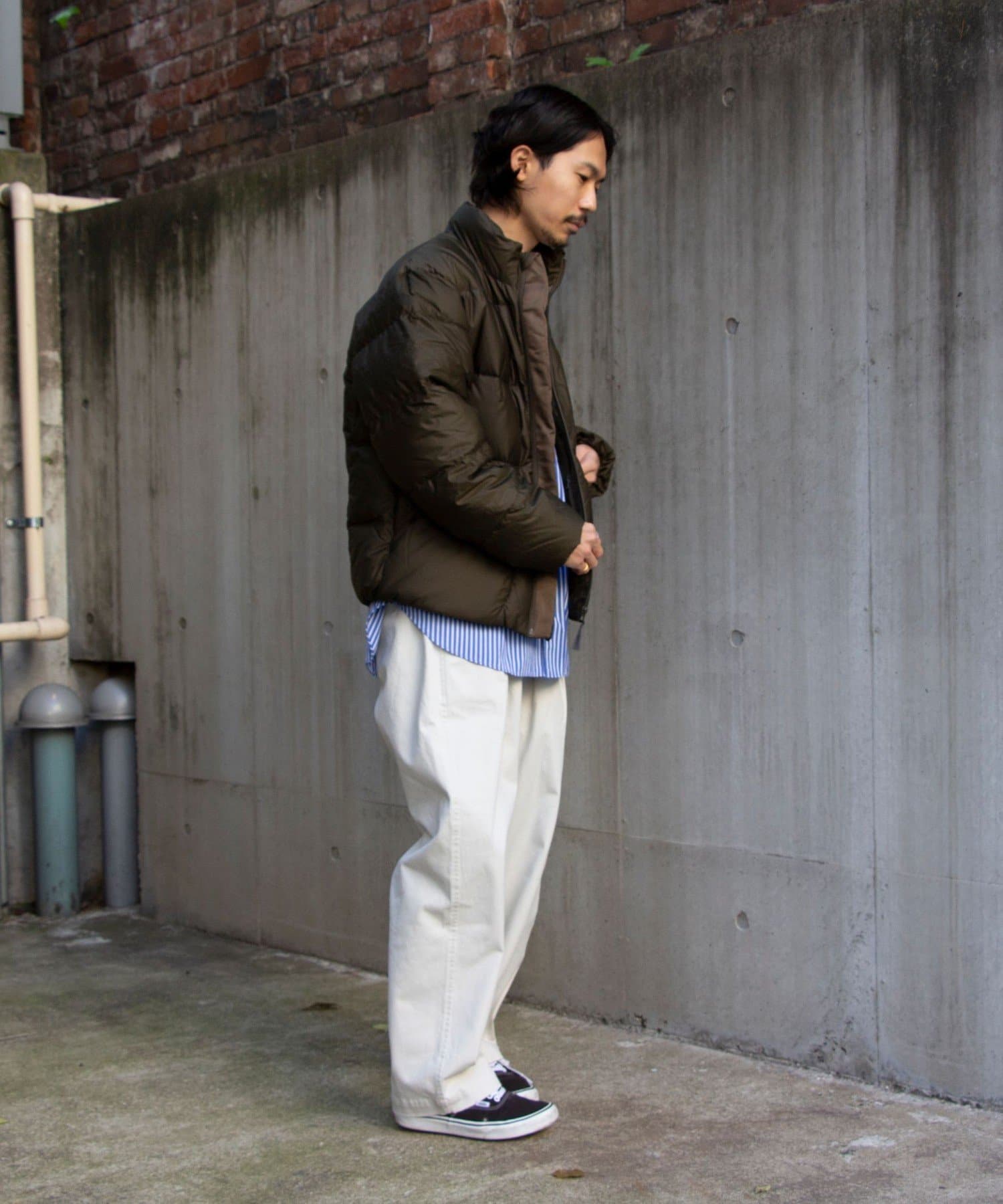 シンプルな配色と少し短めの着丈で、適度なボリューム感はありながらもすっきりした印象に。