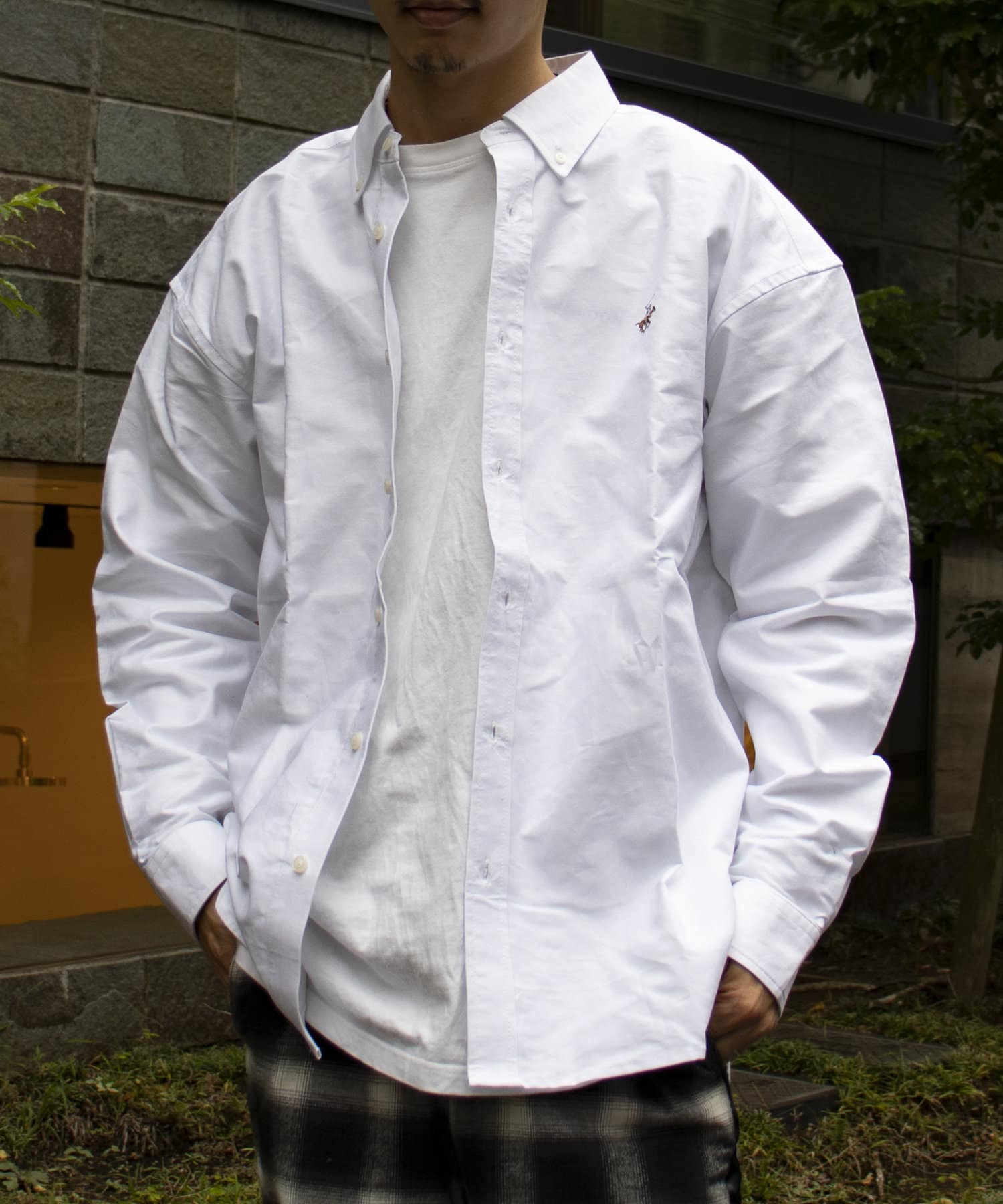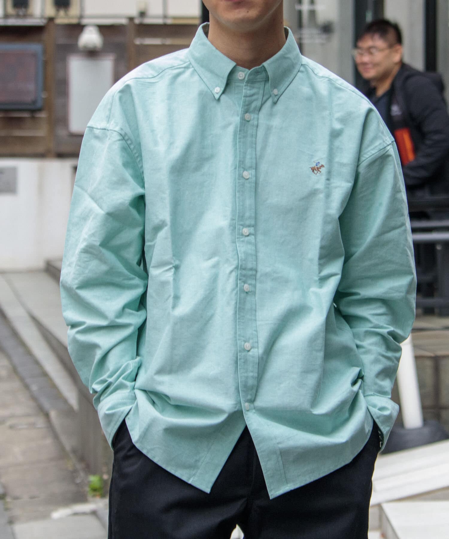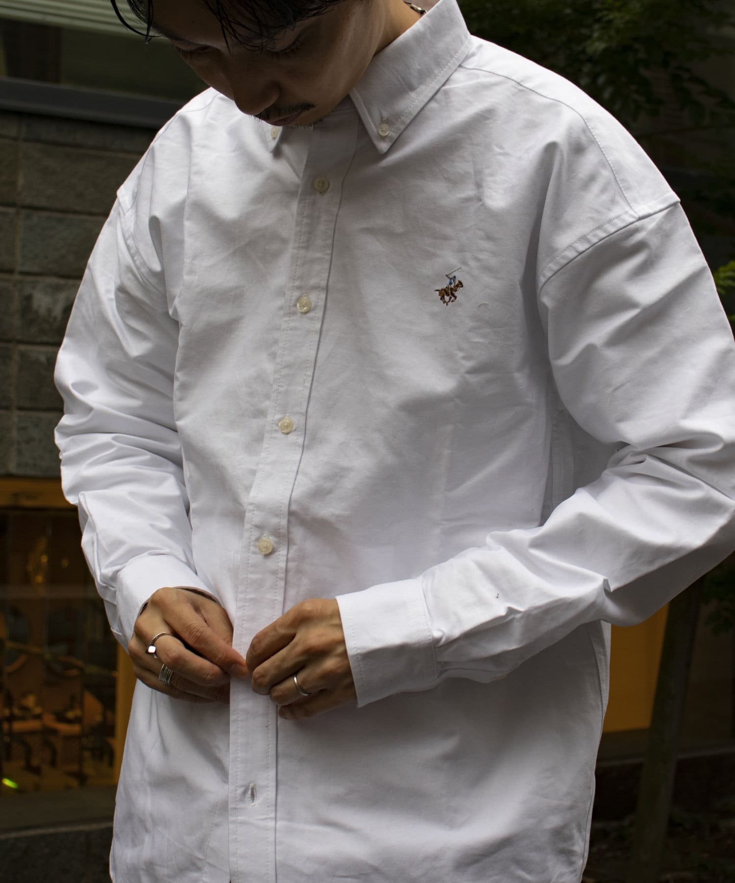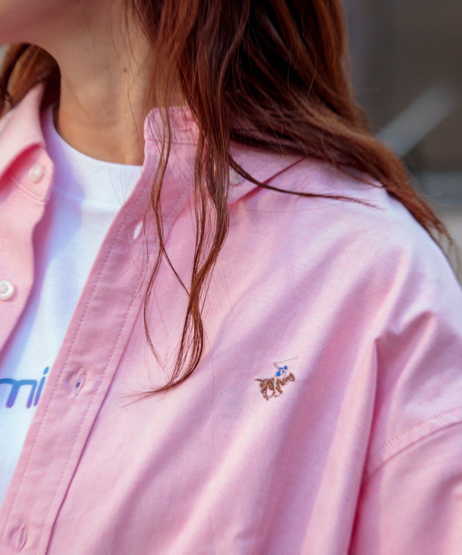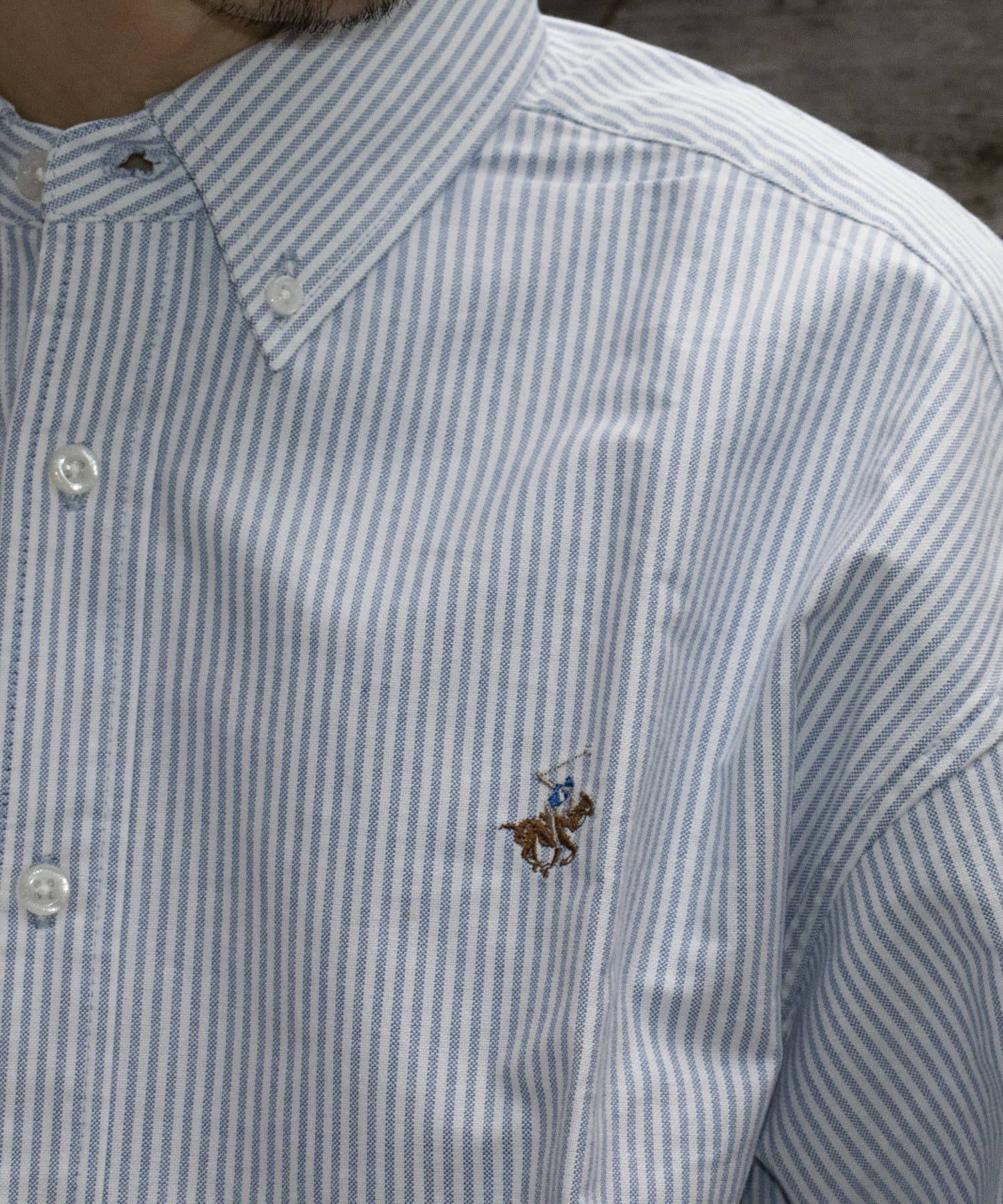 古着から再熱しているトレンドのワンポイント刺繍ロゴ入りのオックス素材の長袖ボタンダウンシャツです。