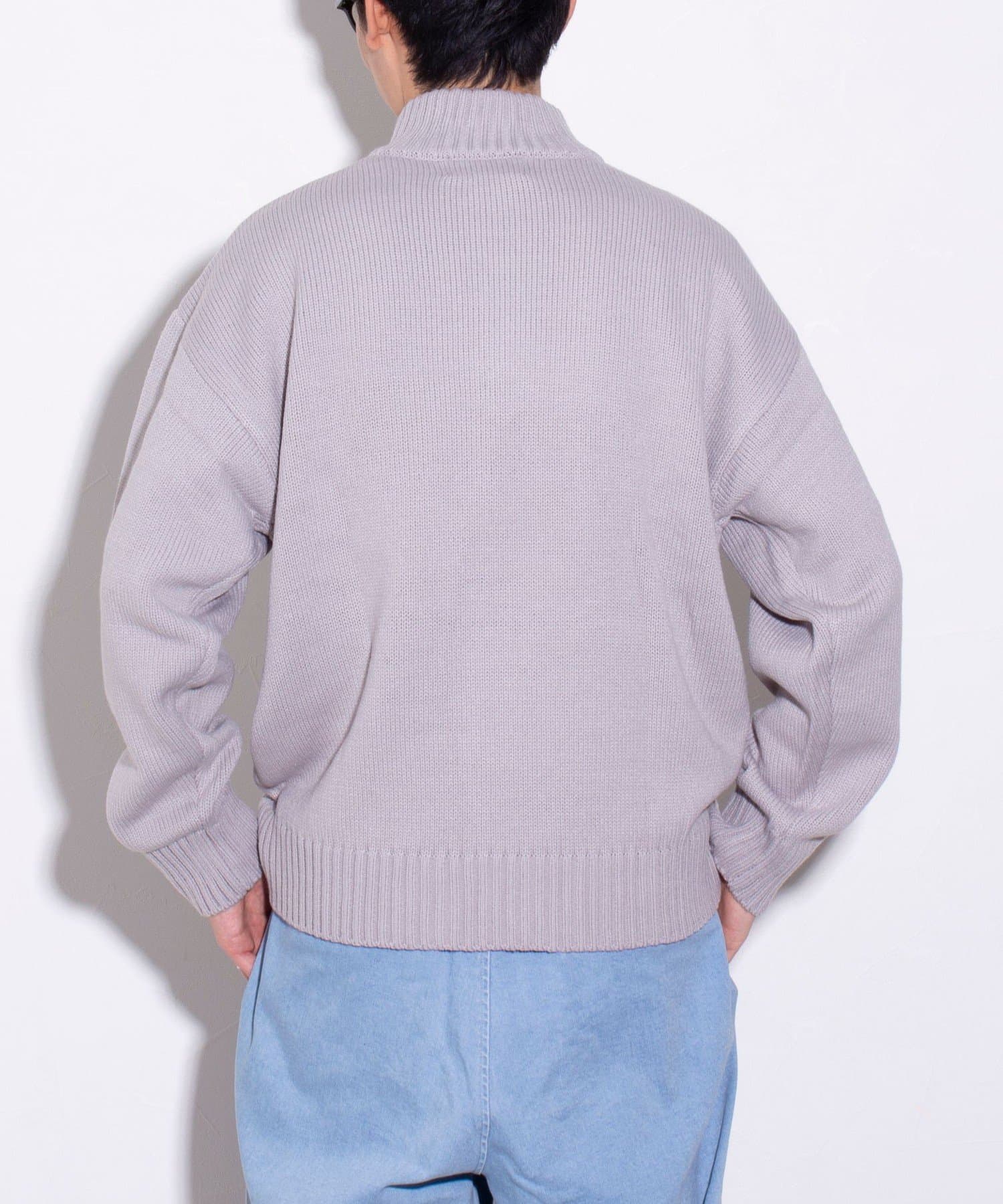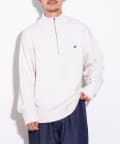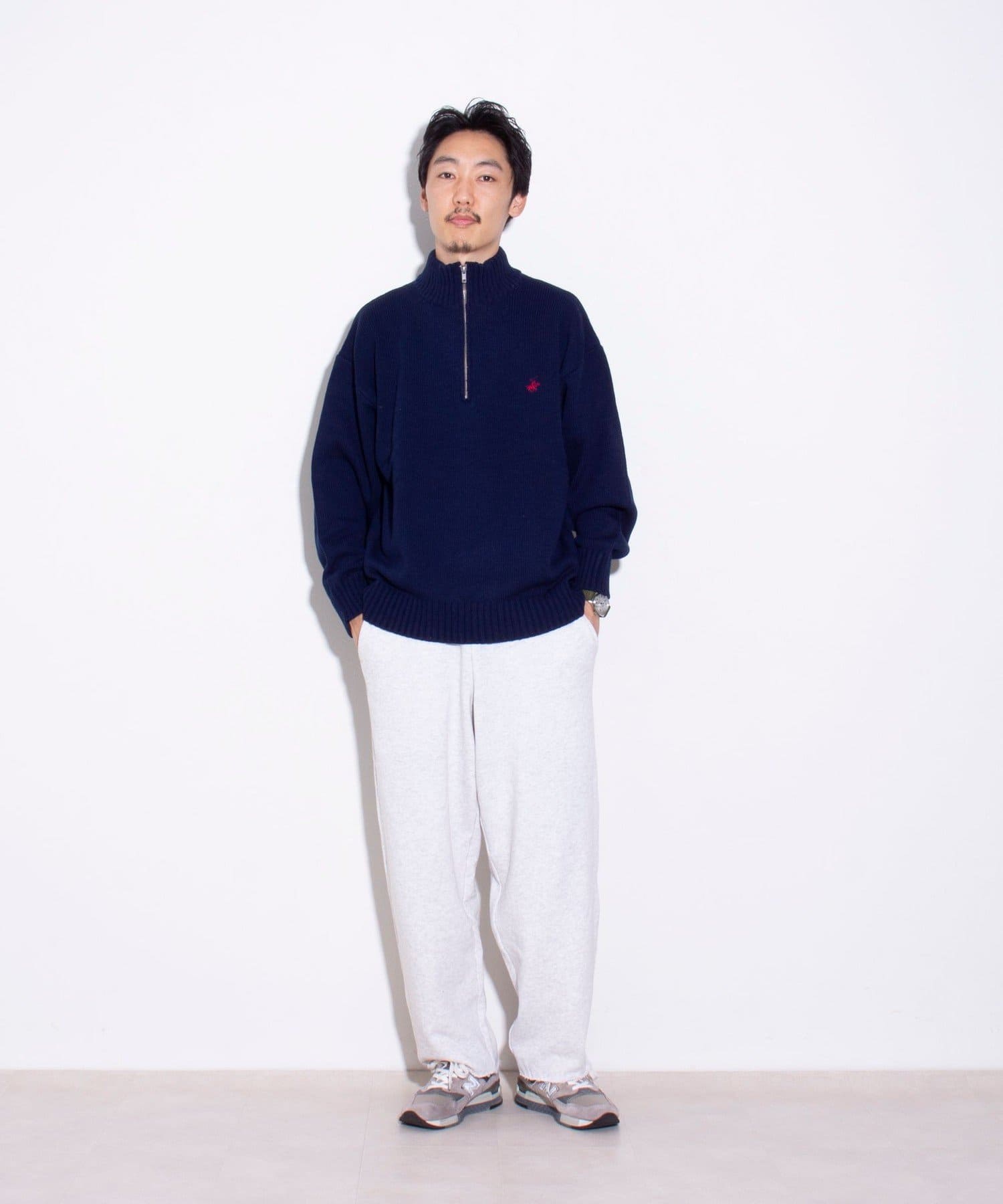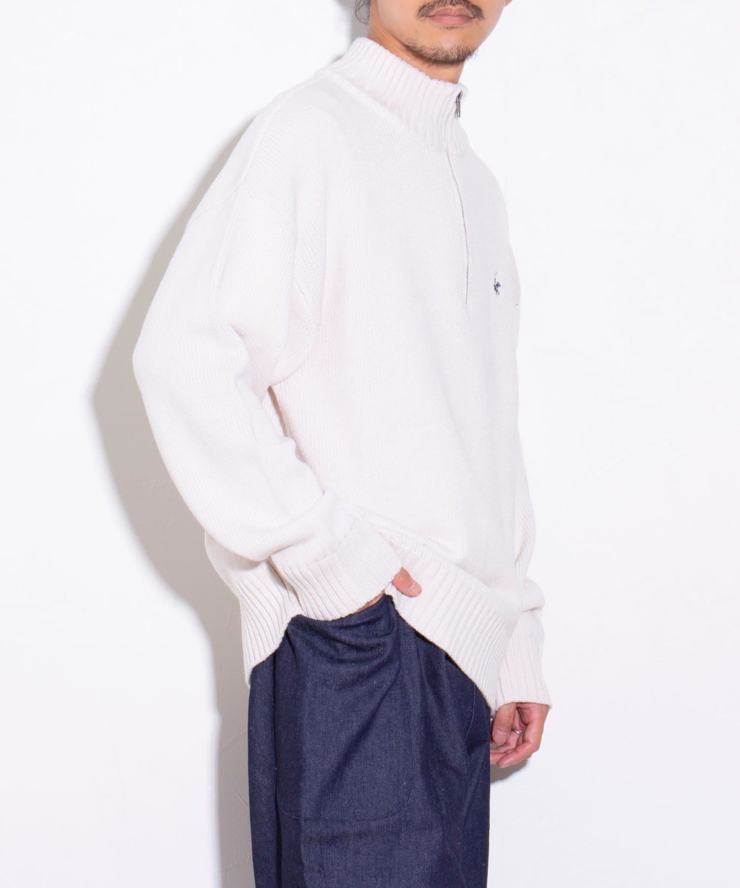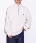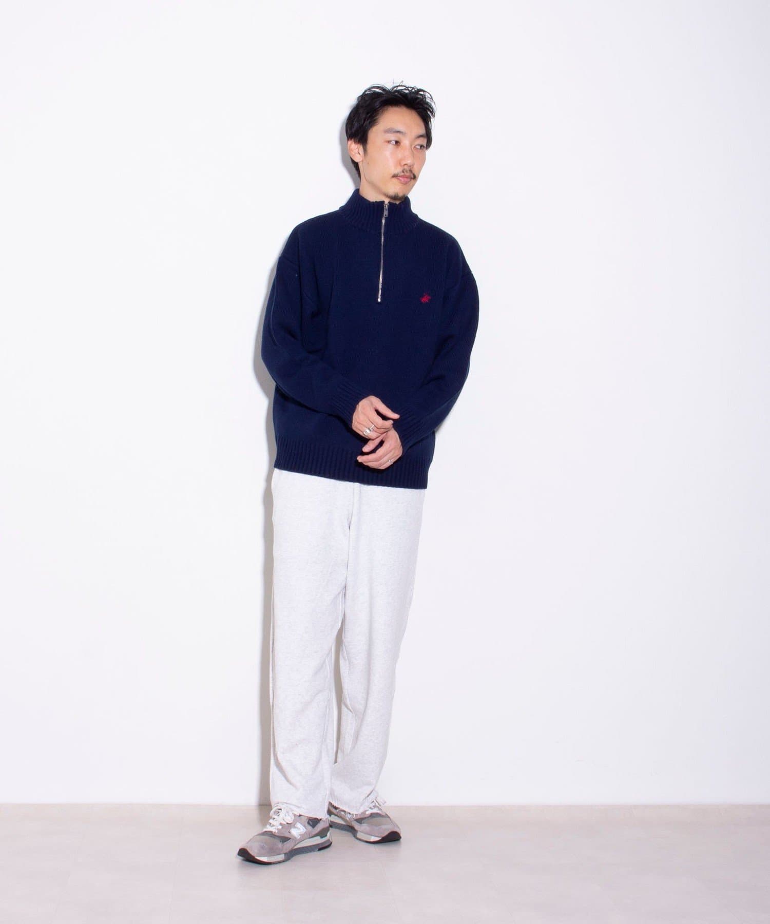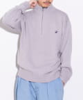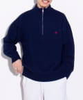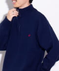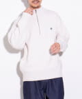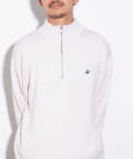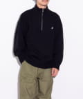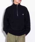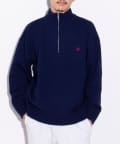 極めてシンプルにミニマルなワッペンを胸元へワンポイント施したハーフジップニット。