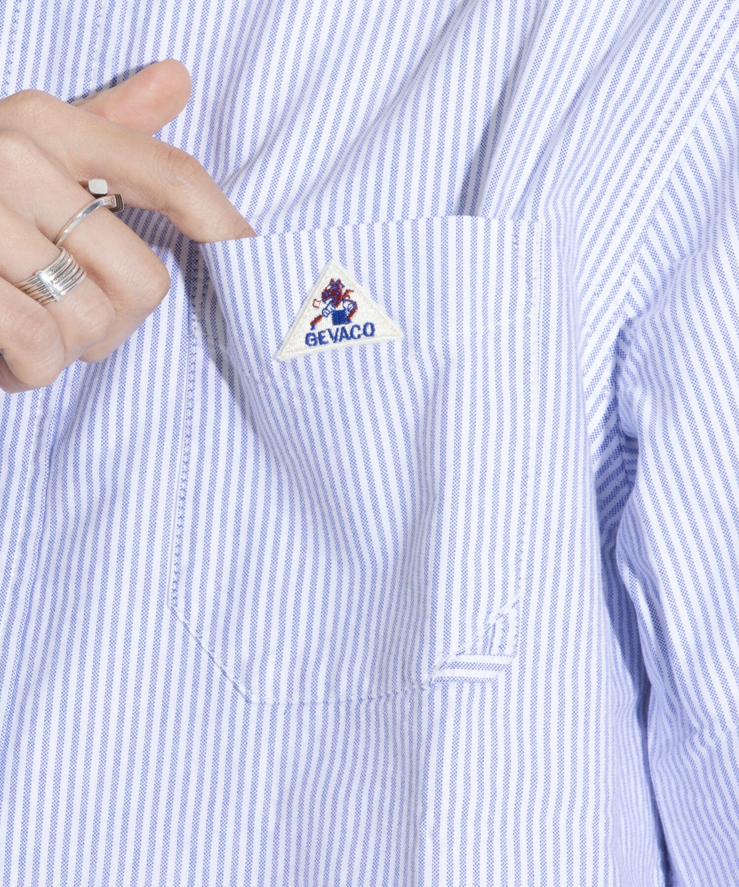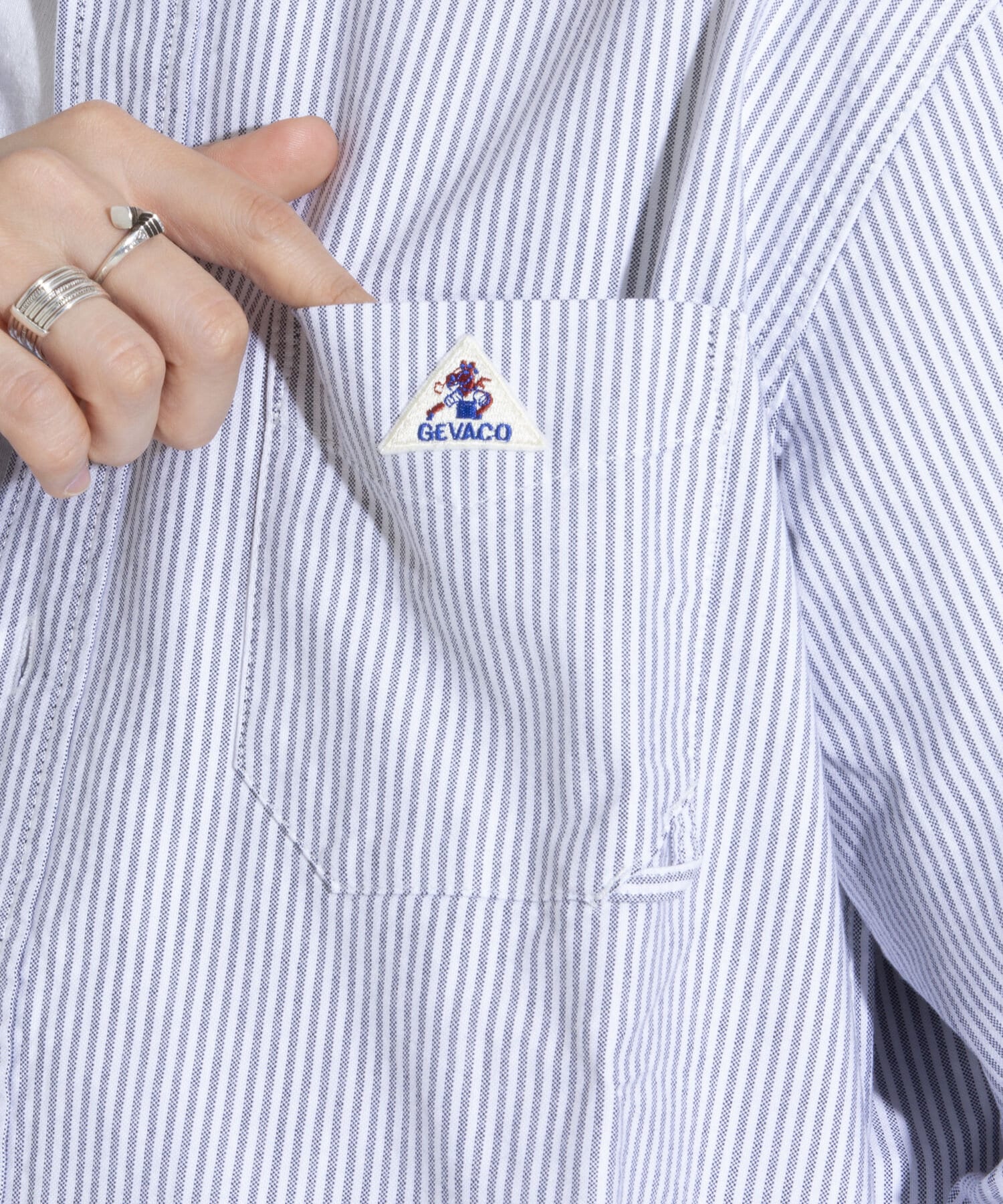 胸ポケットはハンバーループをイメージしたGEVACOオリジナルのディティールを付け、アイコンの三角ワッペンを付けた仕上がり。