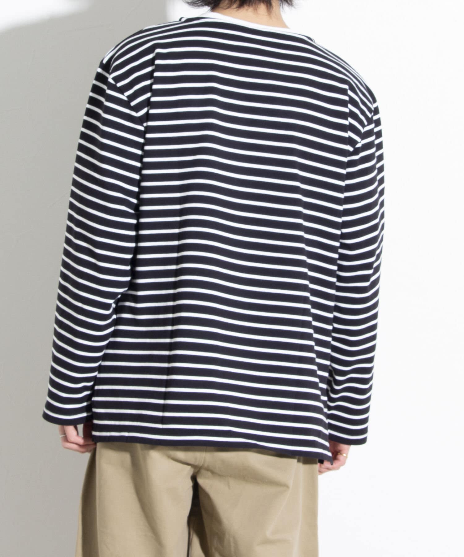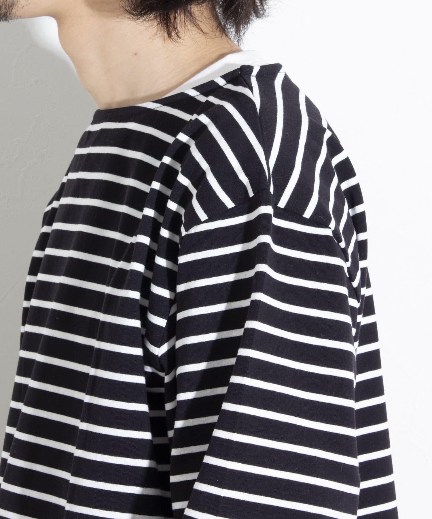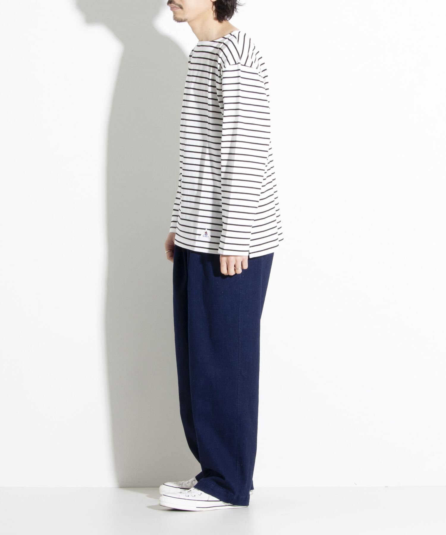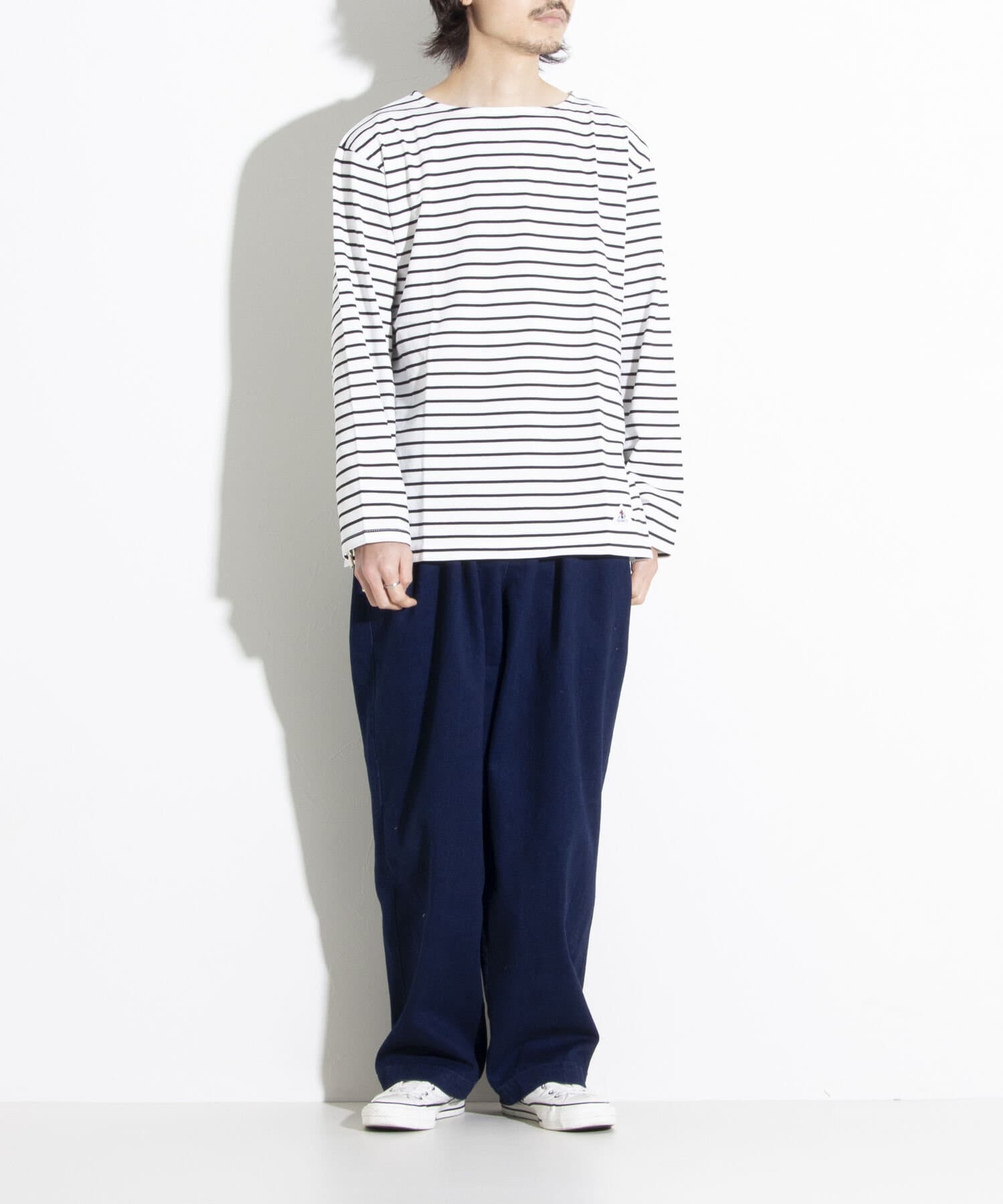 サラッとした軽い生地感で仕上げたボートネック型のバスクシャツ。