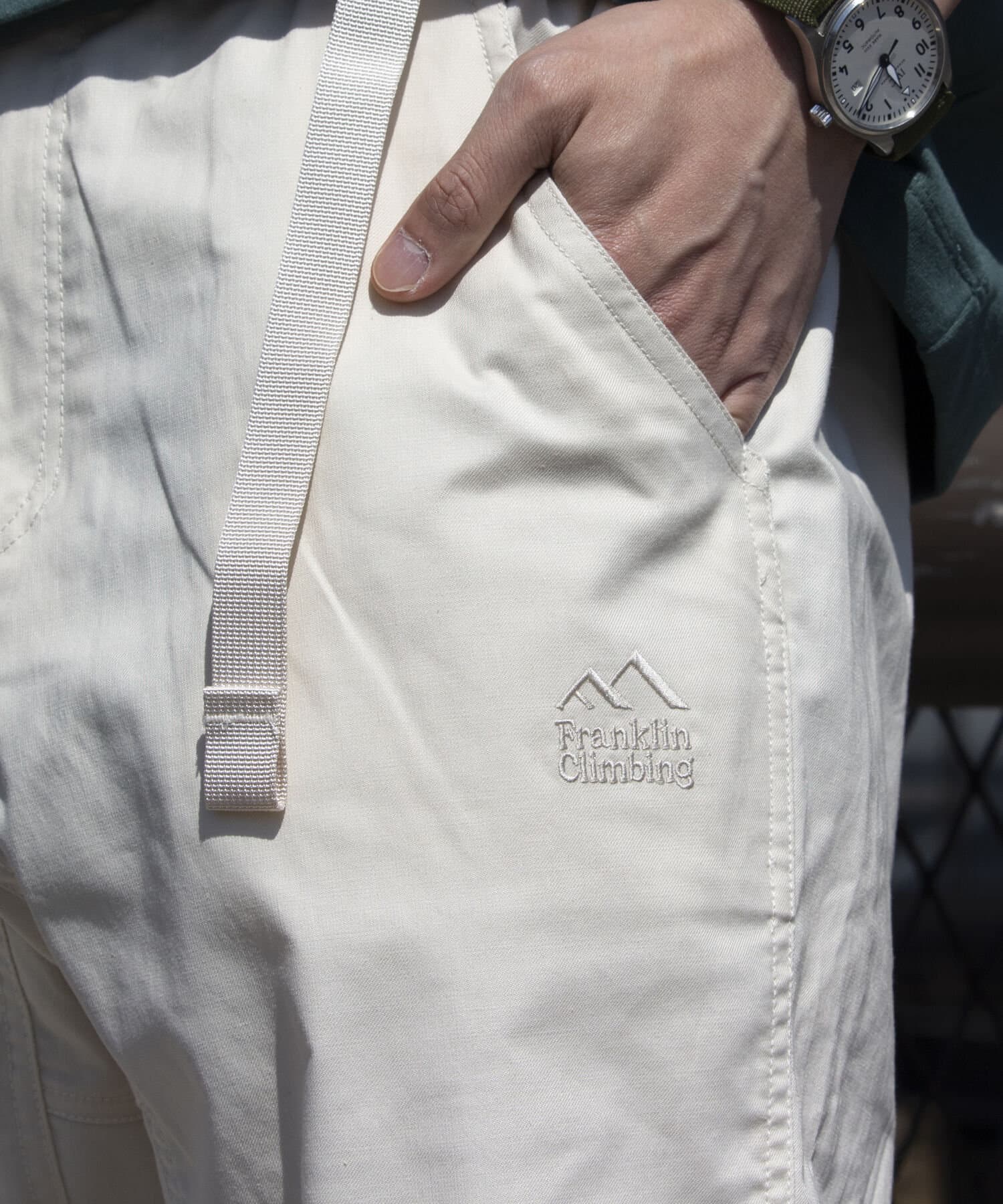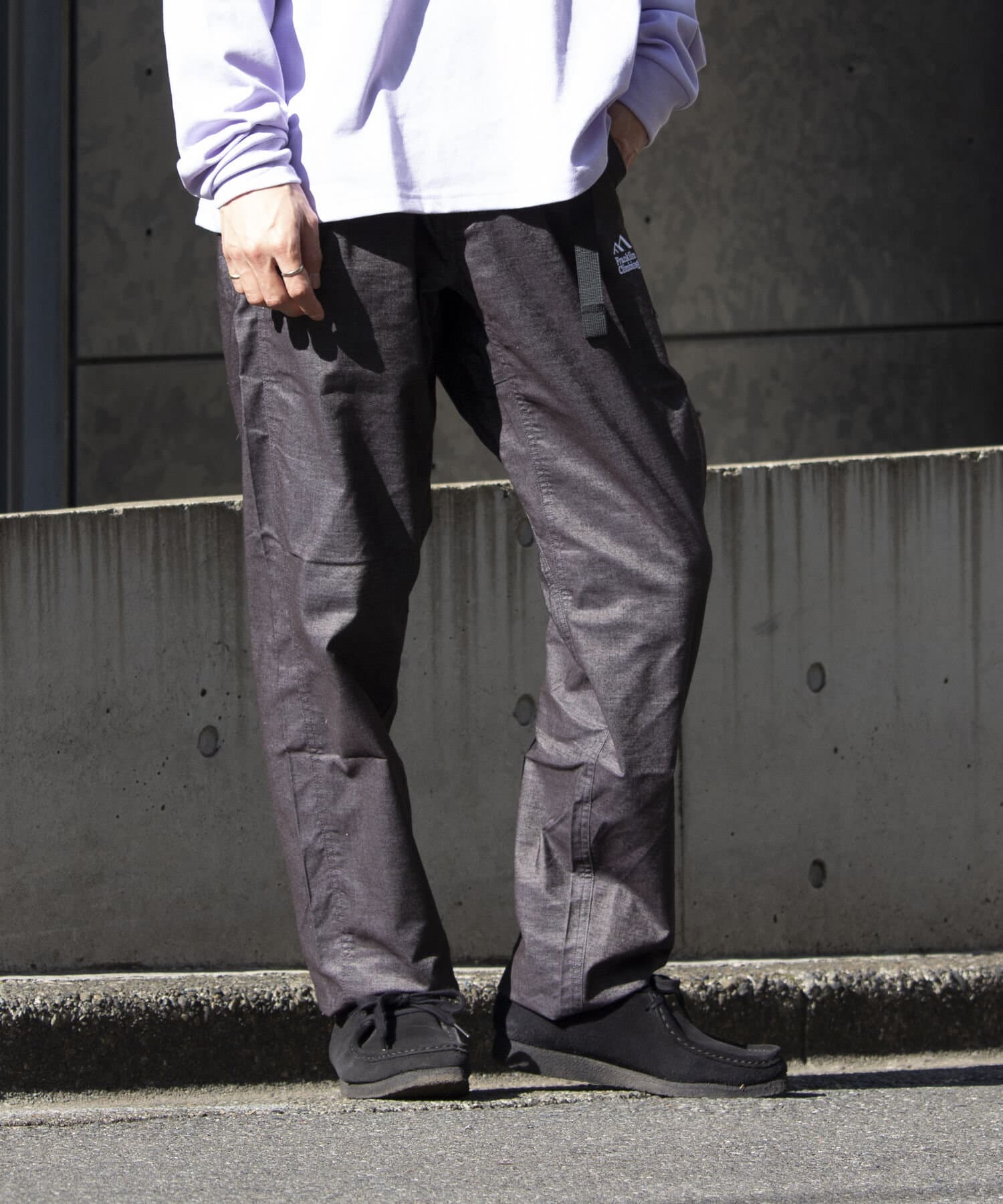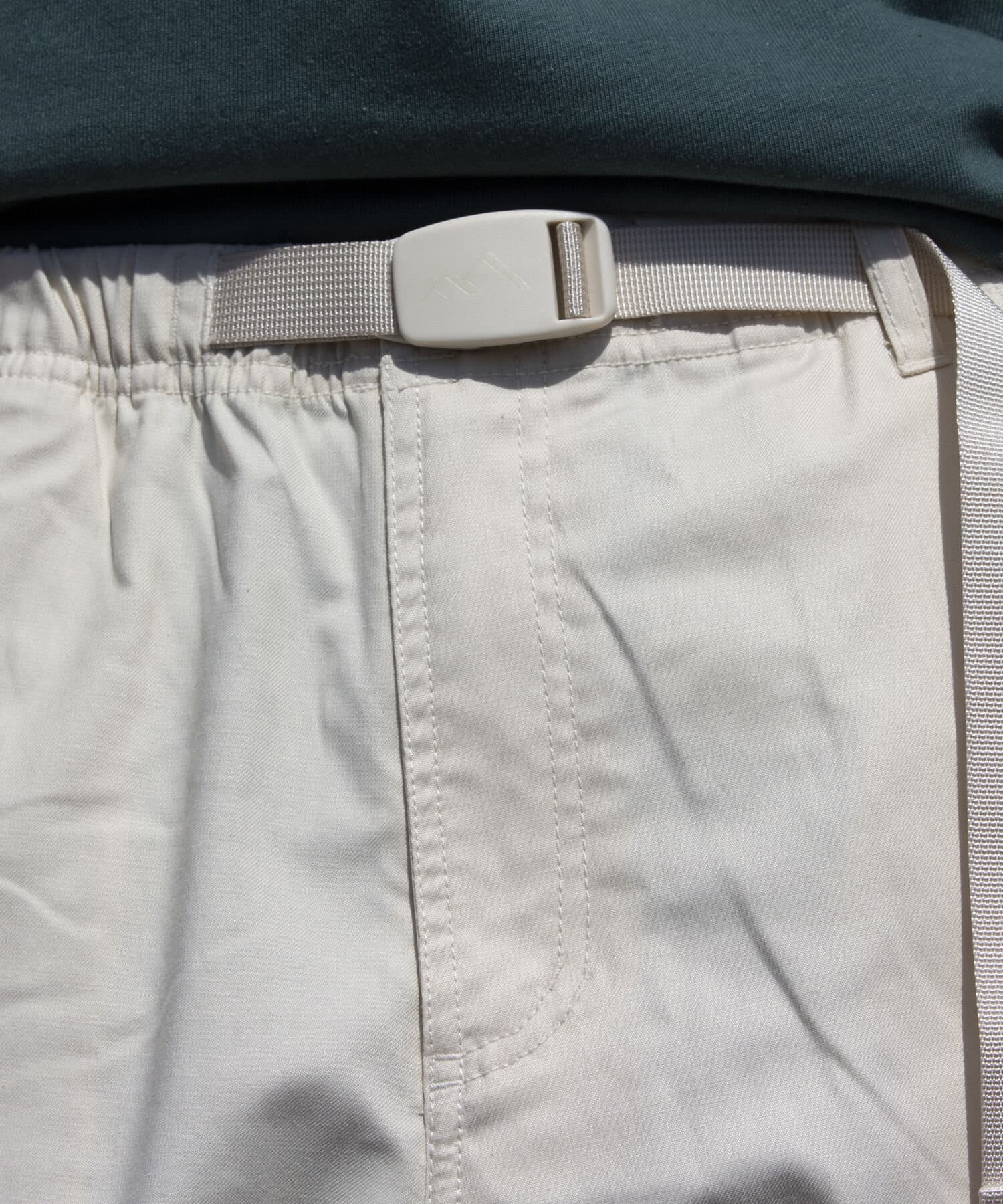 ストレッチの効いた、ベルト付きウエストゴム仕様のイージークライミングパンツ。