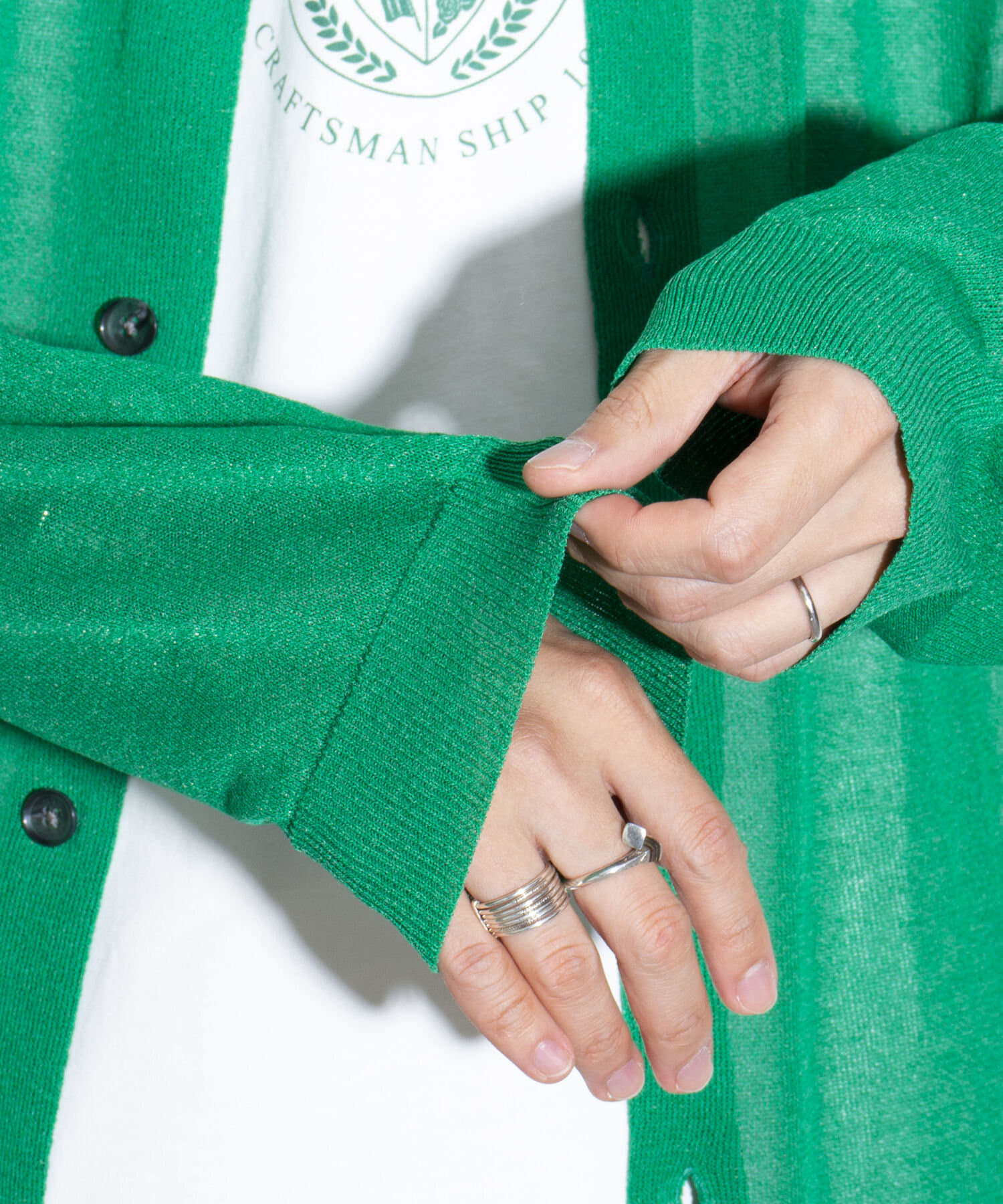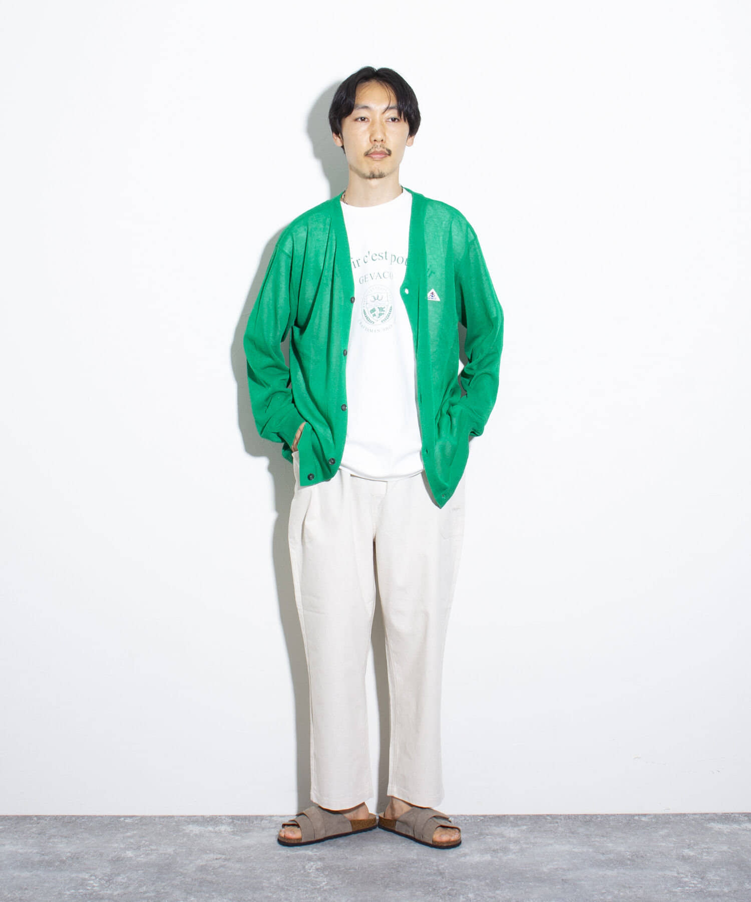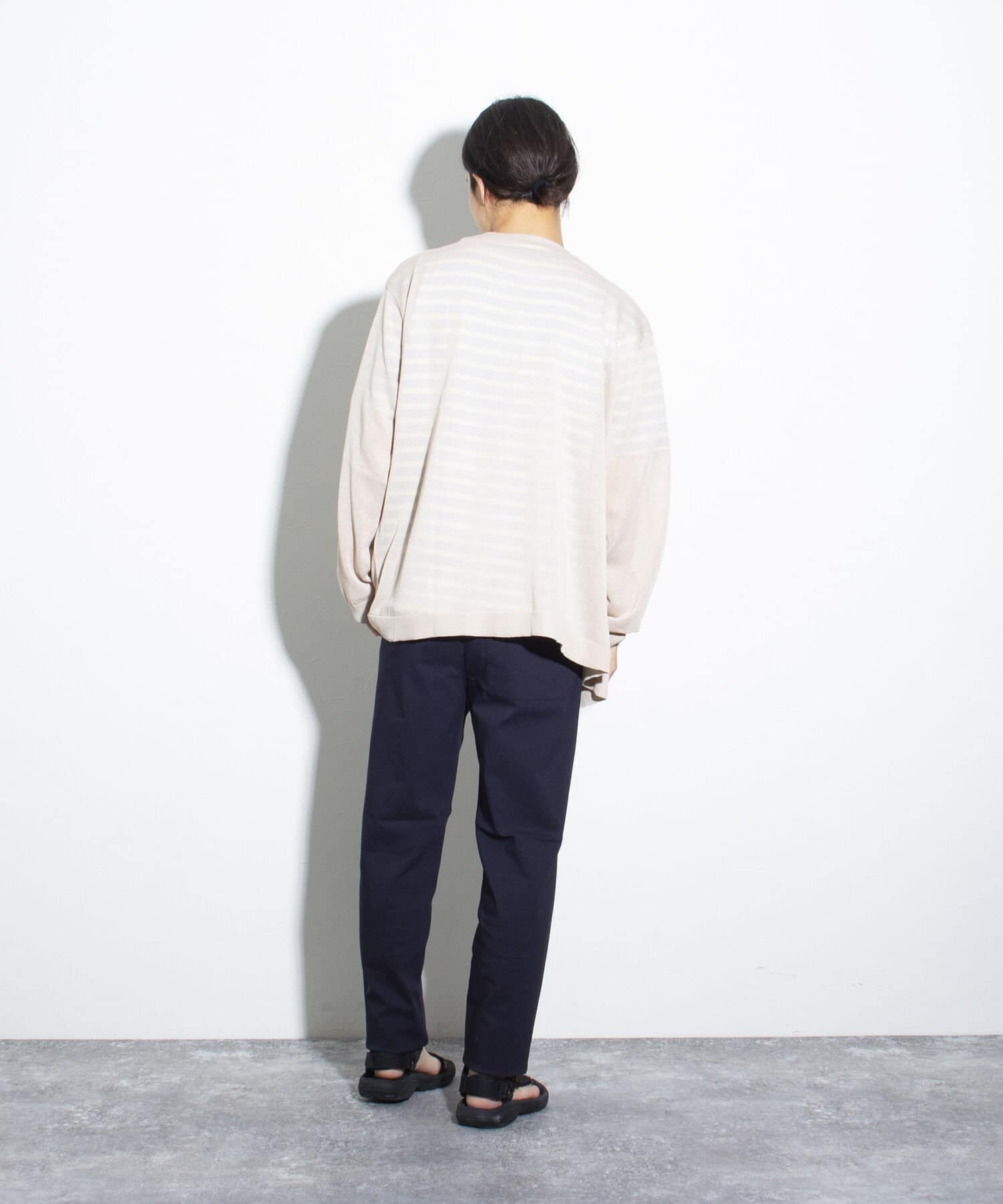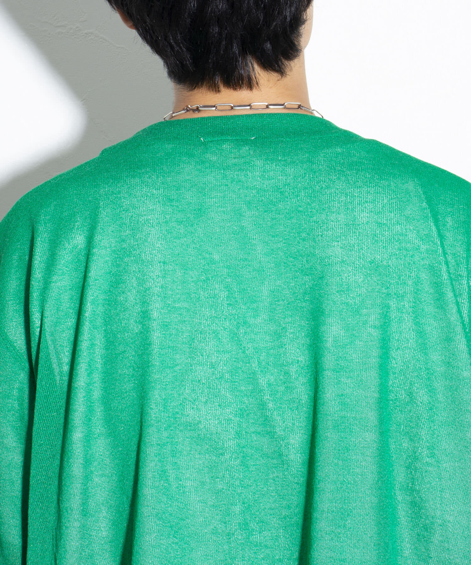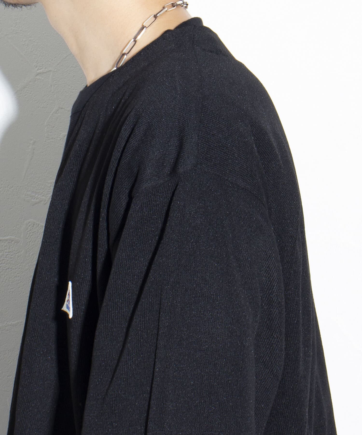 すっきりとしたVネックと無駄な装飾を一切省いたシンプルなディテールは、どんなスタイリングにも合わせやすい万能アイテム。