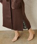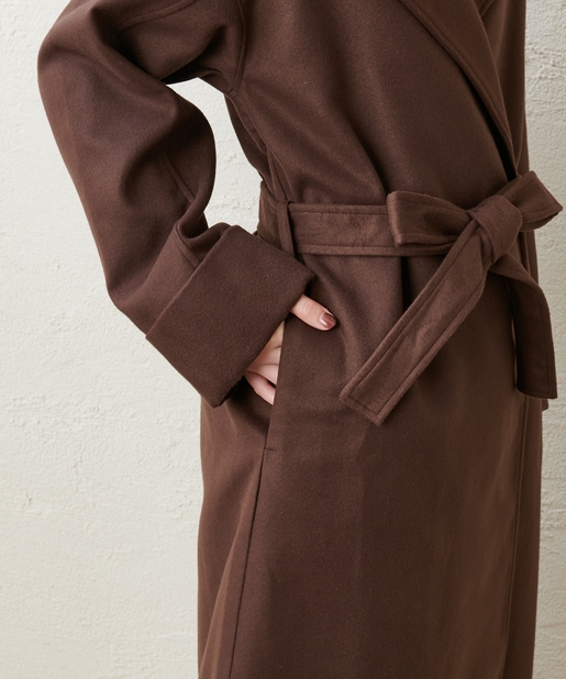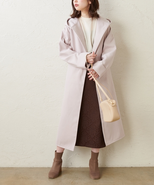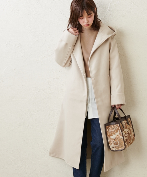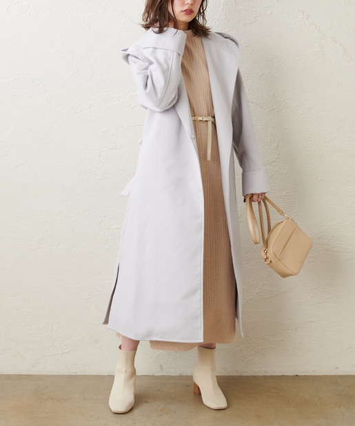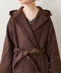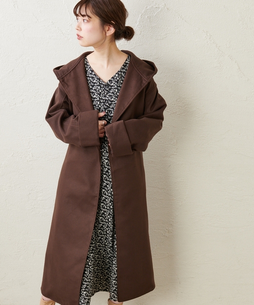 ガウンタイプのフード付きコート。衿のような大きめのフードがポイントに。付属のベルトでウエストを締めればキレイめに、フロントを開けてさらっと羽織ればカジュアルにと、いろいろなテイストで楽しんでいただけます。裏地がないので気軽に羽織れて、長いシーズンでお召しいただけます。裾にはスリット入りなのでロング丈でも動きやすいのも嬉しいポイント◎