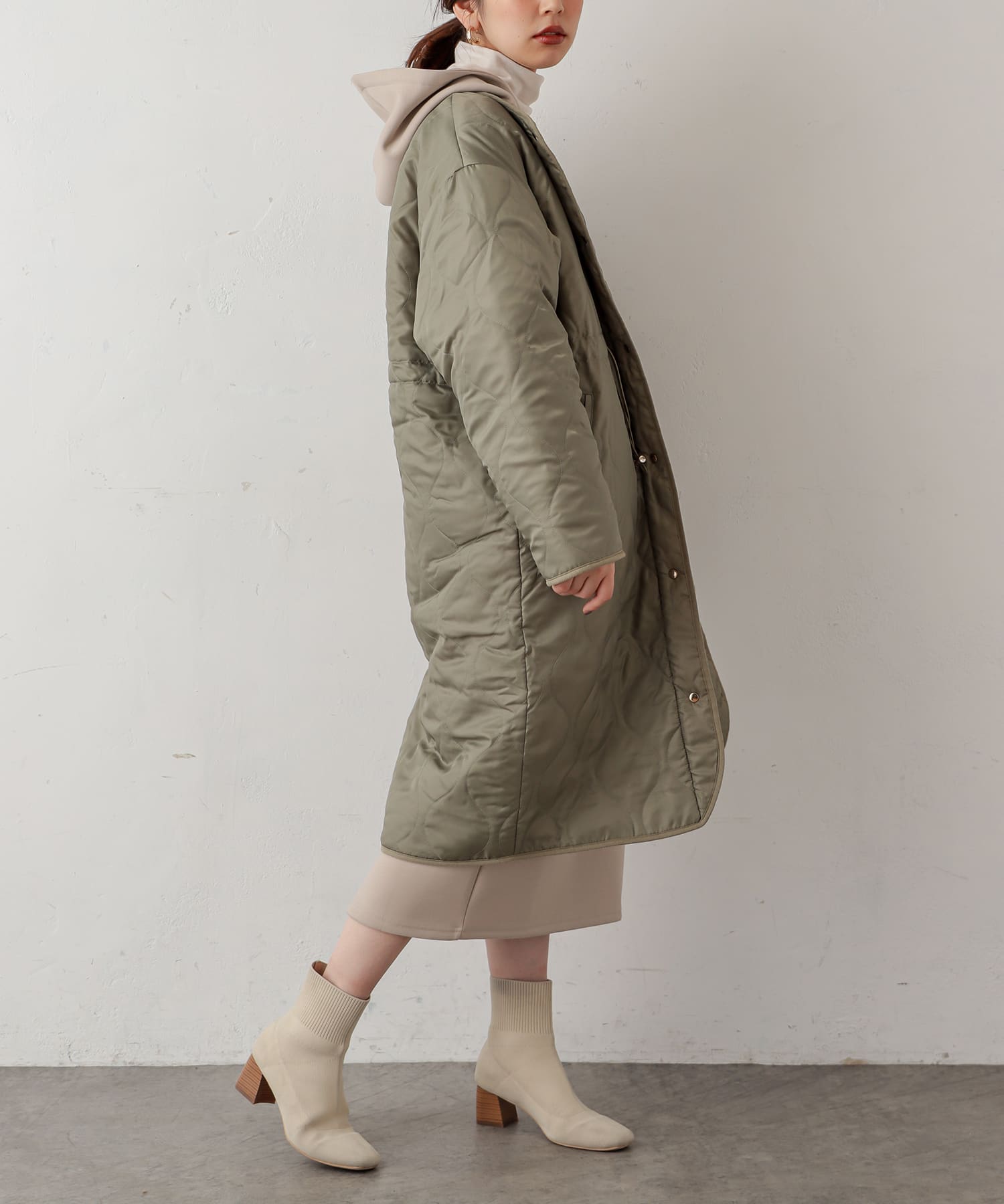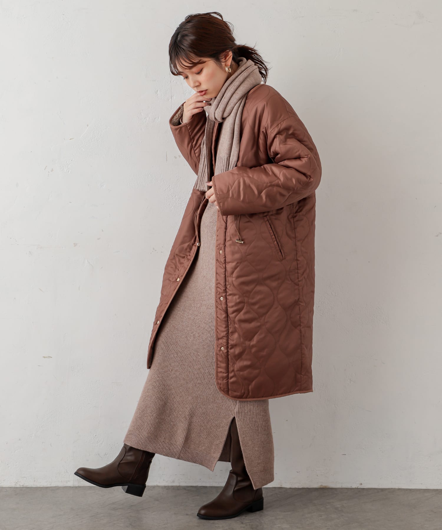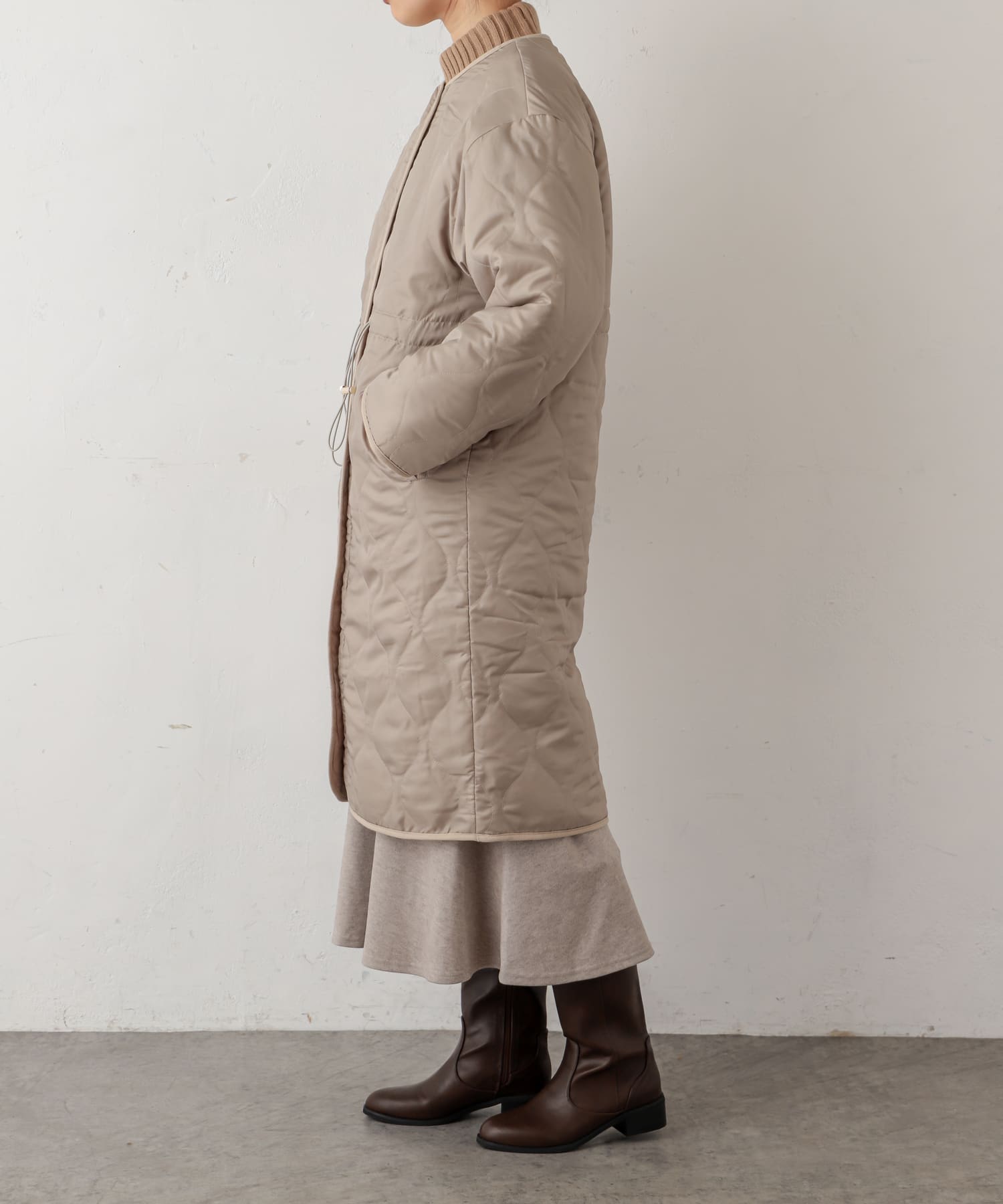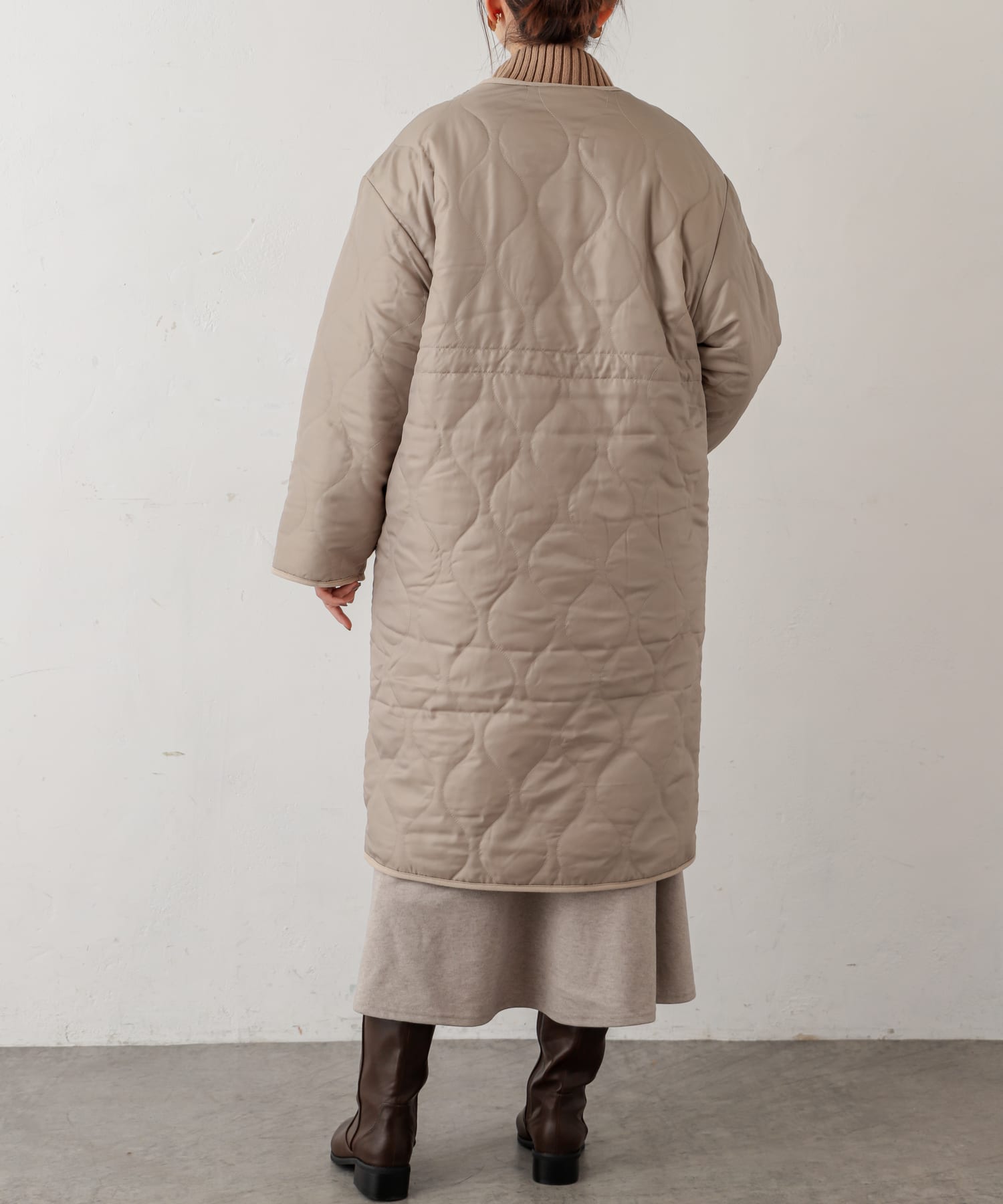 カジュアルな印象になりやすいキルト地のコートを、ナチュラルクチュールらしい大人上品な印象に