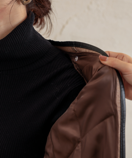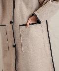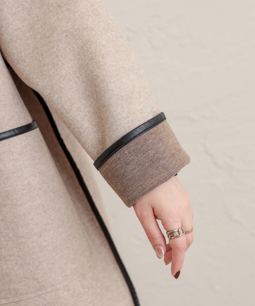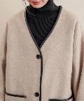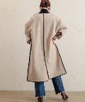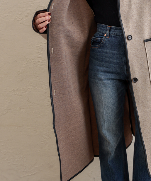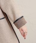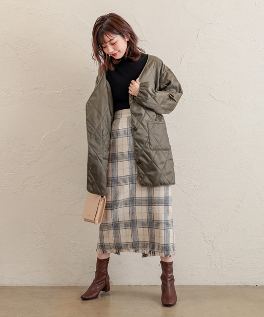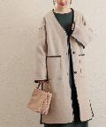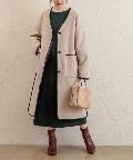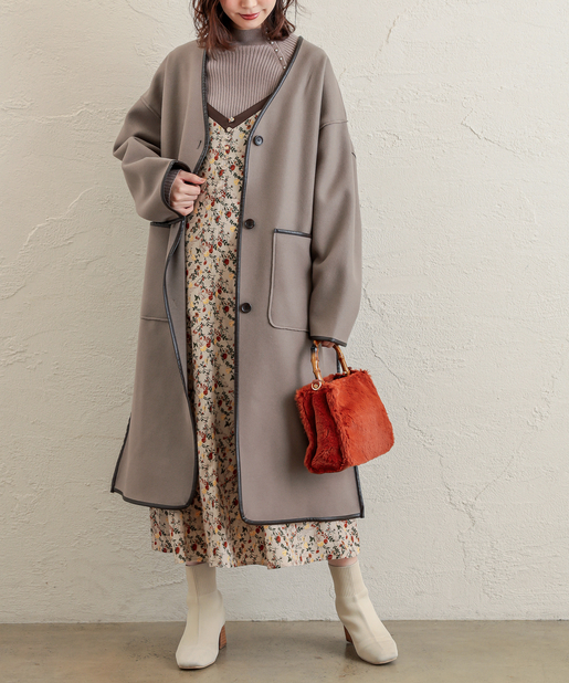 パイピングがアクセントになった、着るだけで今年らしく、トレンド感のあるコーディネートに