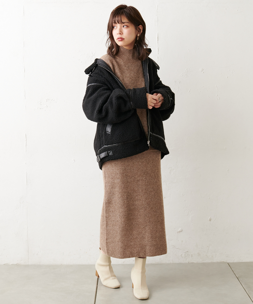 トップスは、ハイネックニットやバンドカラーのシャツなど首元にポイントのあるものを合わせて頂くのがおすすめです。