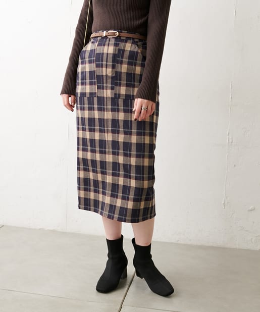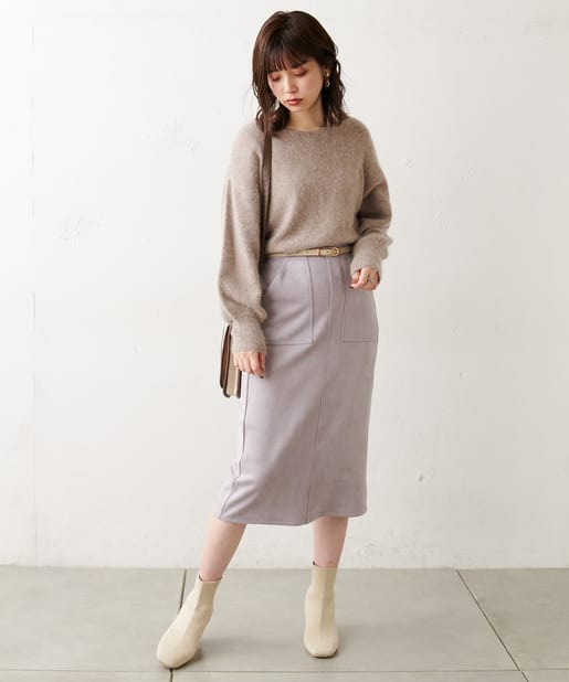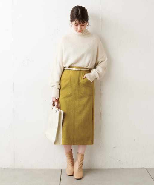 てろっとした落ち感、しっとり滑らかな肌ざわりが心地よい、スエード調ポンチ素材を使用したタイトスカート。