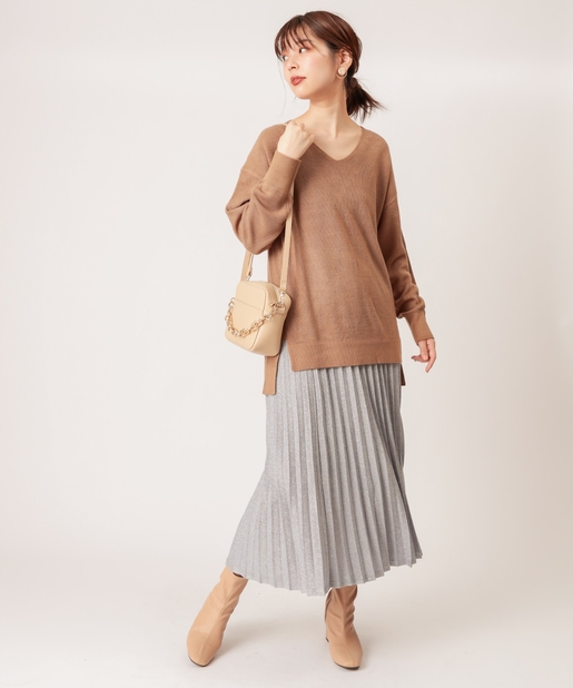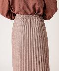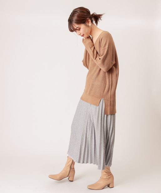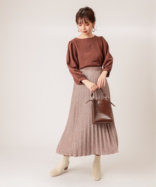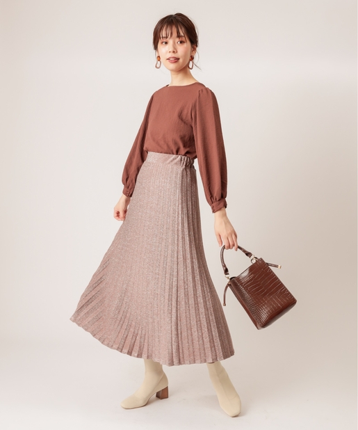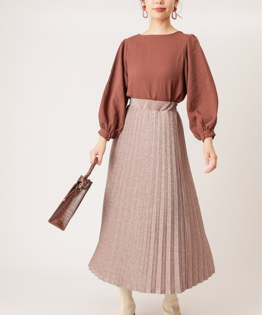 キャッチーなキラキラとしたラメが可愛いプリーツスカートが登場。秋冬の落ち着いたカラーや厚みのあるトップスとの相性が抜群で、これ1枚でスタイリングに動きのある軽やかな印象を演出してくれます。プリーツは広がり過ぎず、ミディ丈で落ち着いた雰囲気で着て頂けるので、甘めな着こなしがお好きな方にもキレイめな着こなしがお好きな方にもオススメの1着です。しっかりと裏地もお付けしているのでブーツやタイツと合わせても◎冬まで着こなしの幅がグッと広がる事間違いなしです。どの色も落ち着いたトーンなのでラメ感が程良くコーデのワンポイントになってくれますよ。