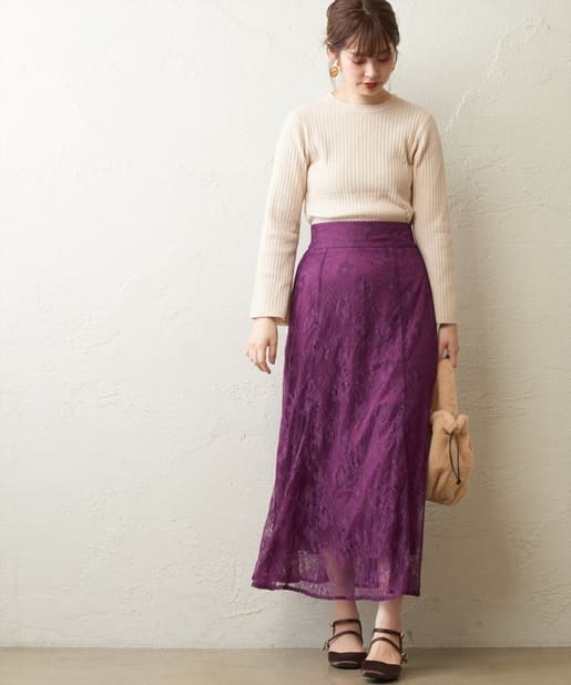 前回大変好評でした上品レースのosonoスカートの新作が登場!今回は裾丈の長さを変えられるように工夫したデザインになっており、ウエスト部分を外側に一回折って頂くと6.5cm程丈が上がるので、背丈を問わずお好みの長さでご着用して頂けます。ウエストは後ろ部分がゴムになっている為履き心地も良く、綺麗に見えるフィット感&緩やかなフレアのシルエットがスタイルアップ見え間違いなしです!しなやかなスカートの動きと共に裾レースの透け感が上品且つ可愛らしい仕上がりになっています。薄手のニットやブラウスなどシンプルなトップスとの相性が抜群です!思わず目を惹くデザインでデートコーデにもオススメの一枚です。カラーはライトベージュ、サックスブルー、パープル、ブラック、拘りの詰った四色になります。