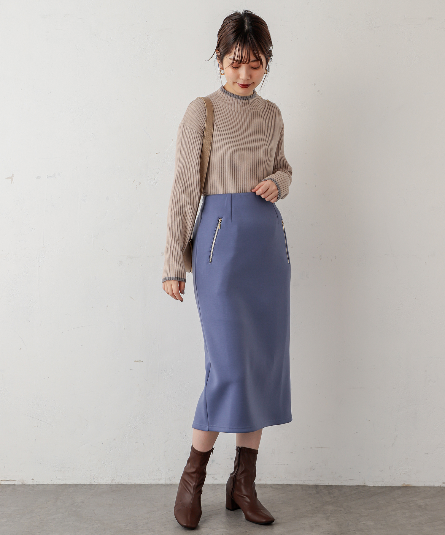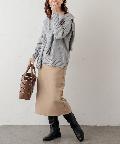 ハイネックニットやブラウスなどをウエストインして、すっきりとしたきれいめカジュアルな