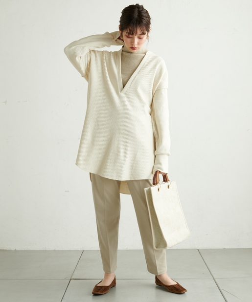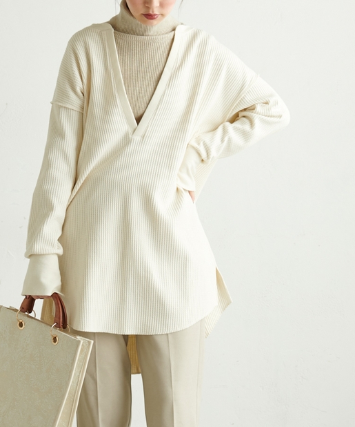 深めのVネック仕様で、ロンTやシャツ、ハイネックインナーなど、お好みのアイテムとの
