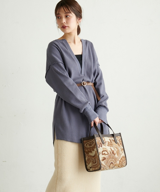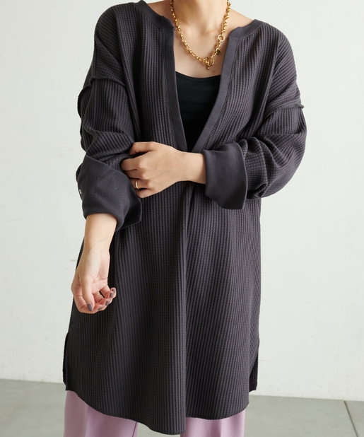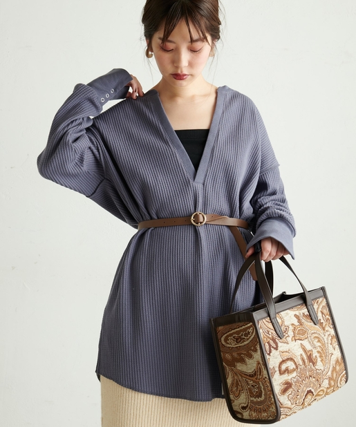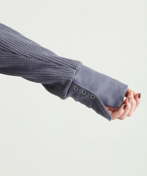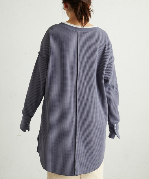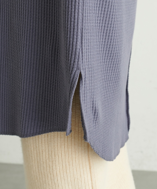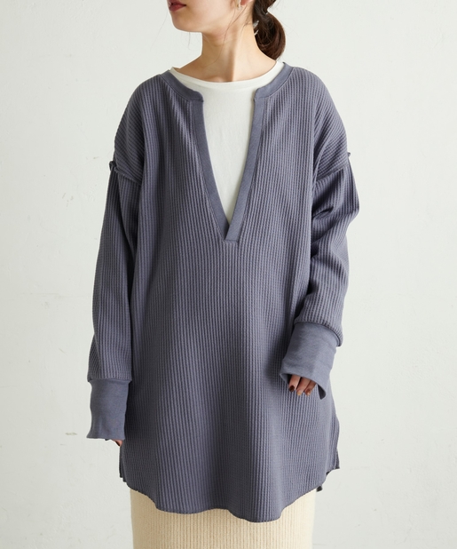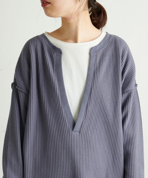 深Vネック袖口スリットワッフルトップス