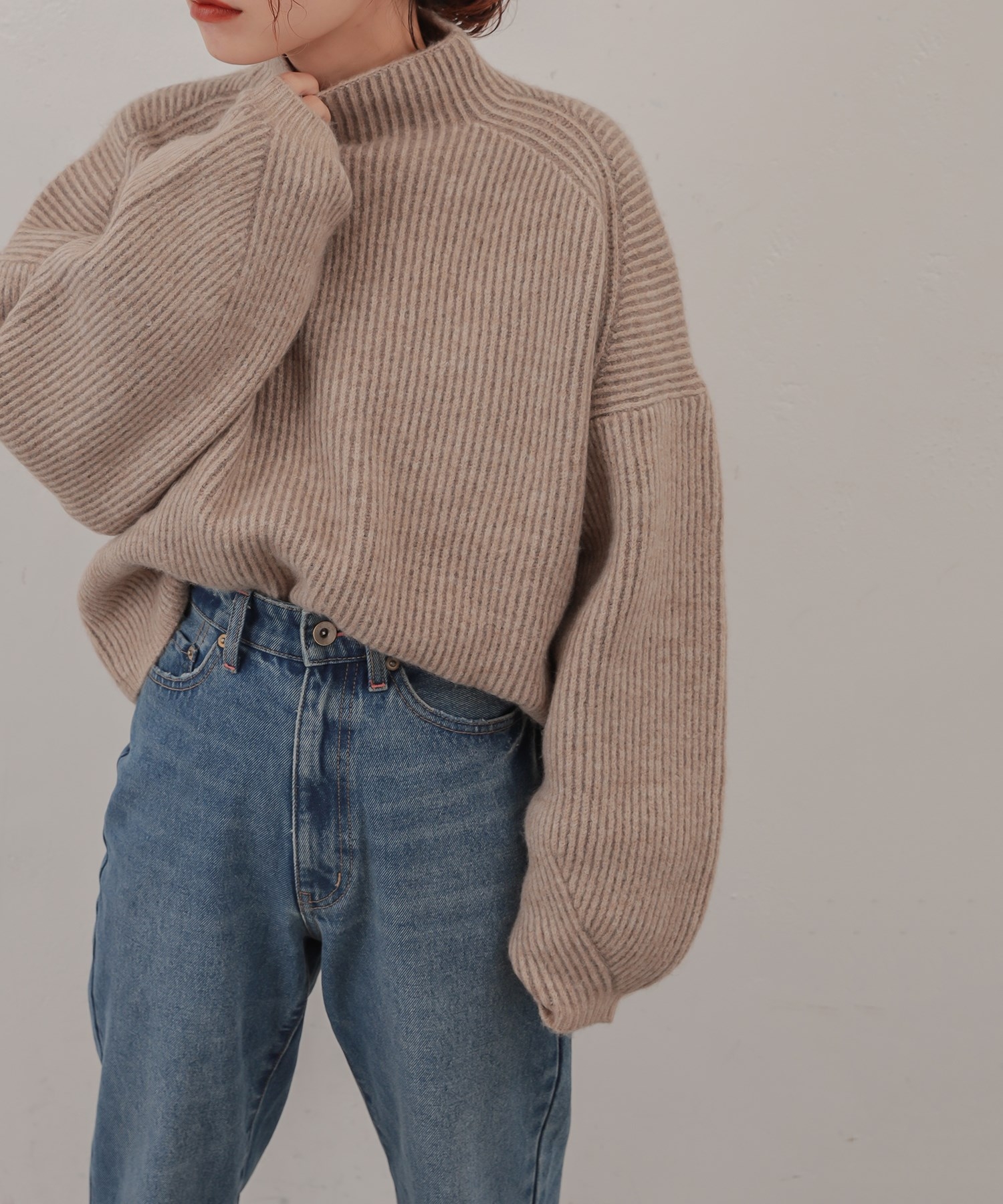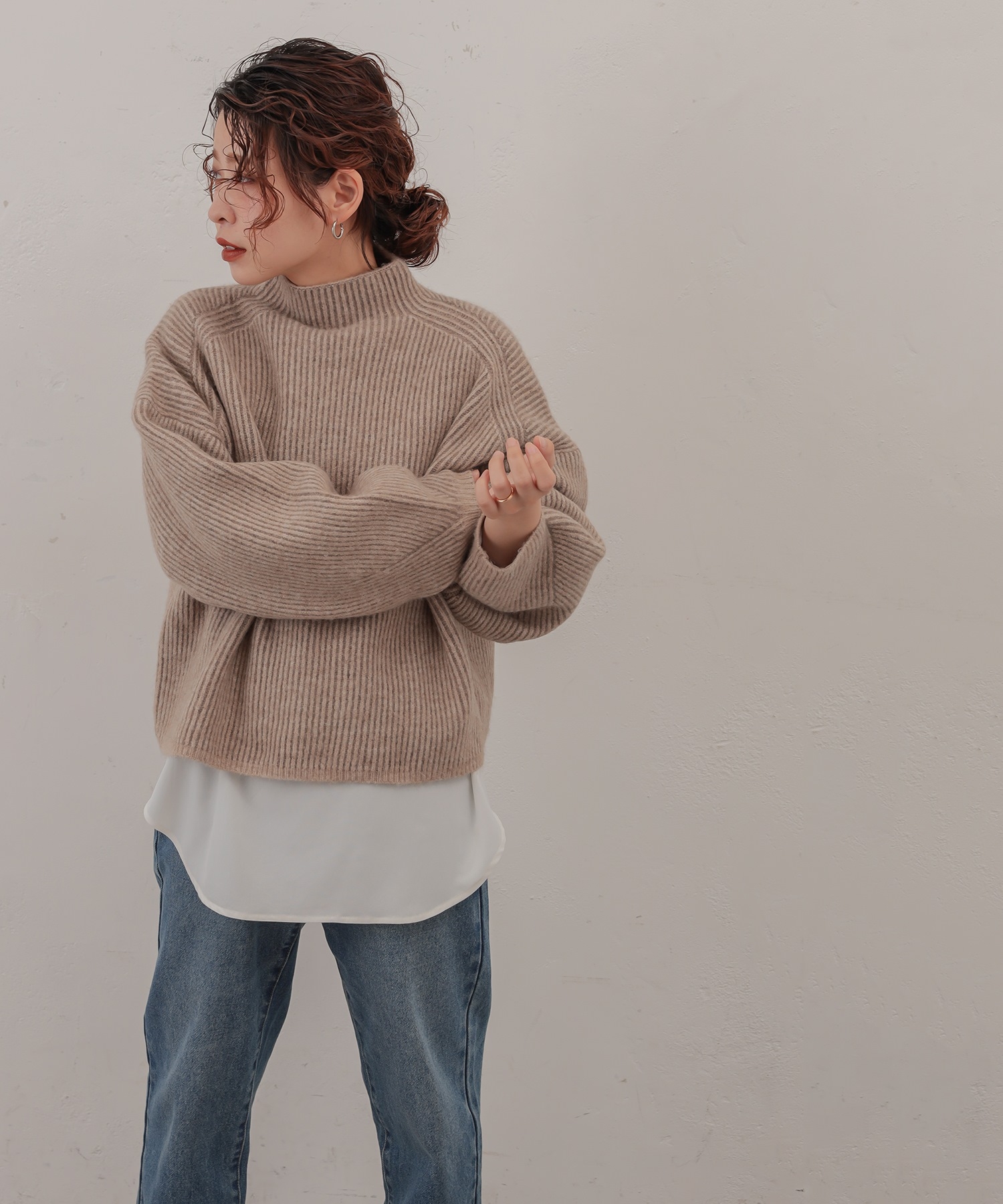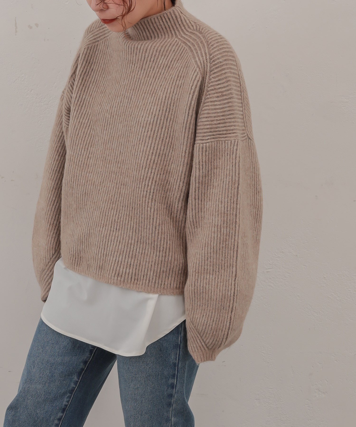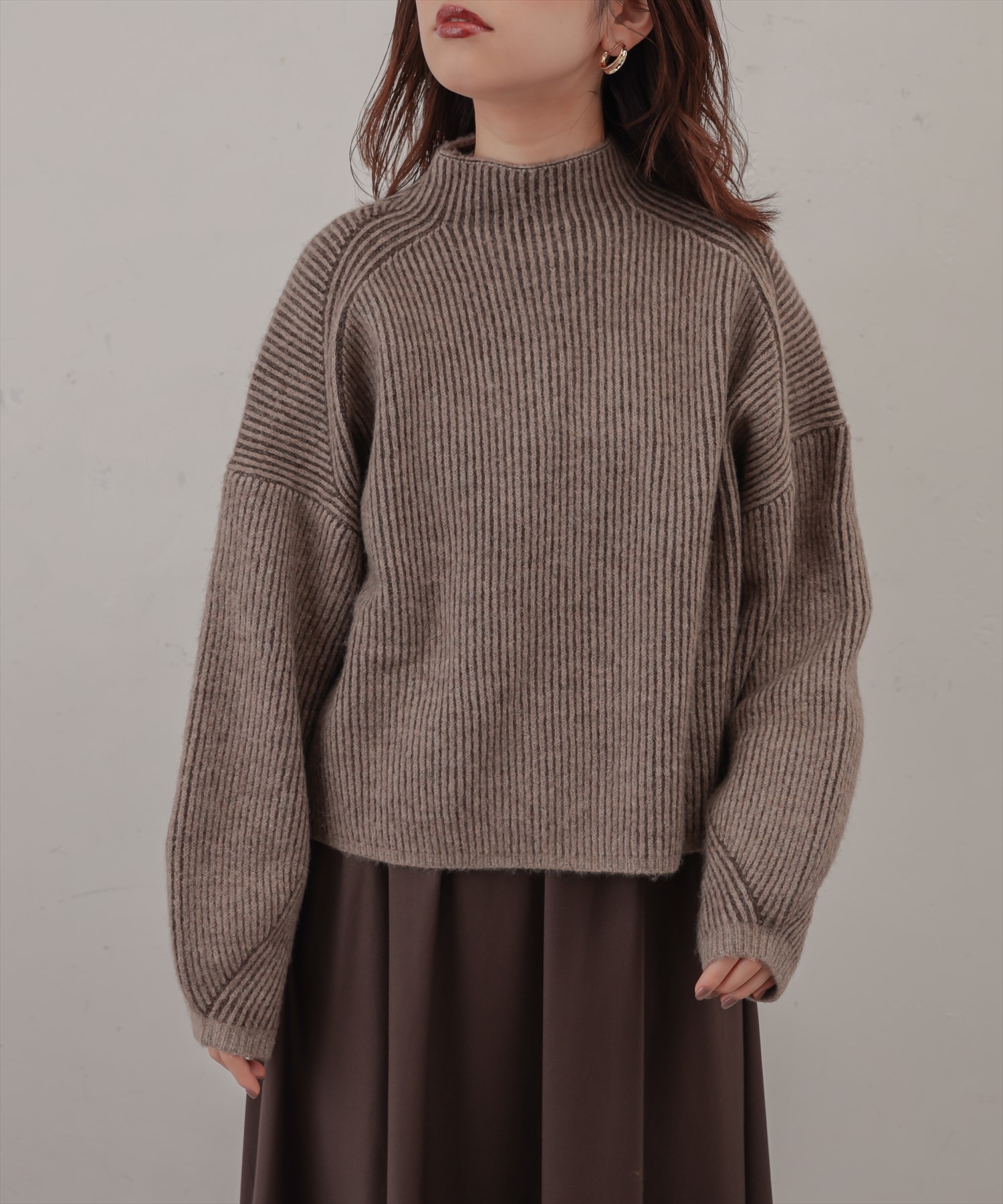 首から少し離れた立体的なニュアンスボトルネックデザイン。