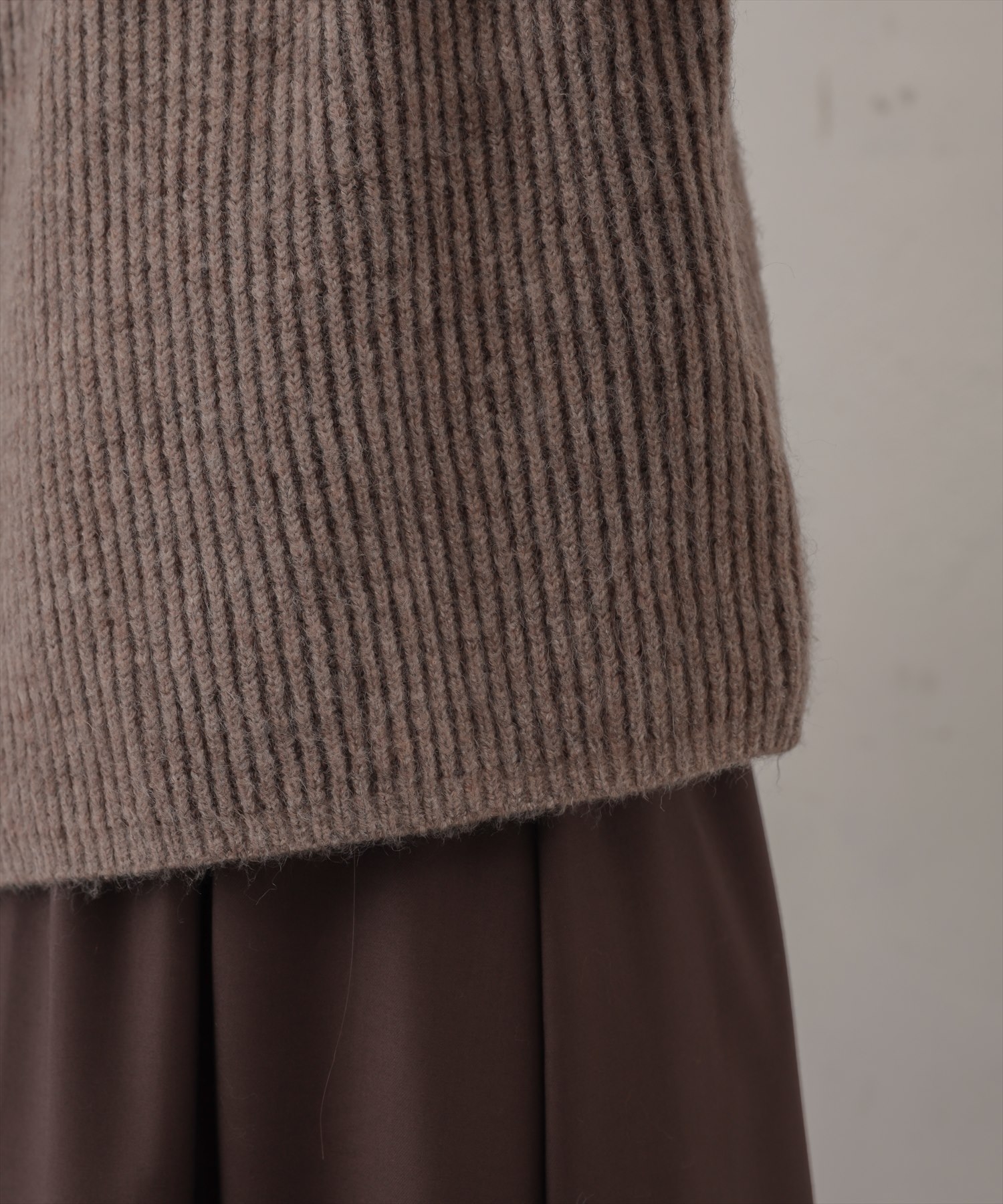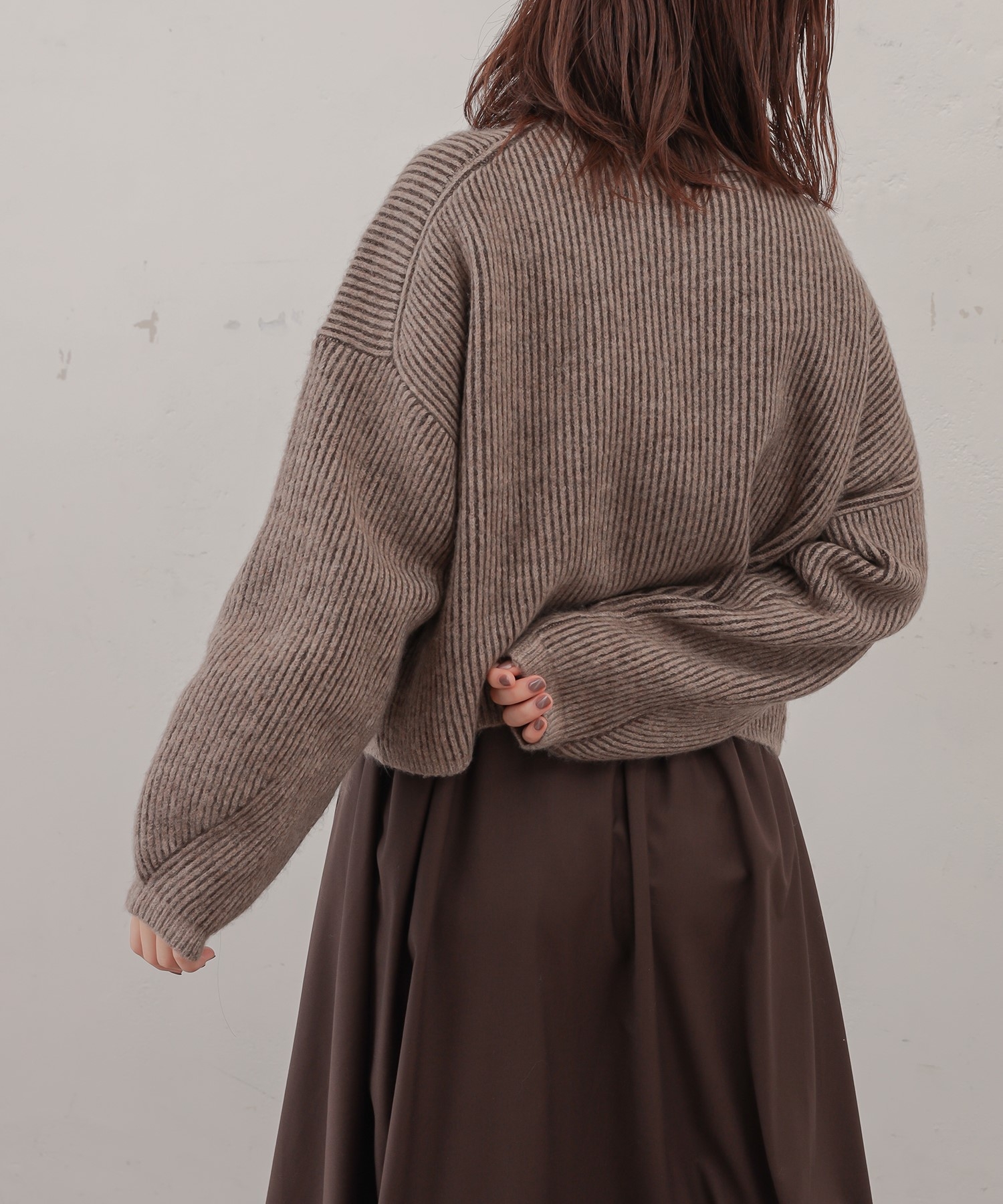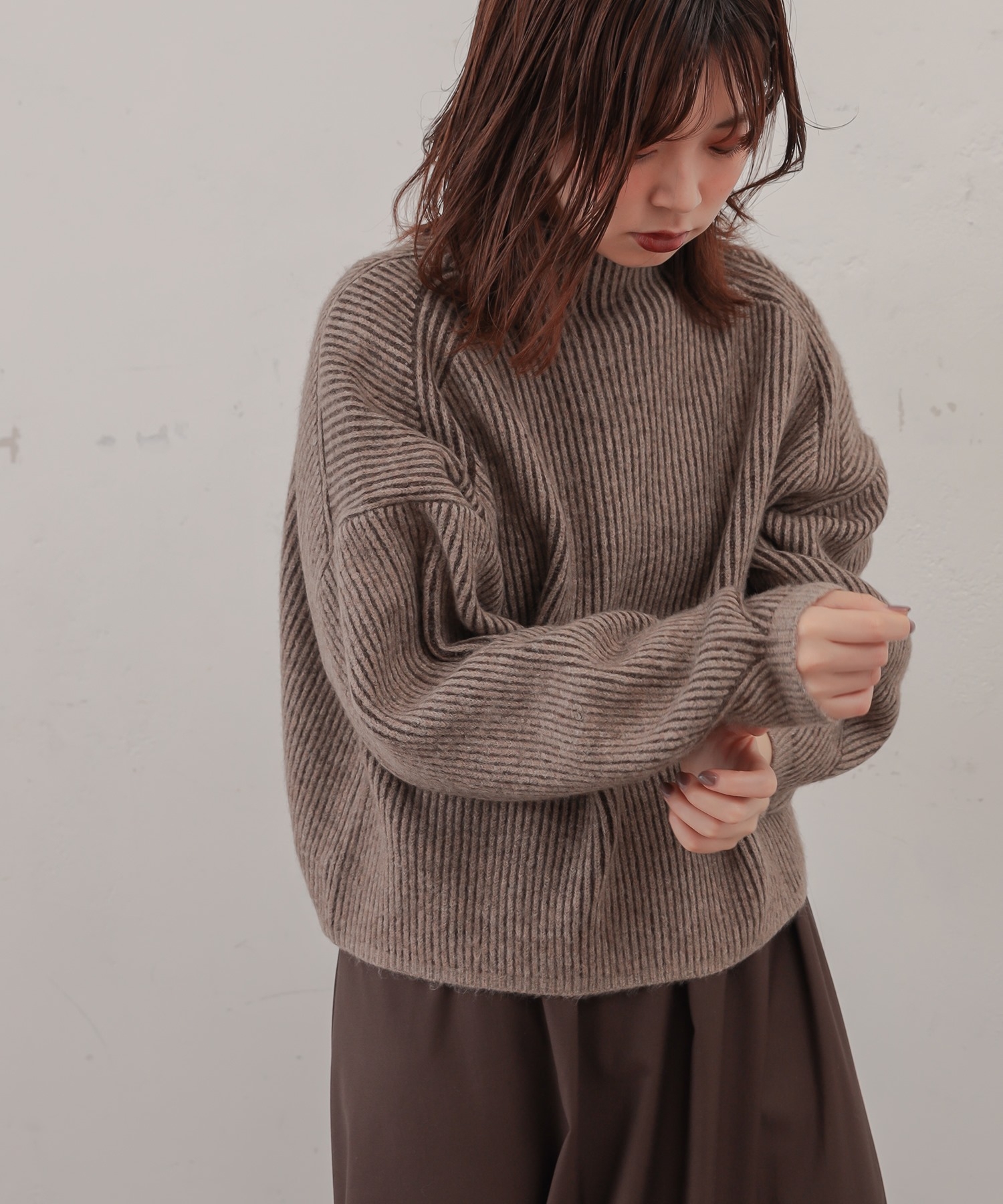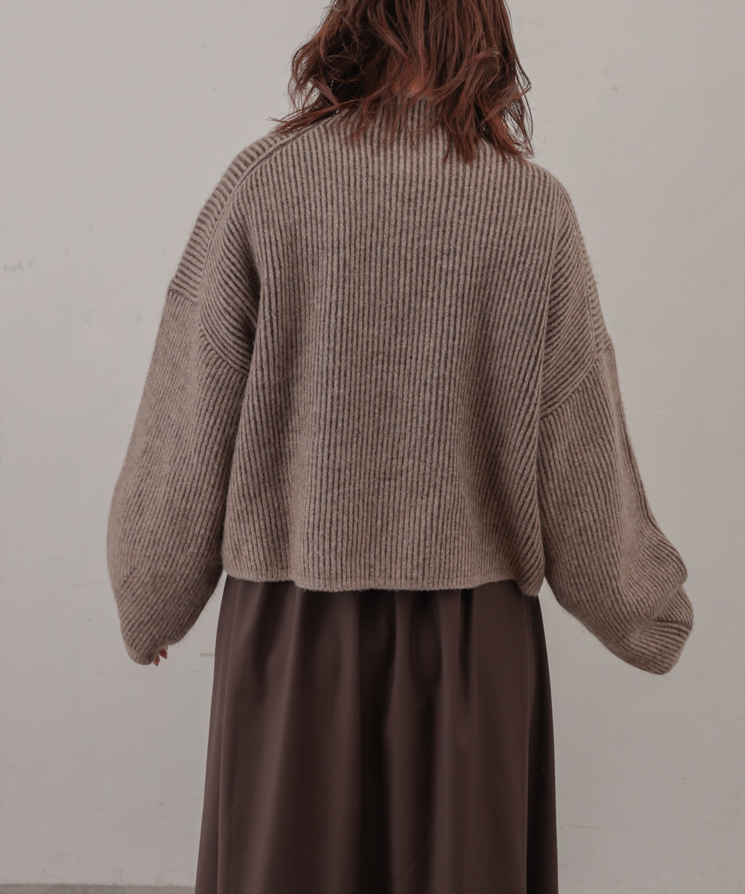 首から少し離れた立体的なニュアンスボトルネックデザイン。