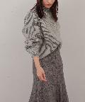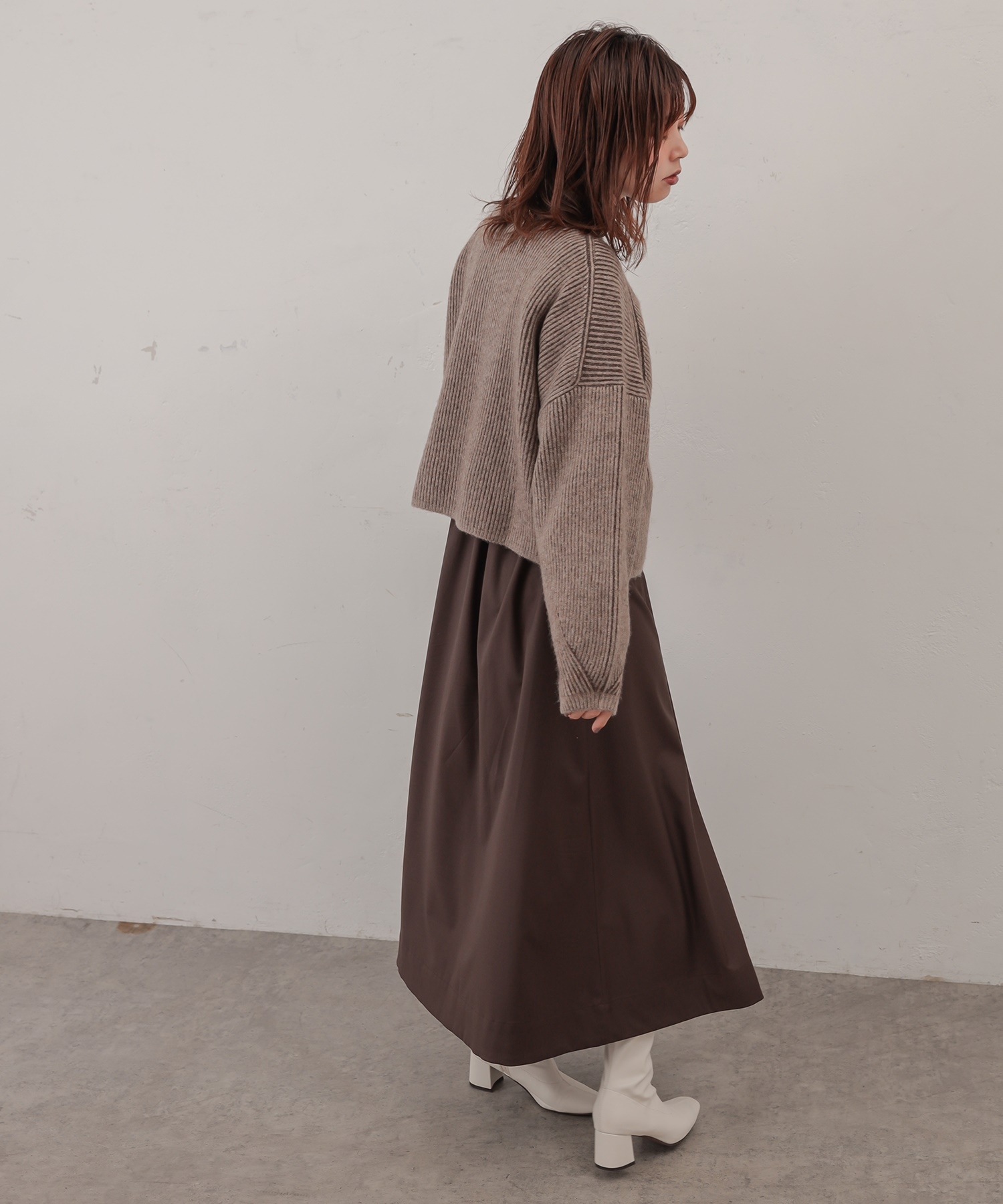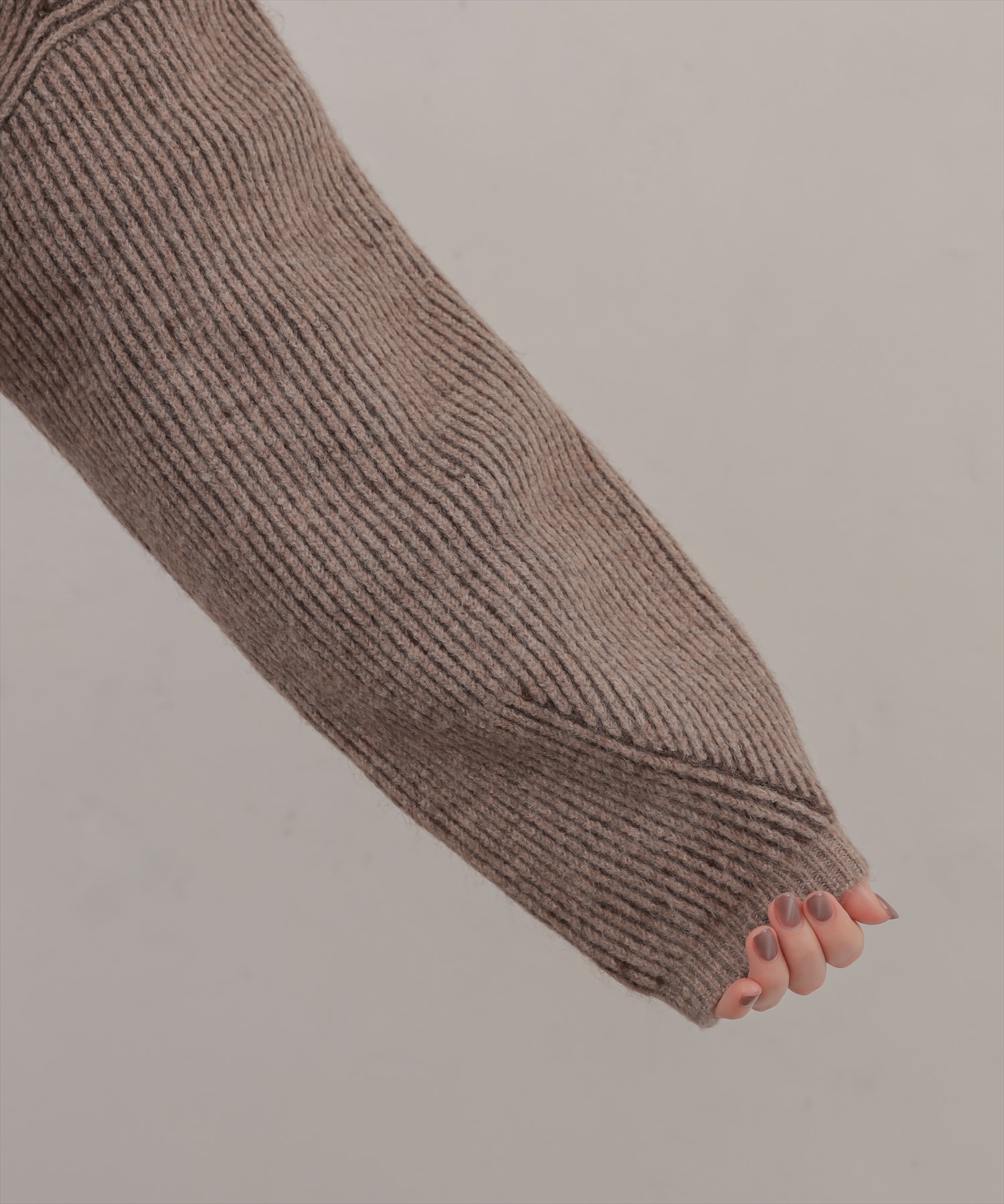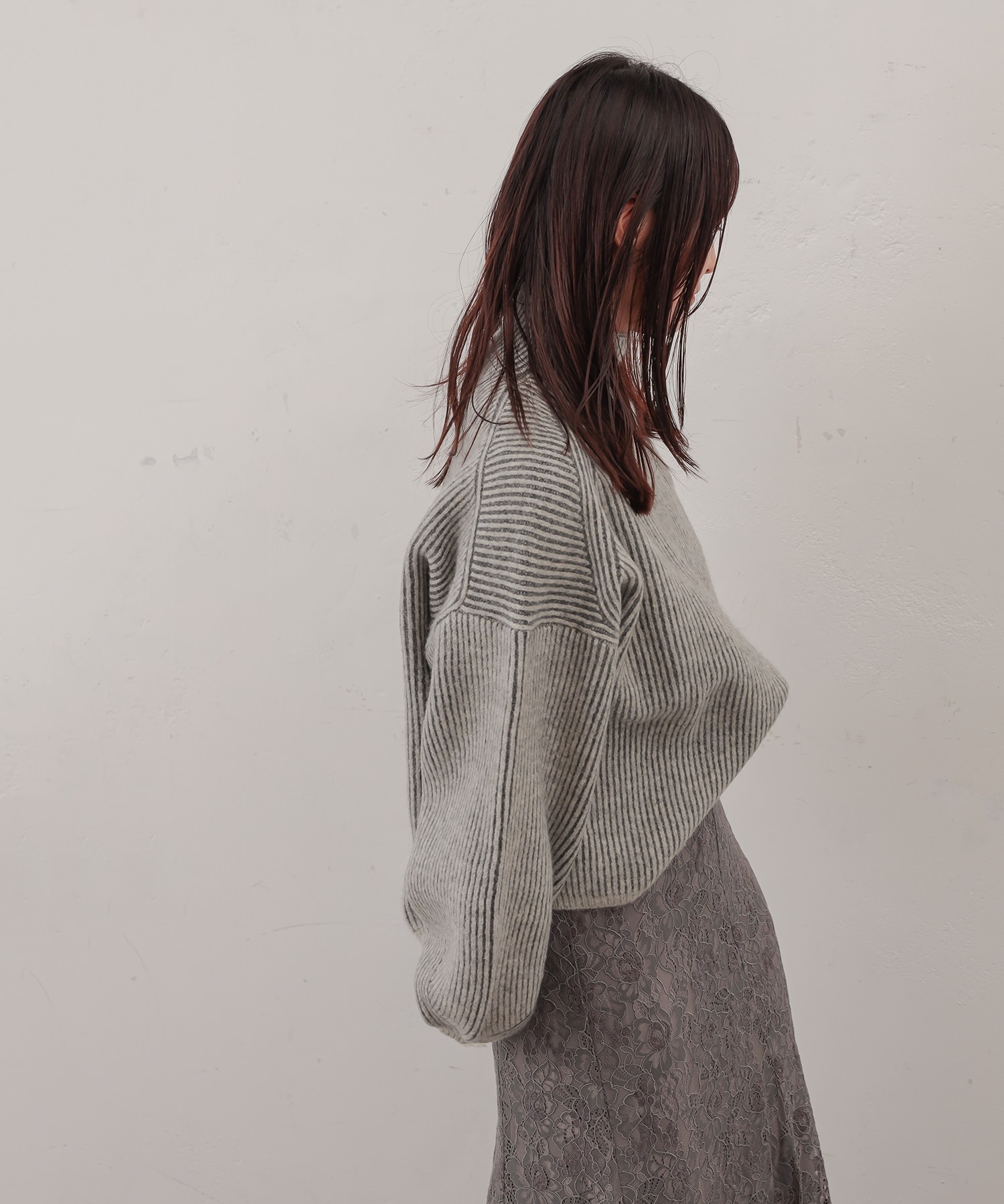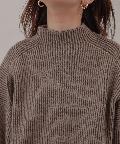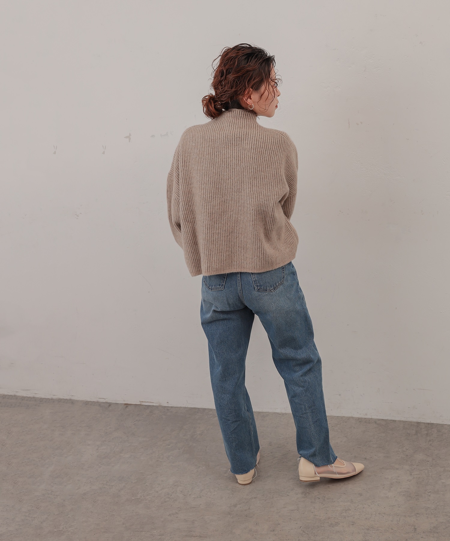 首から少し離れた立体的なニュアンスボトルネックデザイン。