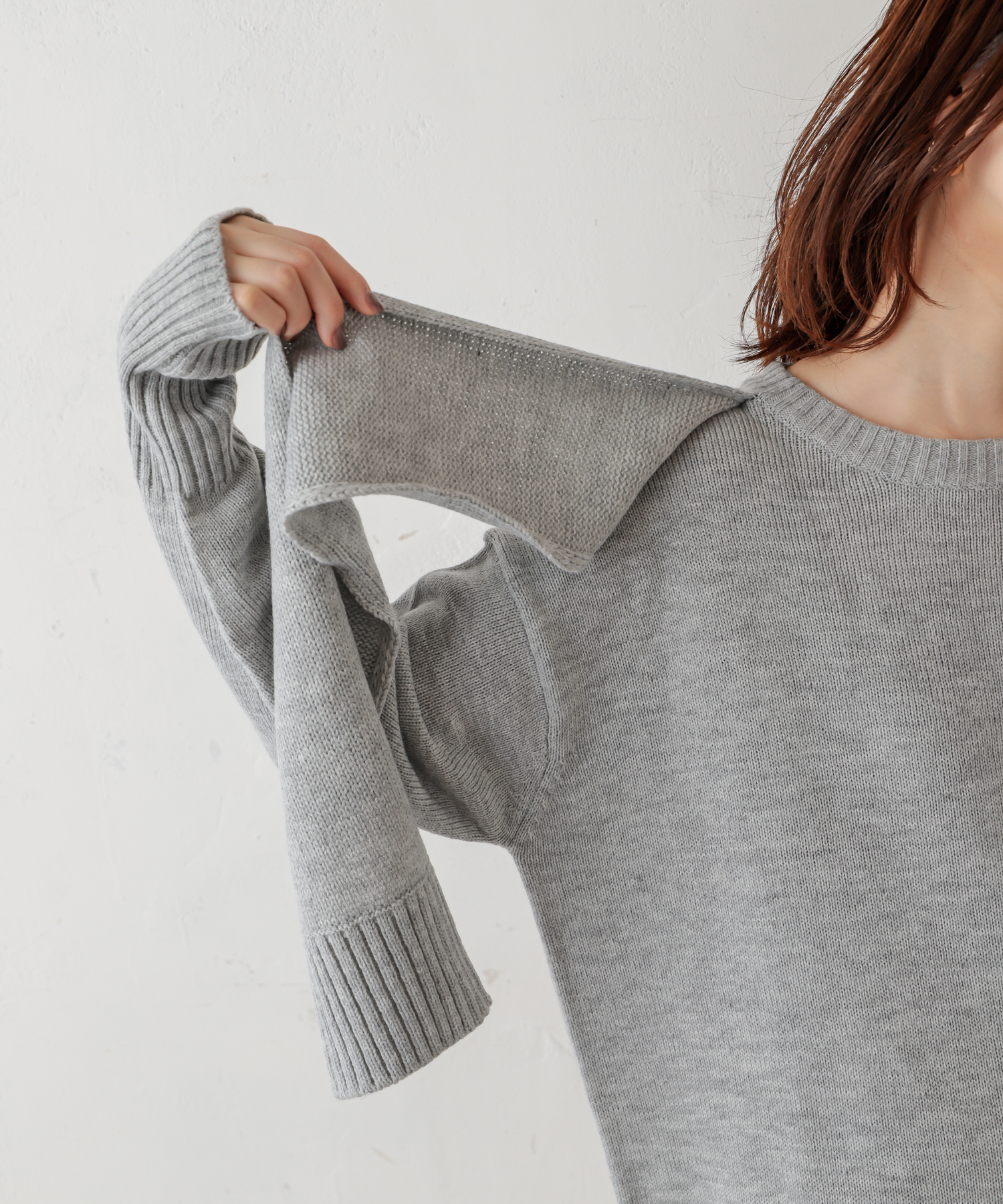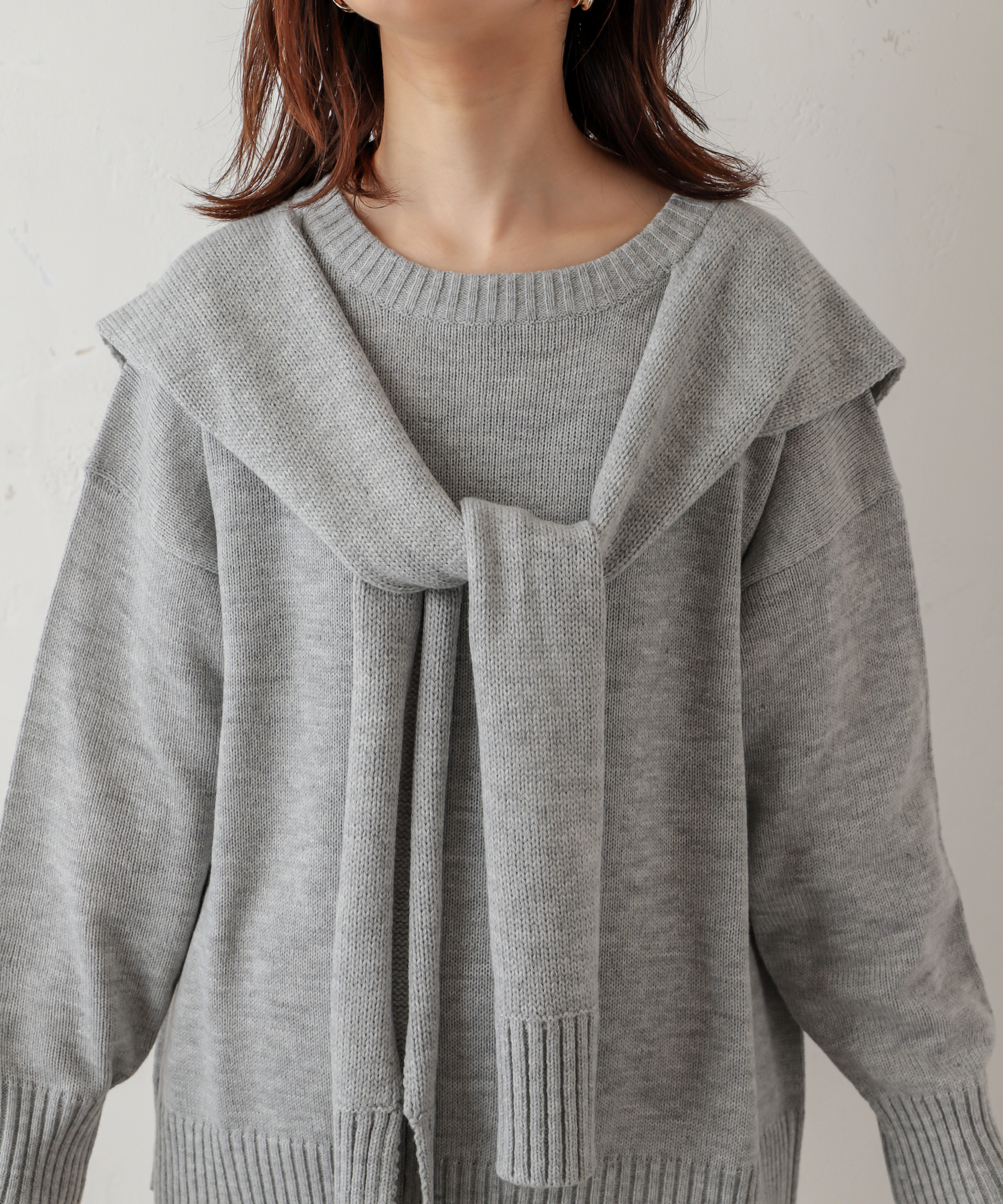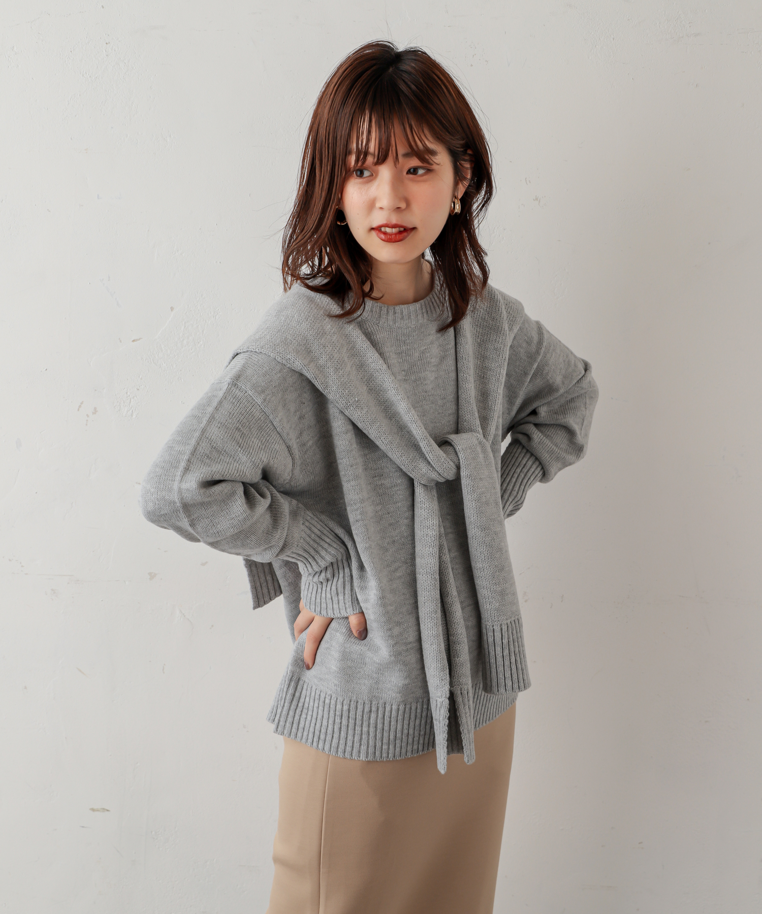 トレンド感のあるフロントむすびのデザインが魅力のニットプルオーバーの登場です。
