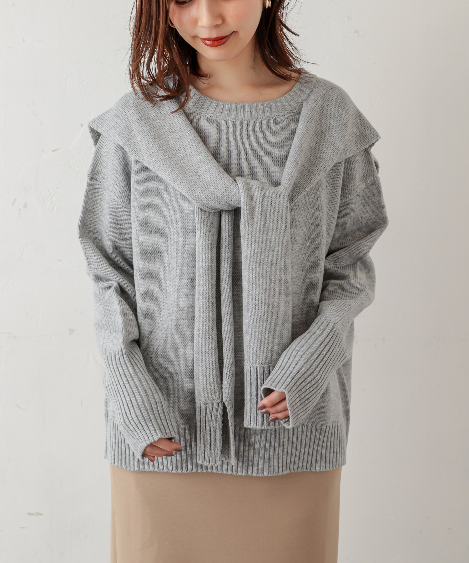 1枚で決まる◎フロントむすびレイヤード風ニットプルオーバー