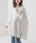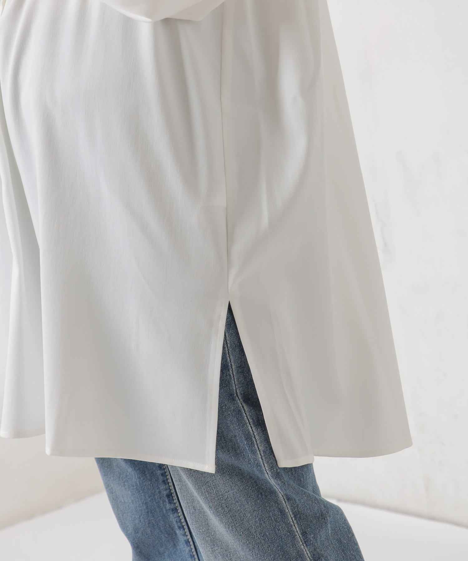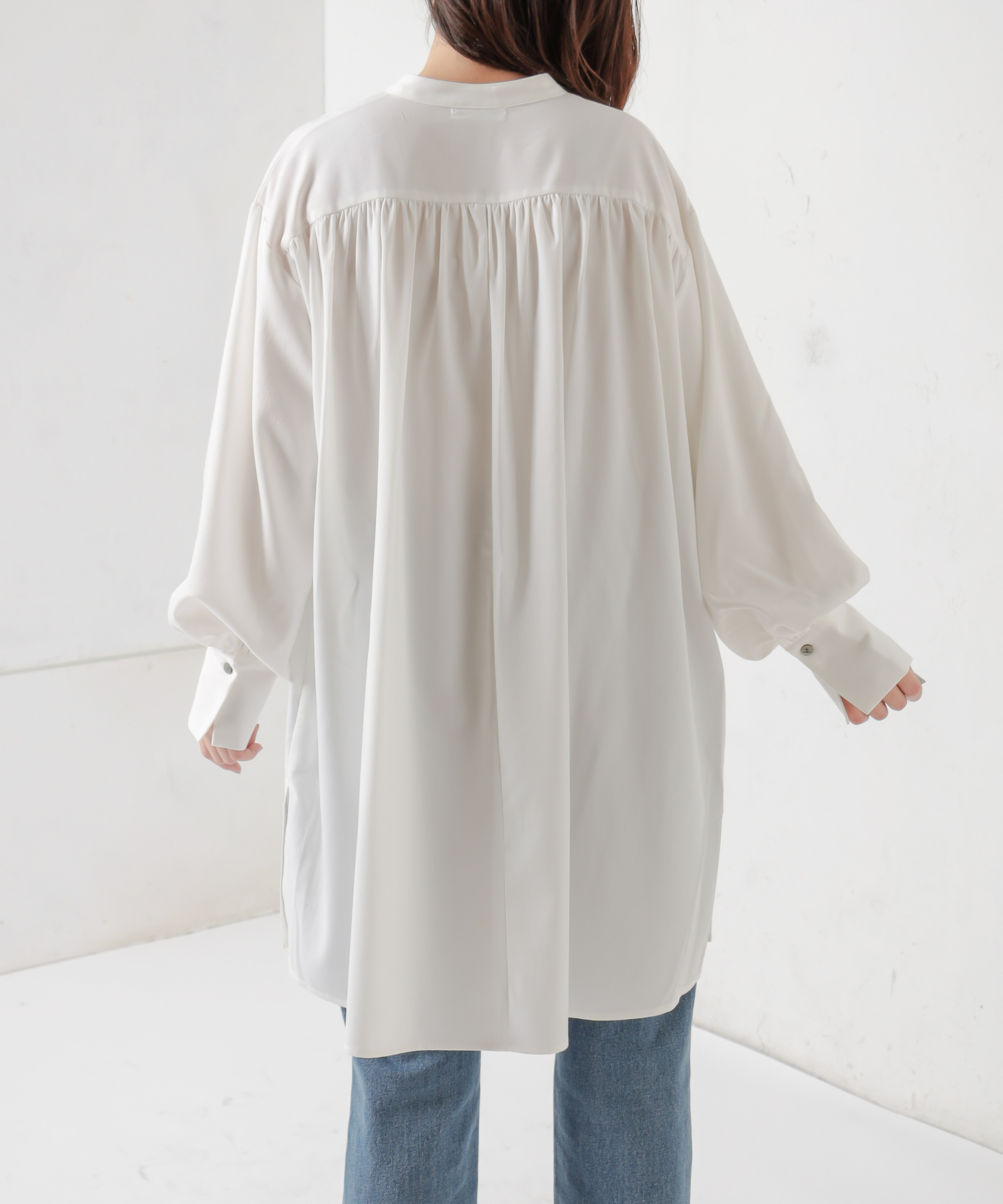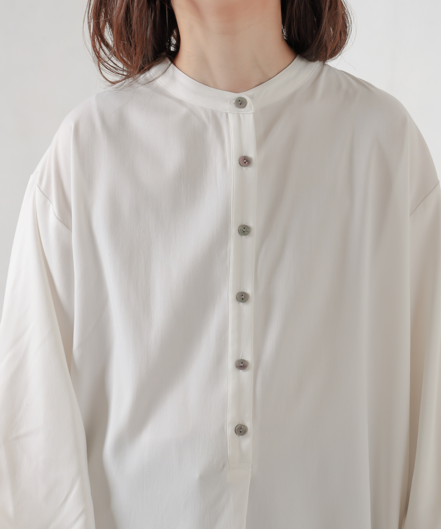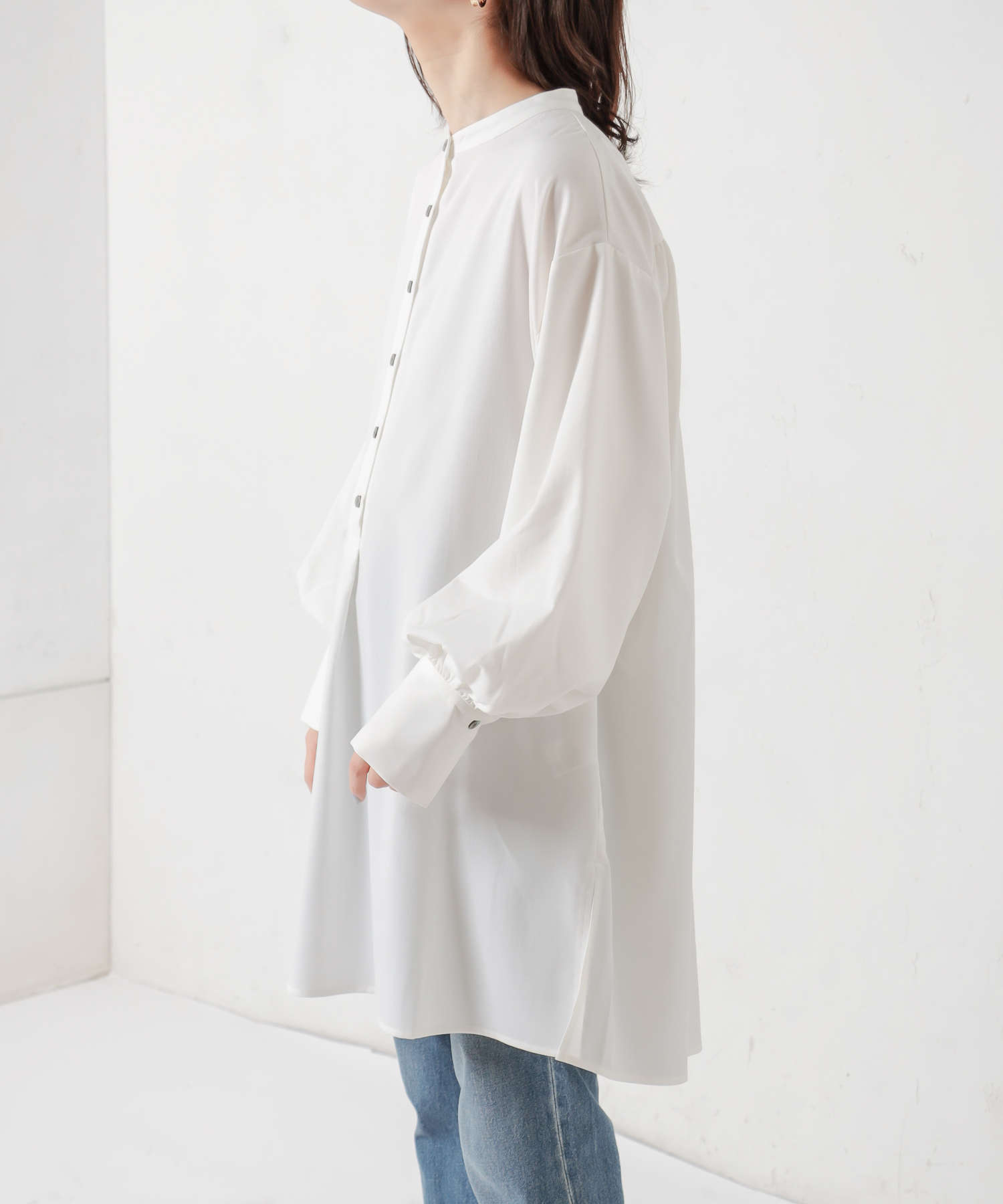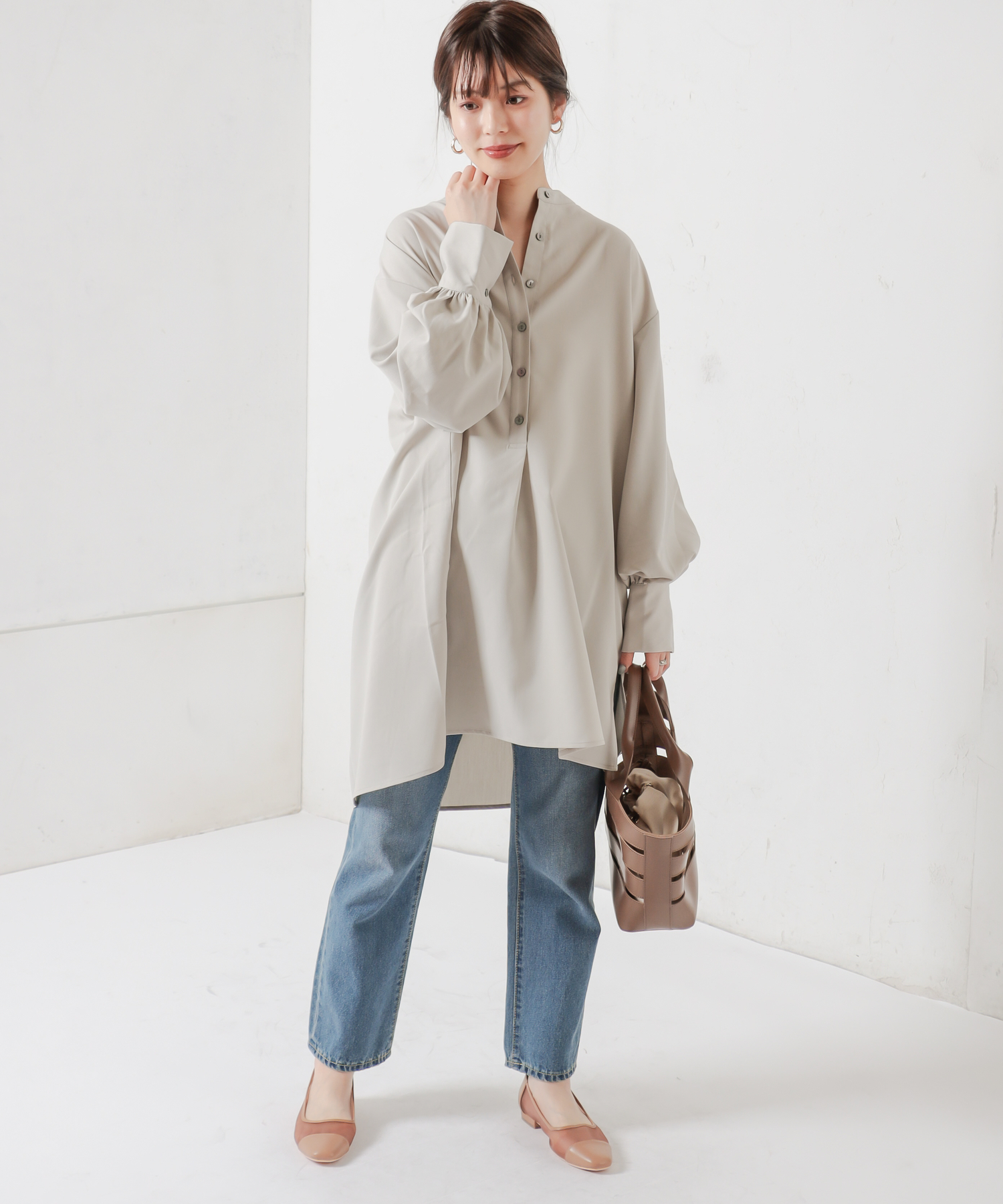 ほどよいバルーン袖と落ち感のある素材が上品みえ、大人が着たいバンドカラーシャツ