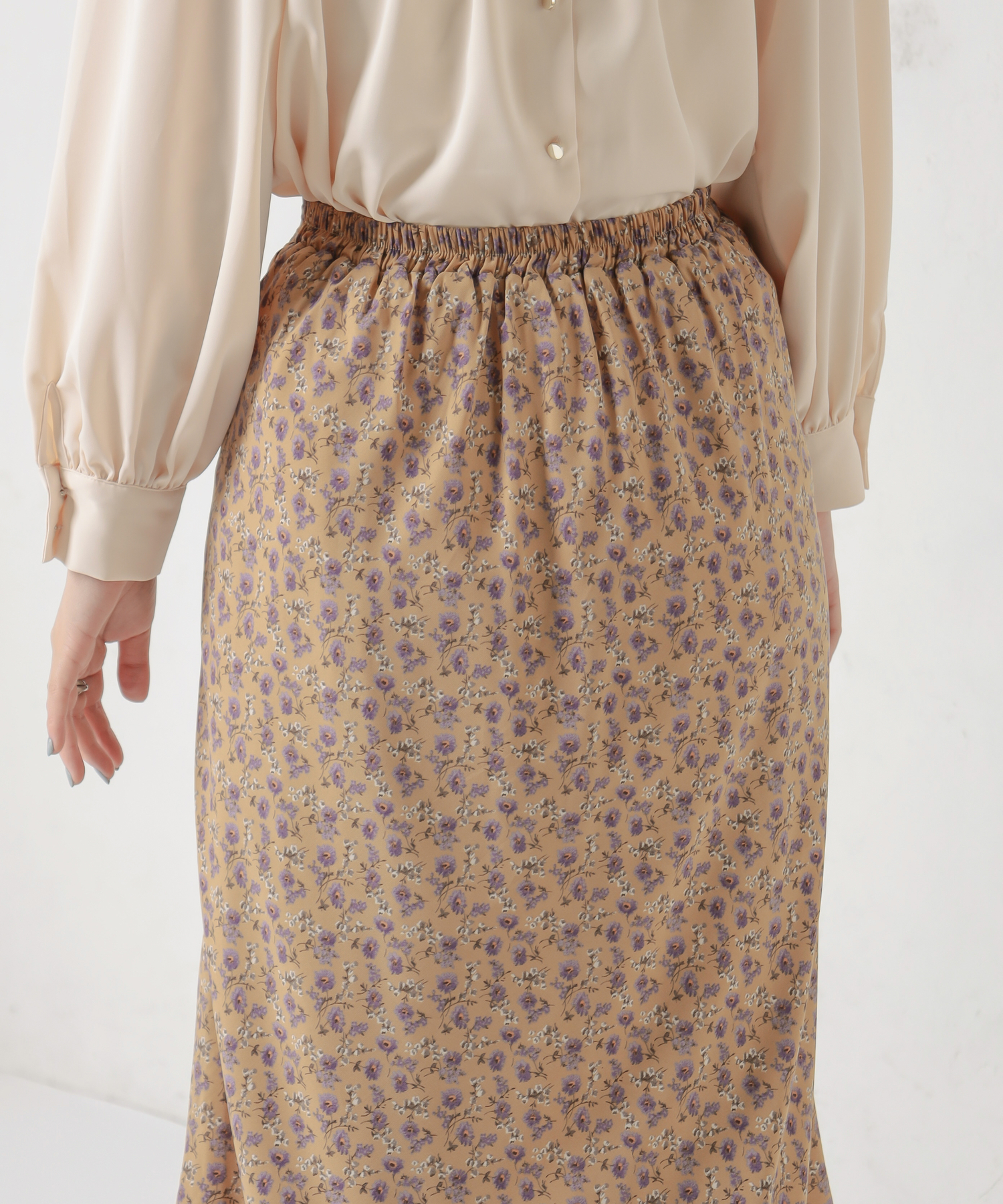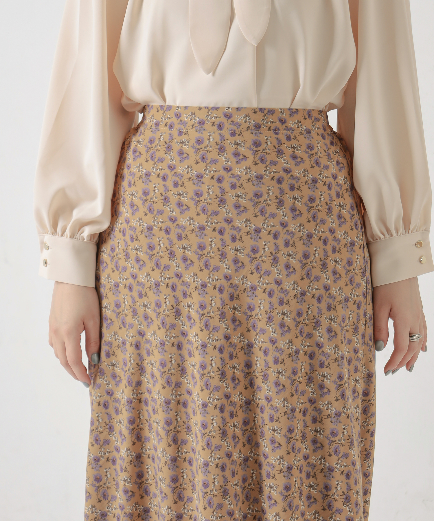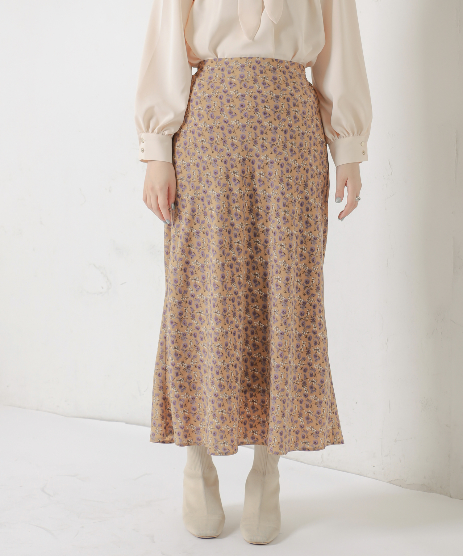 花柄はスタイリングのメインとなる華やかな印象のスカートなので、