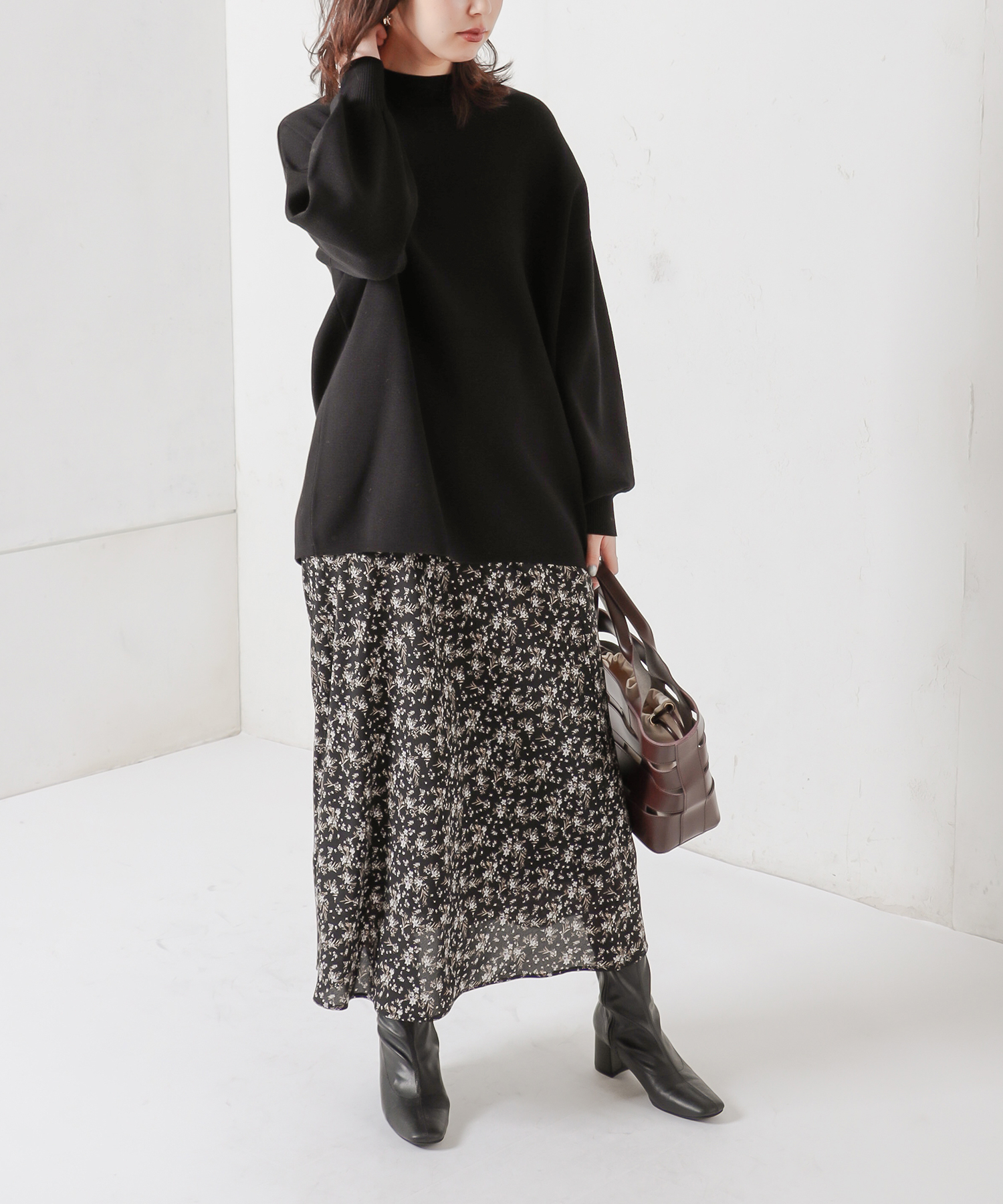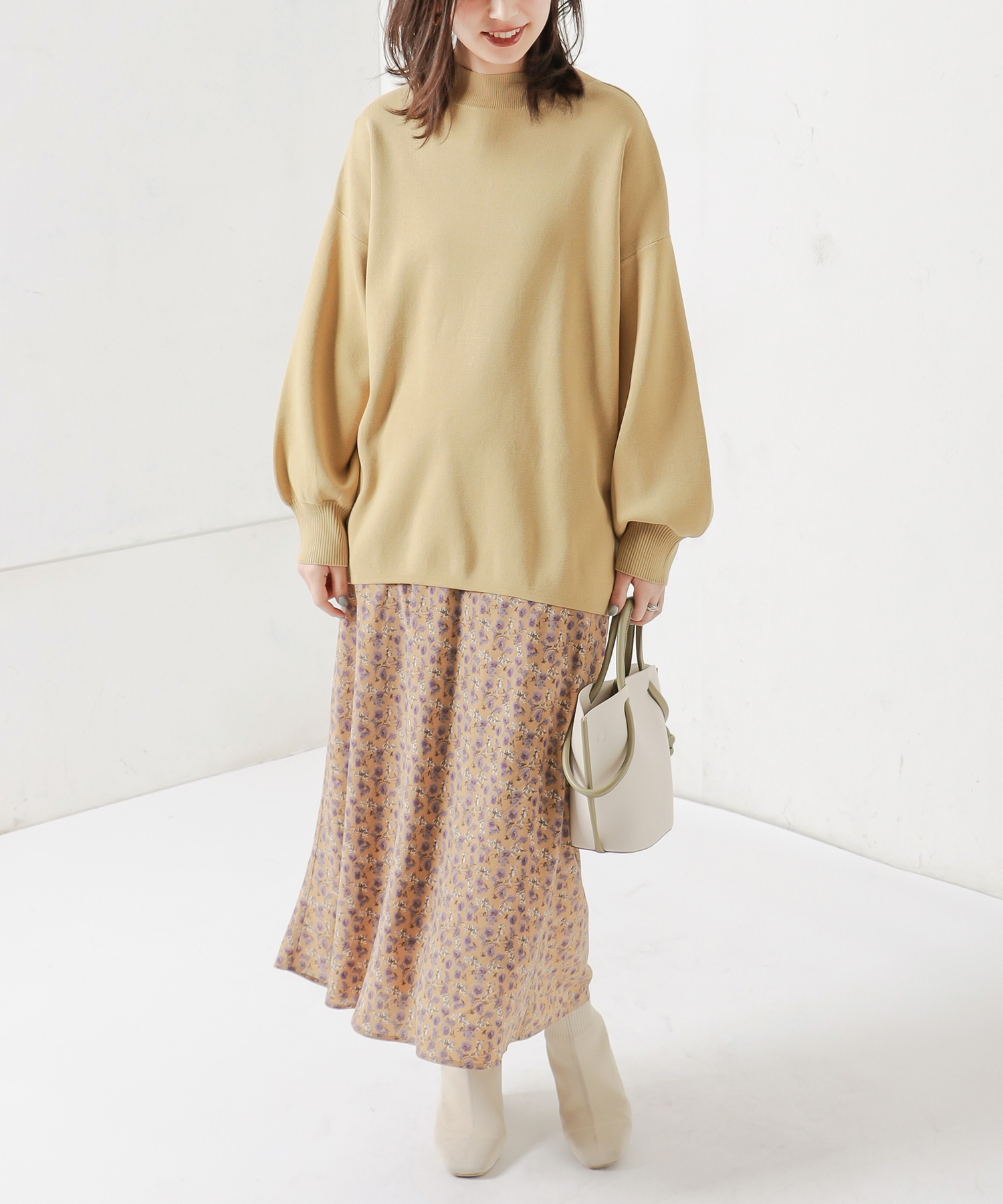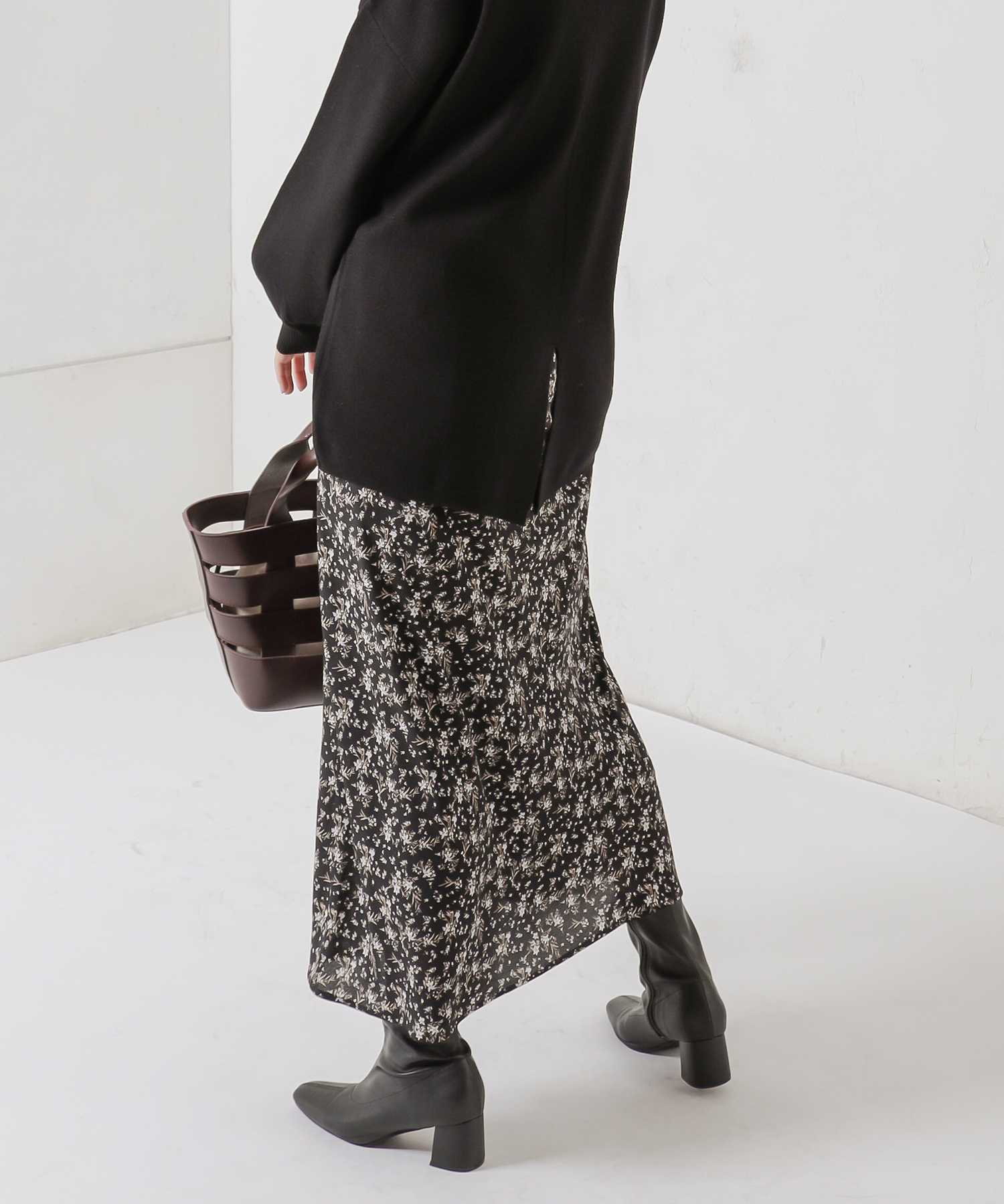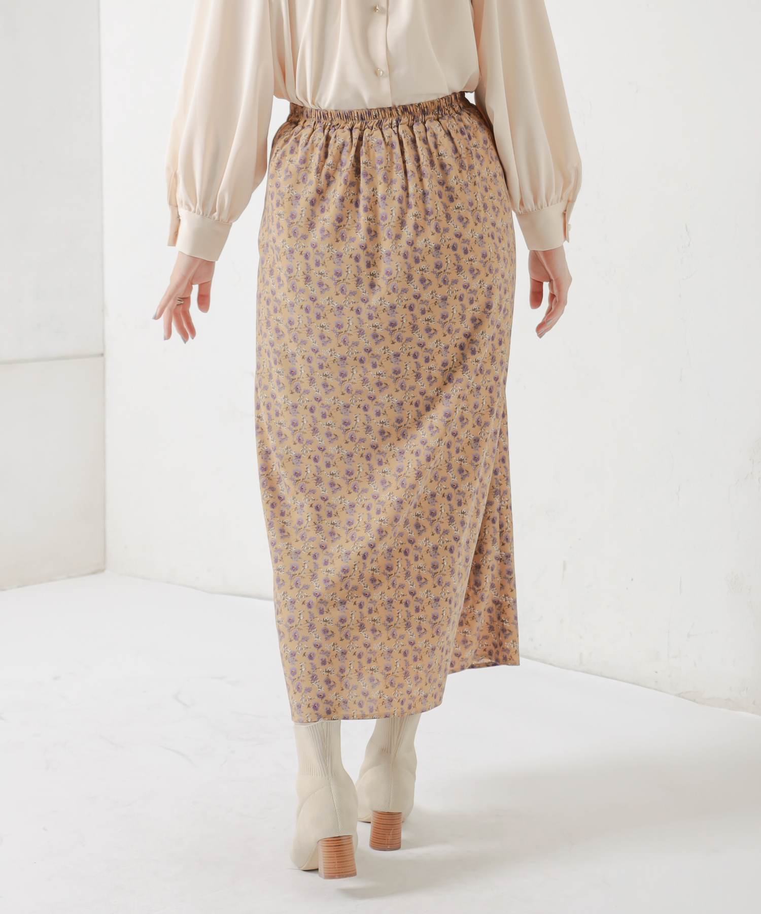 花柄はスタイリングのメインとなる華やかな印象のスカートなので、