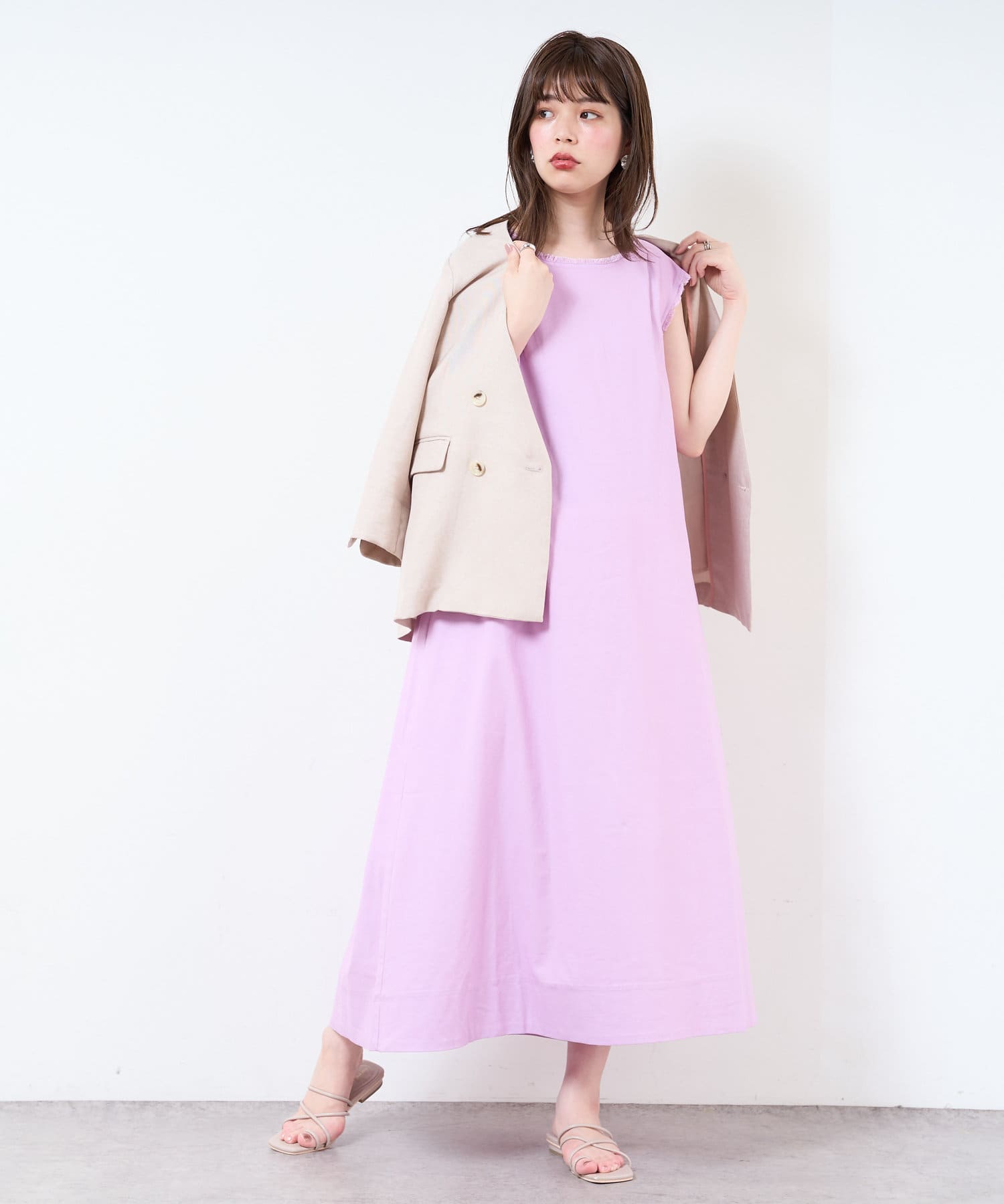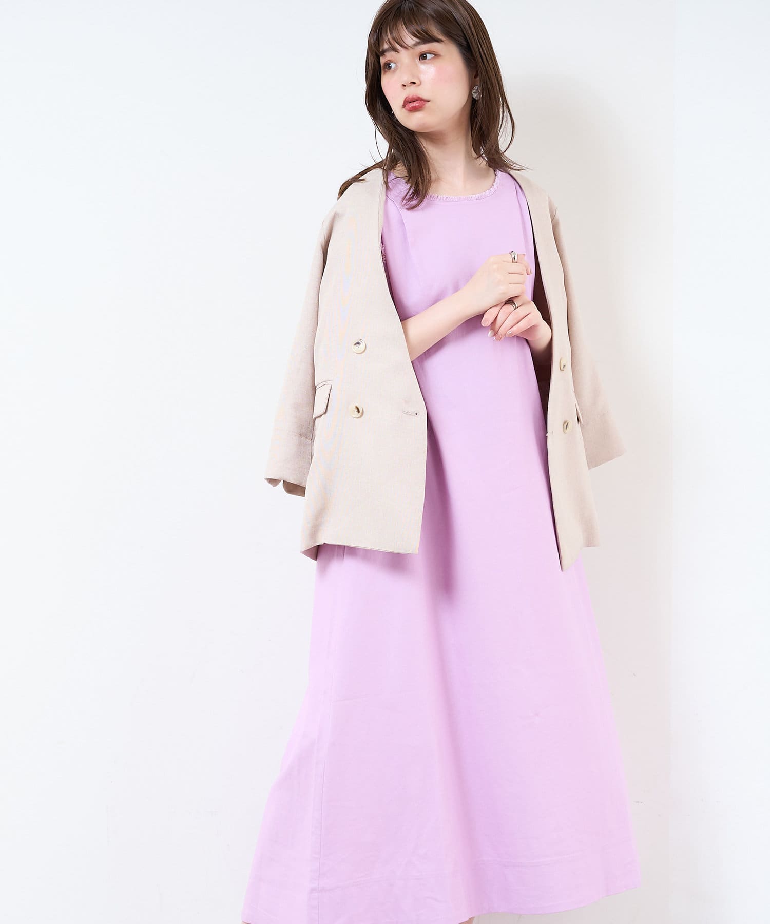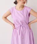 上品なパープルのワンピースです。幅広い年齢層の方に着ていただけます。