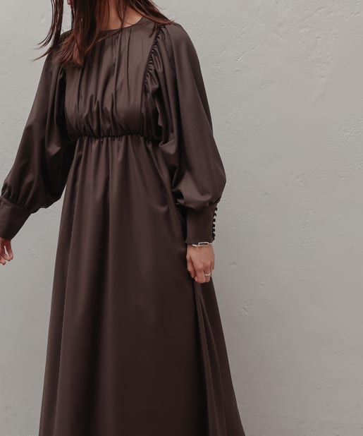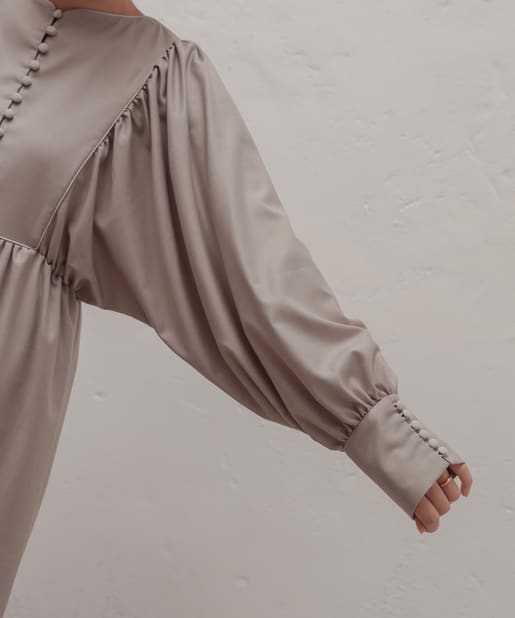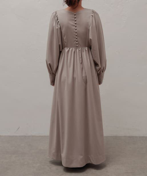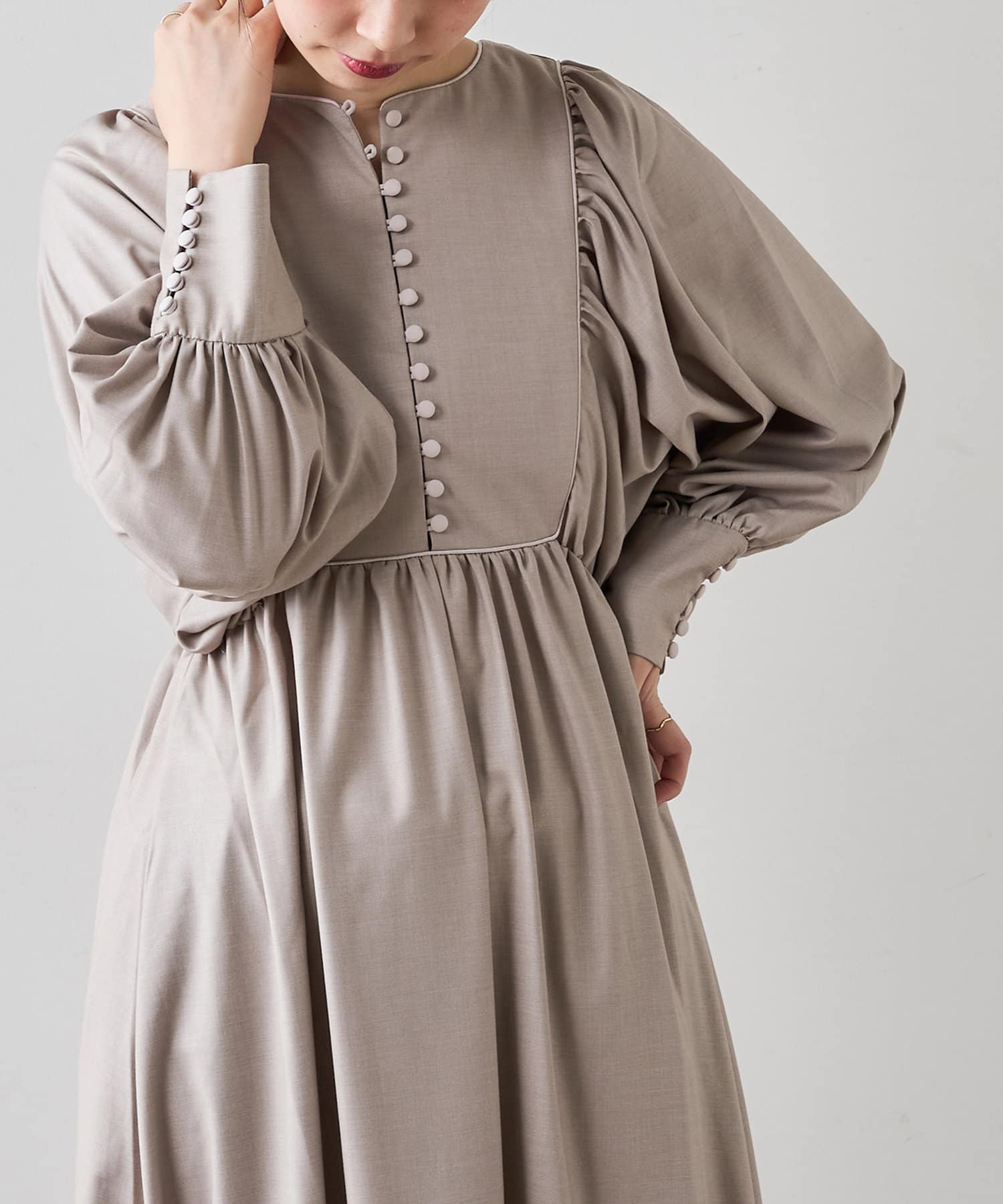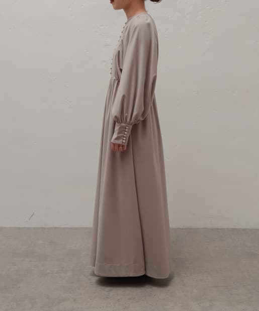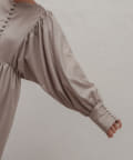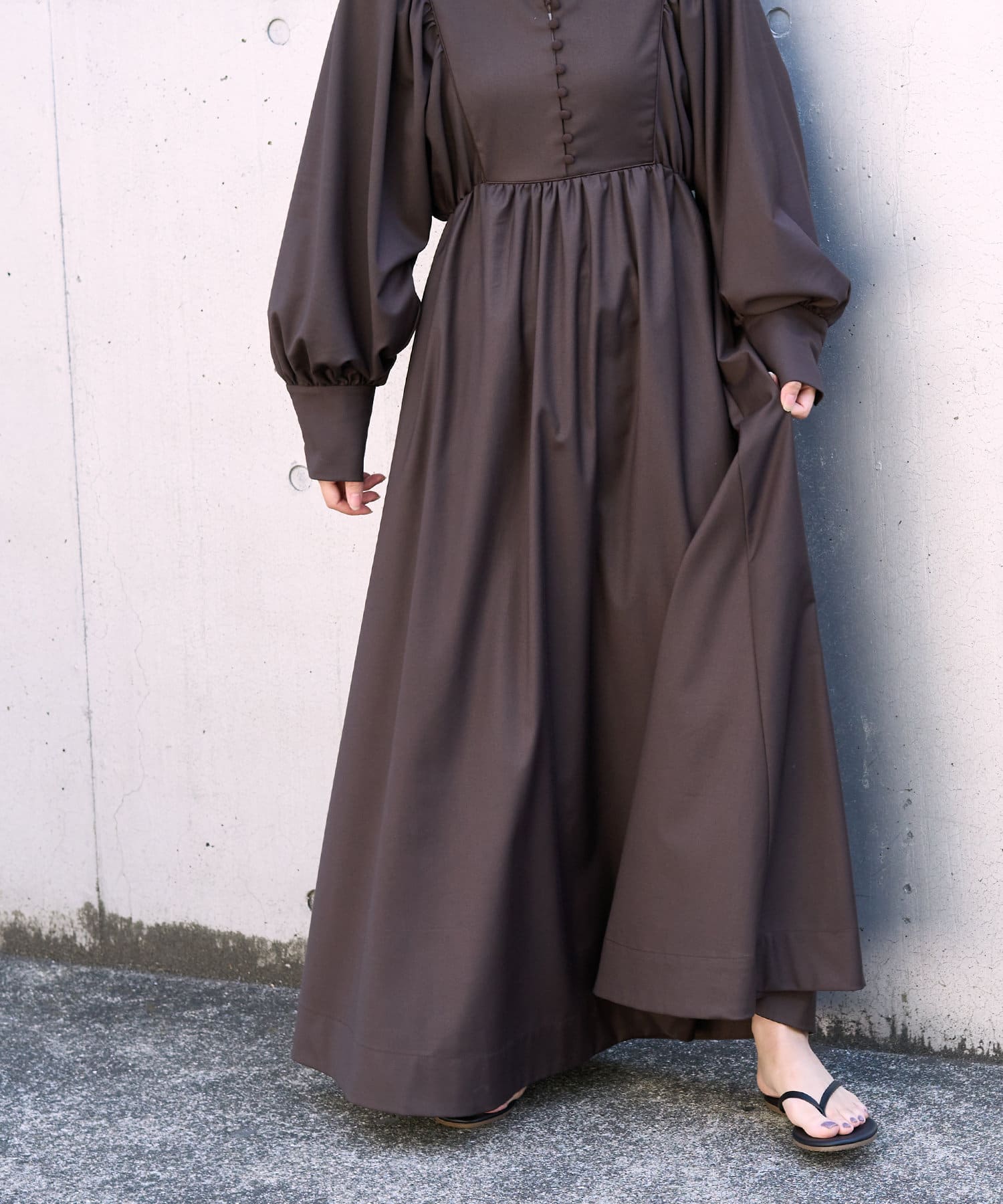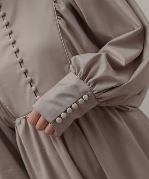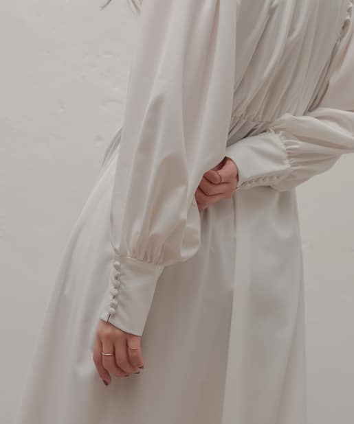 上品な印象のボリュームスリーブと、柔らかくハリのある生地感やくるみ釦を使用して甘くなりすぎない大人のキレイめを追求したデザイン。